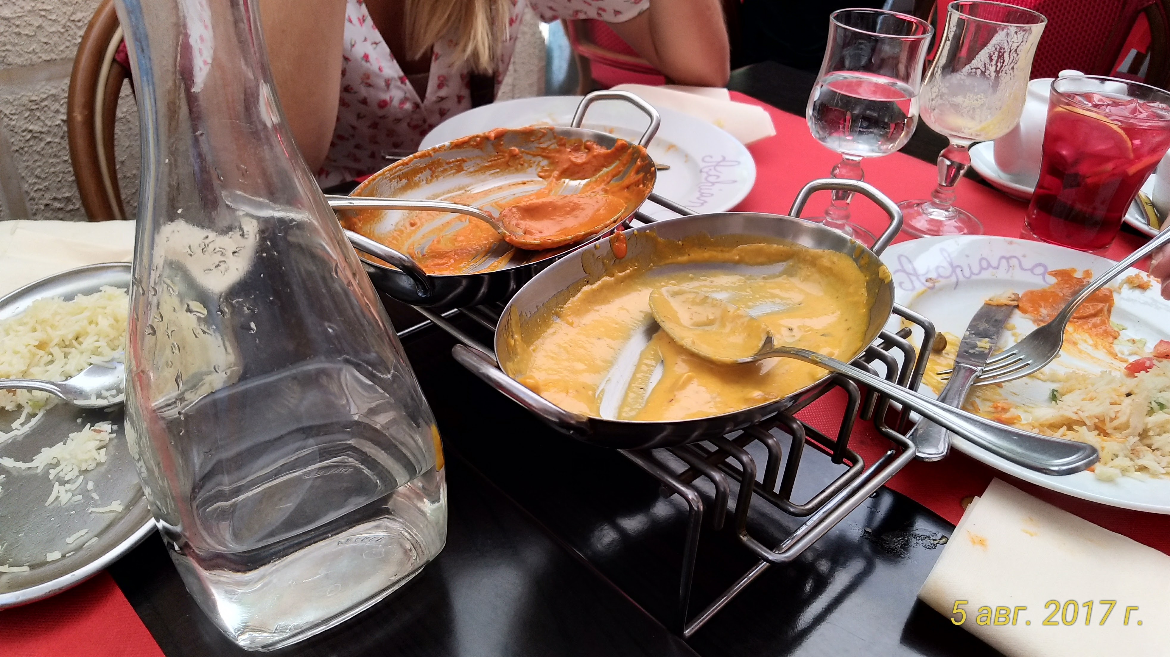 Magnifique! Poulet au curry, crewettes de Madras - bon goût. Aussi Kir Rosso - super aussi.