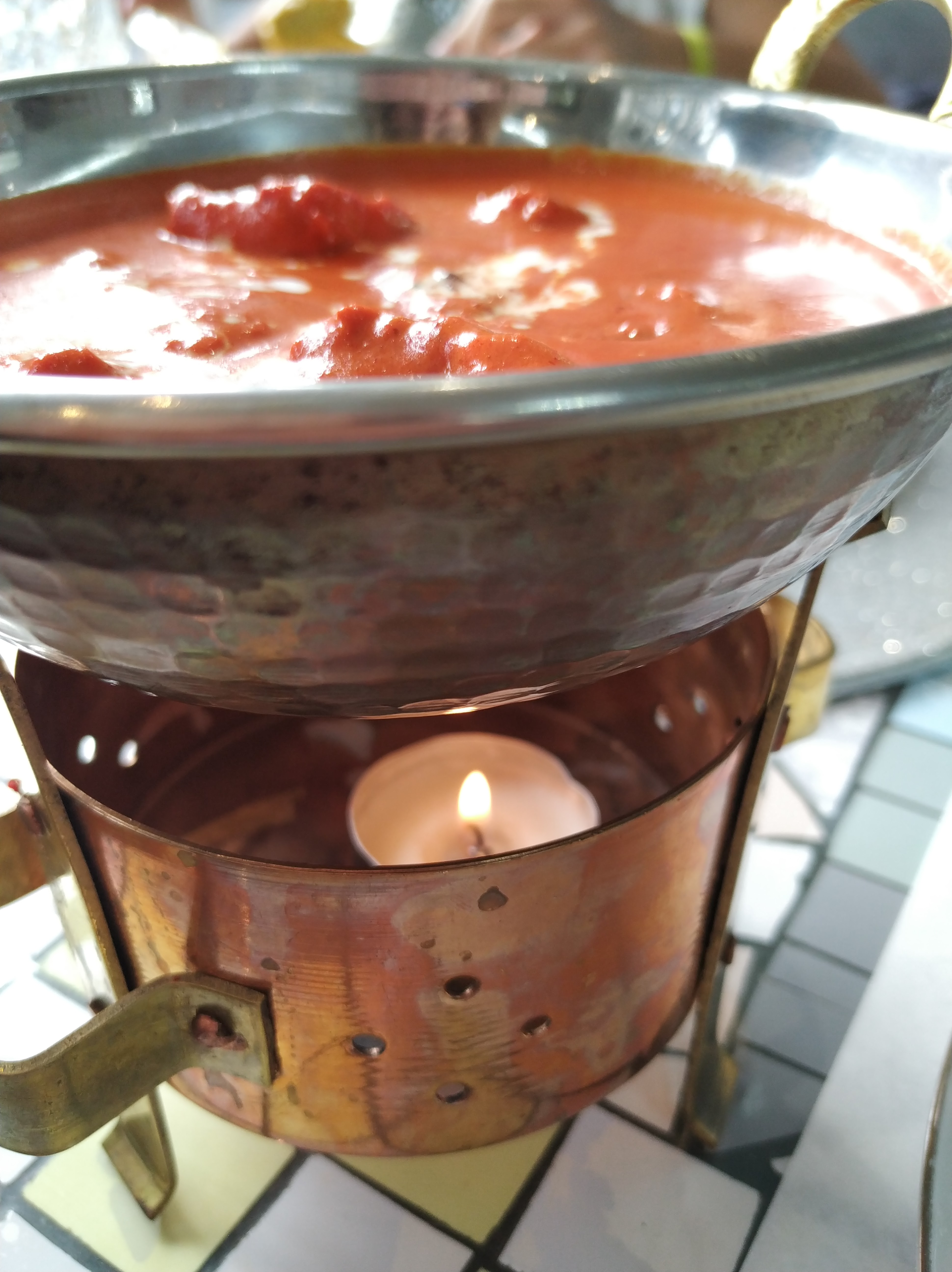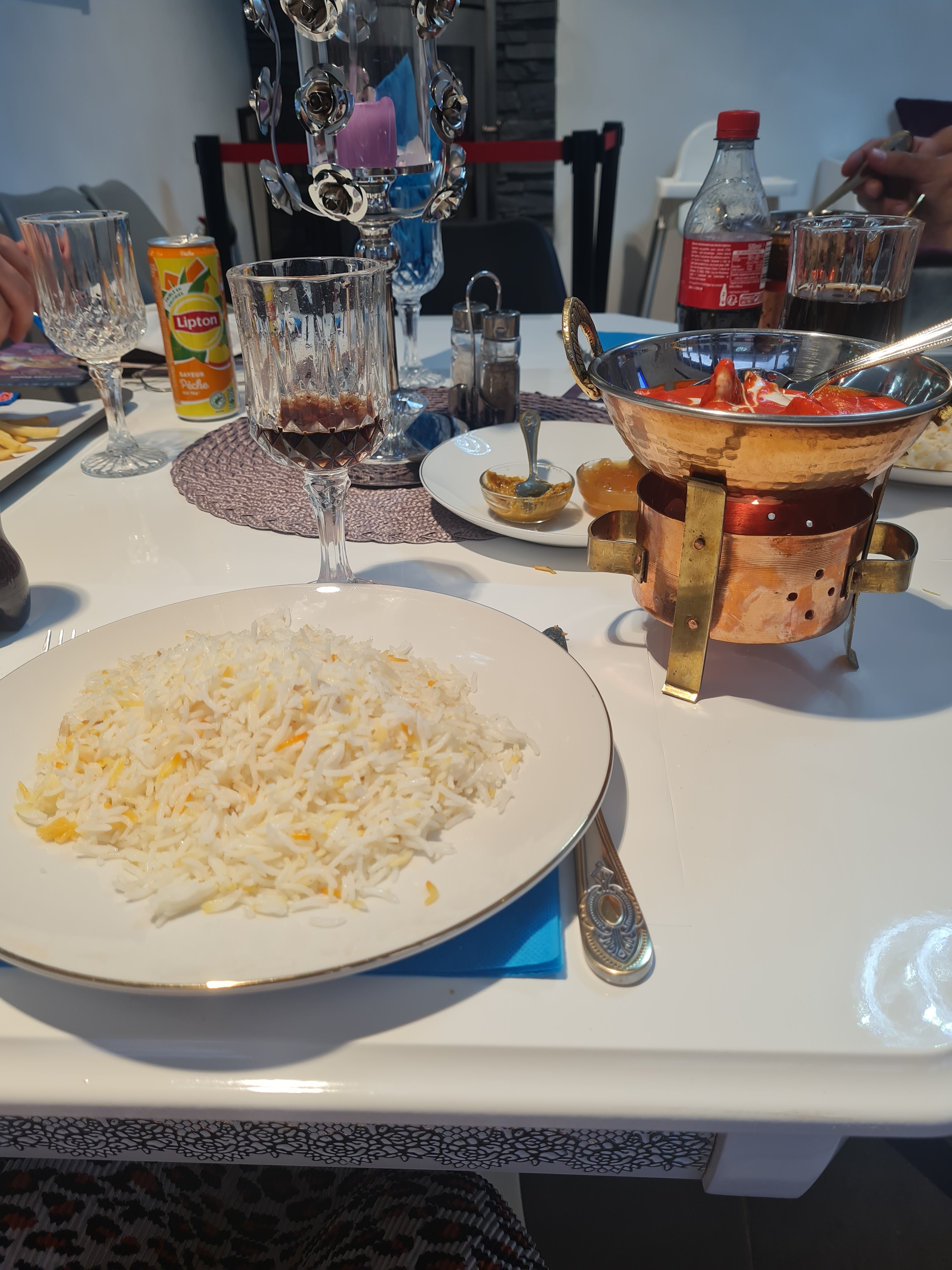 Repas avec une amie A priori plus restaurant à emporter que déjeuner sur place Néanmoins bel accueil (dans les règles qr code etc) salle spacieuse très propre et vraiment joliment décorée Carte minimaliste AUCUN alcool (plus de licence sur cet très ancien bar à mon avis) Repas long à etre servi MAIS copieux goûteux et joliment présenté dans ces réchauds bougies en cuivre on a pu patienter avec film Bollywood diffusé discrètement sur grand écran Serveur et patron (?) attentifs à notre confort Note correcte (bon aussi pas d’alcool 🥲) Personnellement je recommande à emporter ce qui m’a l’air d’être leur cœur de métier