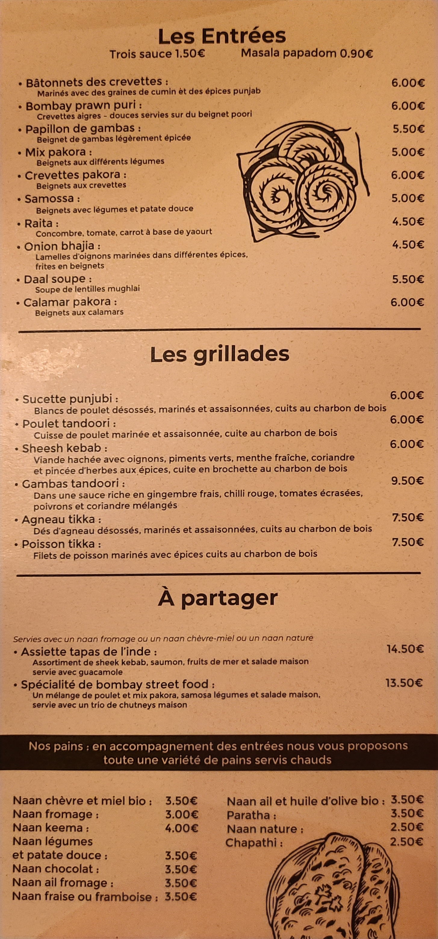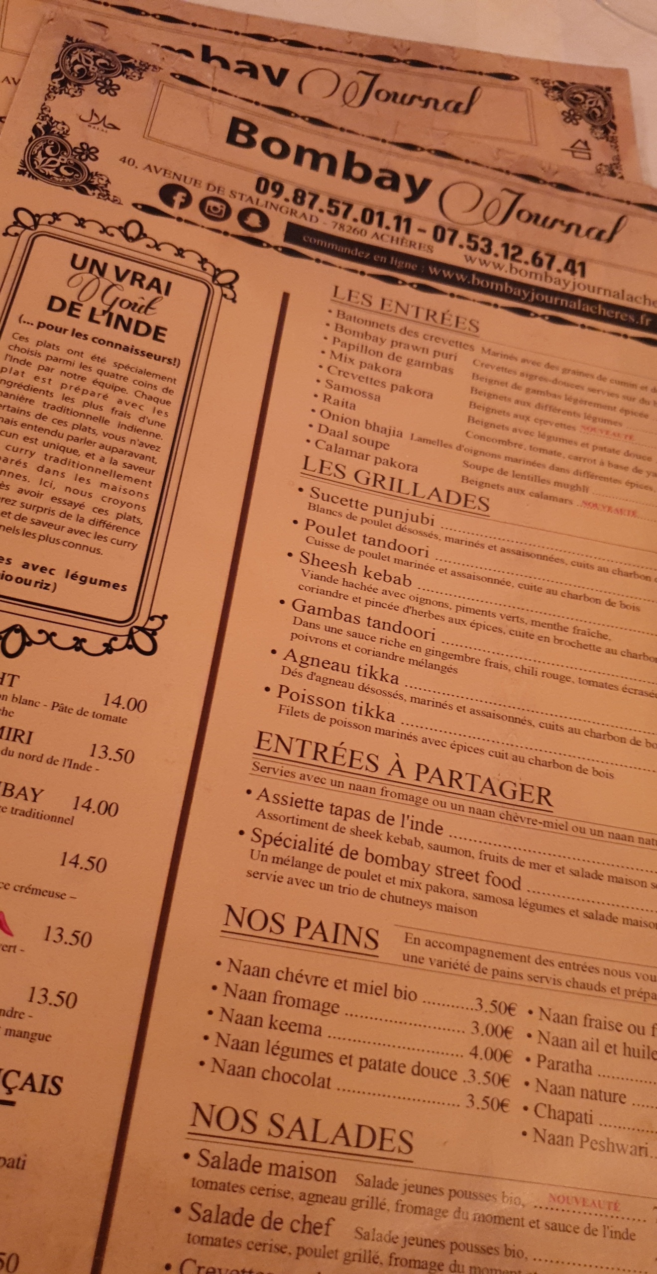 Bonjour Bombay Journal, Cuisine bonne mais attention aux quantités servie car c'est vraiment trop juste. Commandé Crevettes Korma et y avait 5 crevettes qui se battaient en duel ... Et attention a la cuisson des Nan. C est vos debuts donc on sera indulgent.