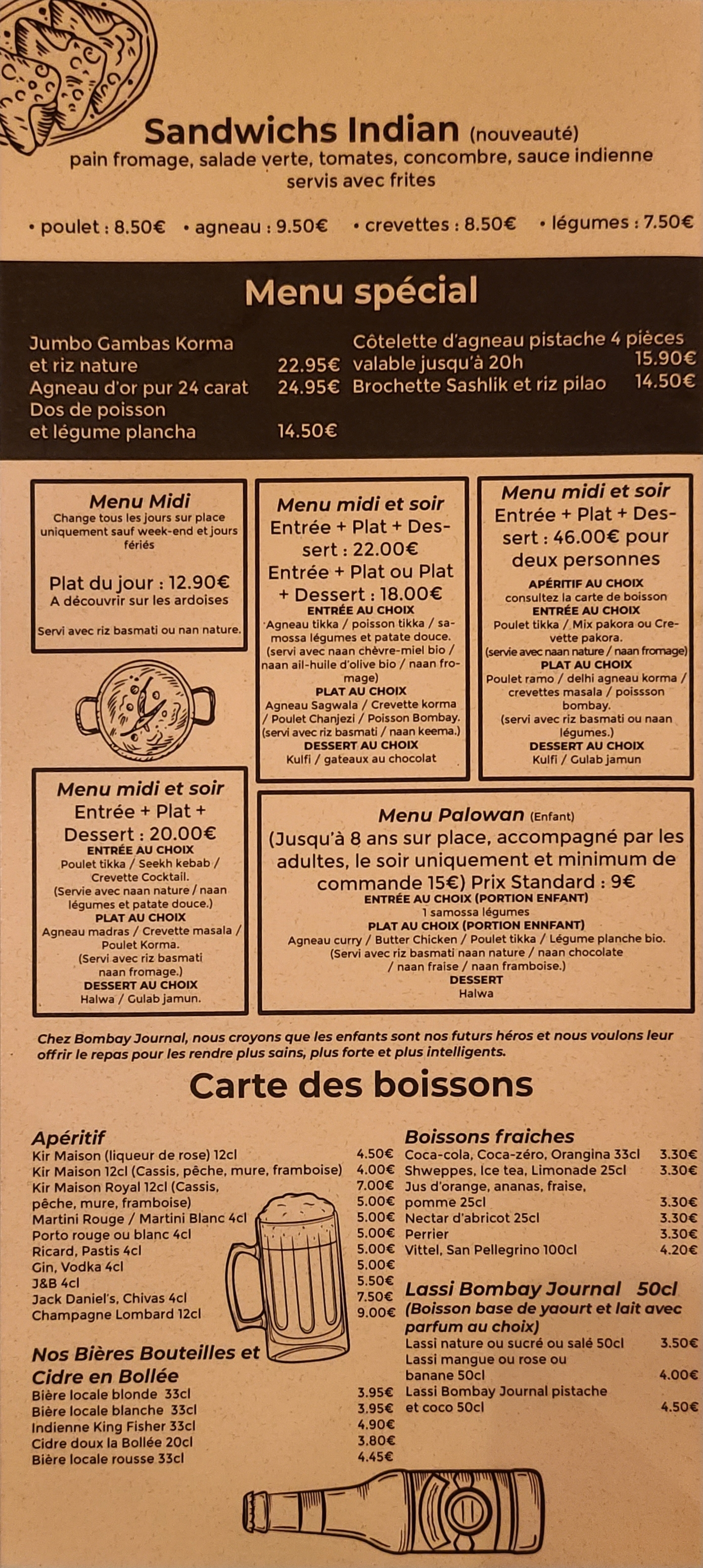 Nous avons dîner plusieurs fois chez Bombay Journal, la qualité ainsi que la quantité des plats est toujours au rendez-vous. Nous apprécions également l’accueil du gérant ainsi que du serveur, toujours disponibles et souriants envers la clientèle. Allez-y les yeux fermés, nous recommandons ce restaurant à 100%!
