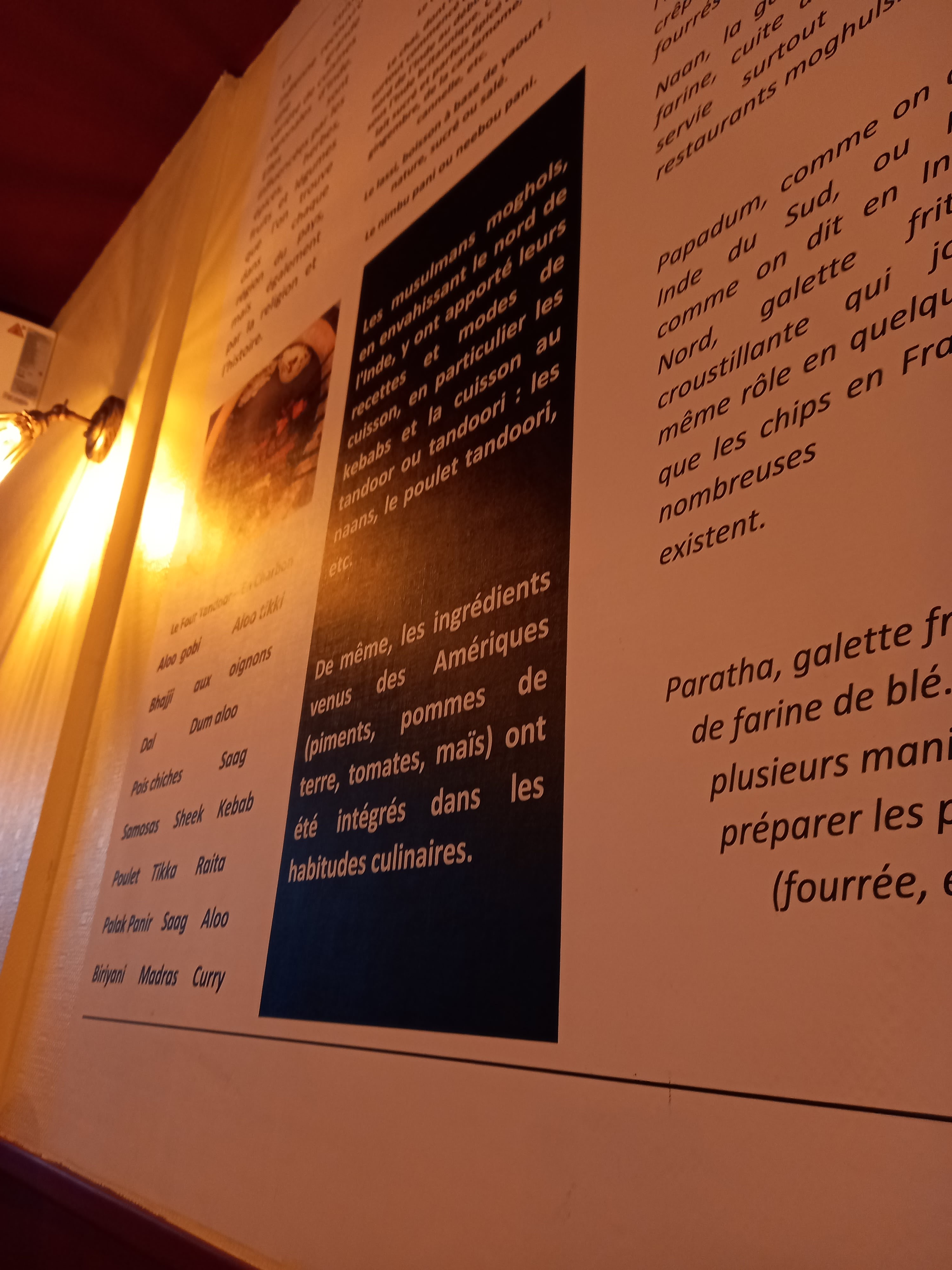 Sur le menu, il est indiqué que nous allions découvrir des Currys différents des restaurants indiens habituels, et nous n'avons pas été déçus : des hors d'œuvres travaillés, des plats parfumés sans pour autant brûler le palais, des trouvailles inattendues (mention spéciales pour le curry agneau au miel et vin Rouge ) Si on m'avait dit un jour que je serais agréablement surpris des le premier samossa, je ne l'aurai jamais crû... Je recommande vivement, le service est de qualité, et le patron très avenant, et attentionné. Essayez leur plats originaux, ça vaut le détour. Oh, et la déco n'est pas en reste, pour ne pas gâcher.