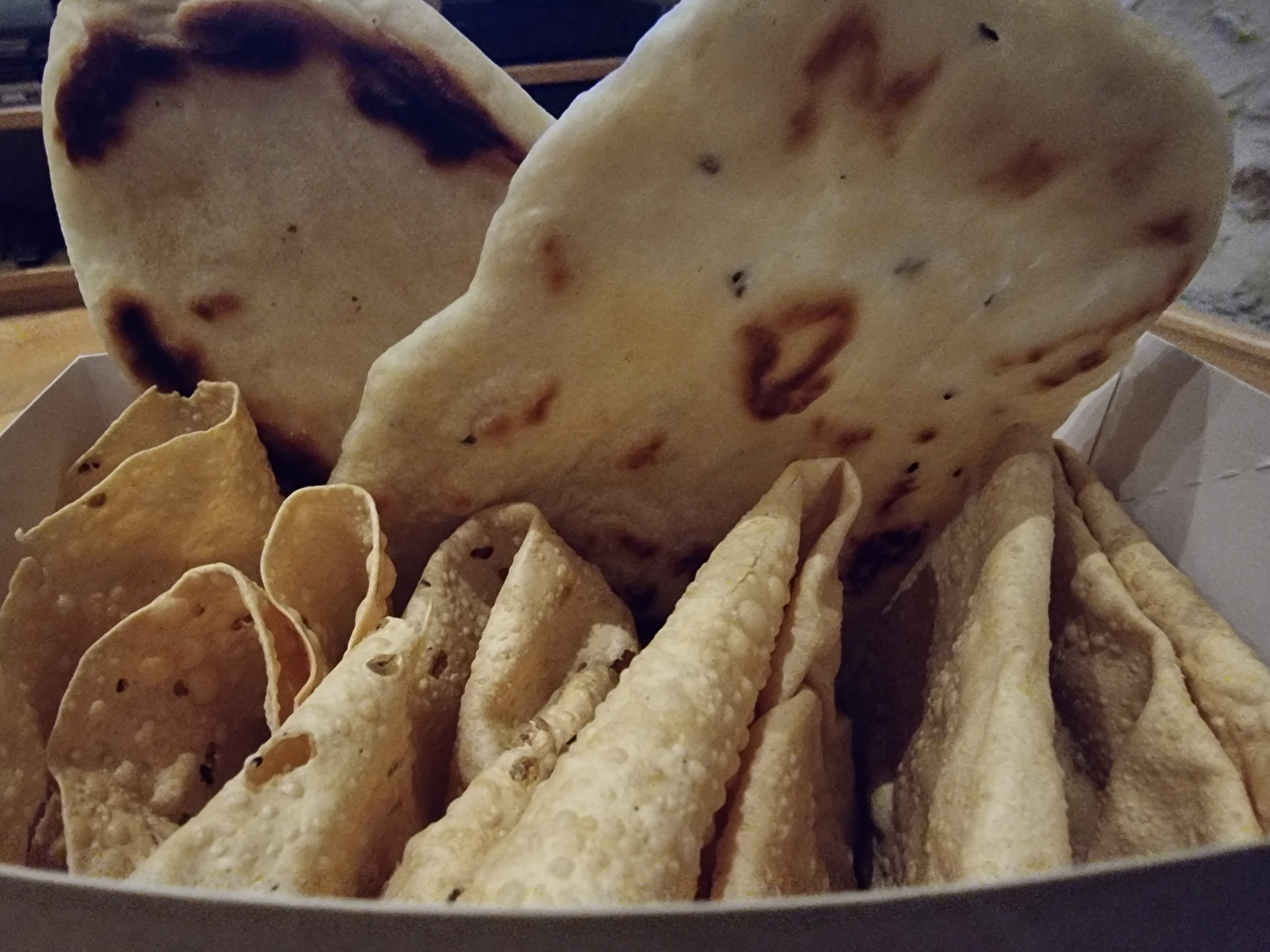Nous avons commandé ce soir. C'était délicieux! De belles saveurs nous avons adoré. Nous conservons le numéro de téléphone et commanderons à nouveau plusieurs fois. J'ai seulement pris des photos du papadum et du naan (j'ai oublié de me reposer pendant que nous appréciions la nourriture).