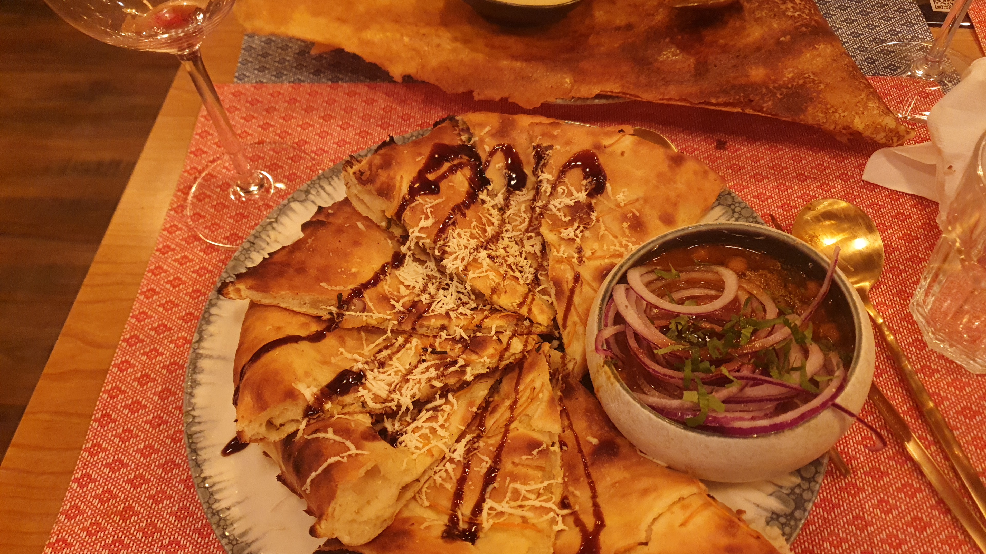Alerte coup de cœur ! Si vous en avez marre des cartes des restaurants indiens qui se ressemblent toutes, passez la porte de ce petit bistro qui d'extérieur ne paie pas de mine, vous ne serez vraiment pas déçus. La carte réduite qui change chaque semaine (mais qui laisse tout de même un VRAI choix aux végétariens) nous fait voyager aux quatre coins de l'Inde et découvrir les spécificités de chacune de ses régions. La petite description du chef pour chaque plat invite déjà au voyage ! Au moment de la dégustation c'est l'explosion de saveurs. Des épices, des herbes, des chutneys,...du goût ! Tout est savamment dosé. Pas surpris d'apprendre que le chef est passé par l'institut Paul Bocuse après avoir traversé son Inde d'origine dans tous les sens. On obtient alors le combo parfait : le goût puisé à travers le voyage complété par la technique d'une formation renommée. Une vraie pépite qui vaut le détour ! Les portions sont généreuses, heureusement que le doggy bag nous a été très gentiment proposé. Tout est à la carte le soir mais les prix sont plus que raisonnables. Last but not least : le service est top! (Ne vous fiez pas à mes photos prises un peu dans l'obscurité)