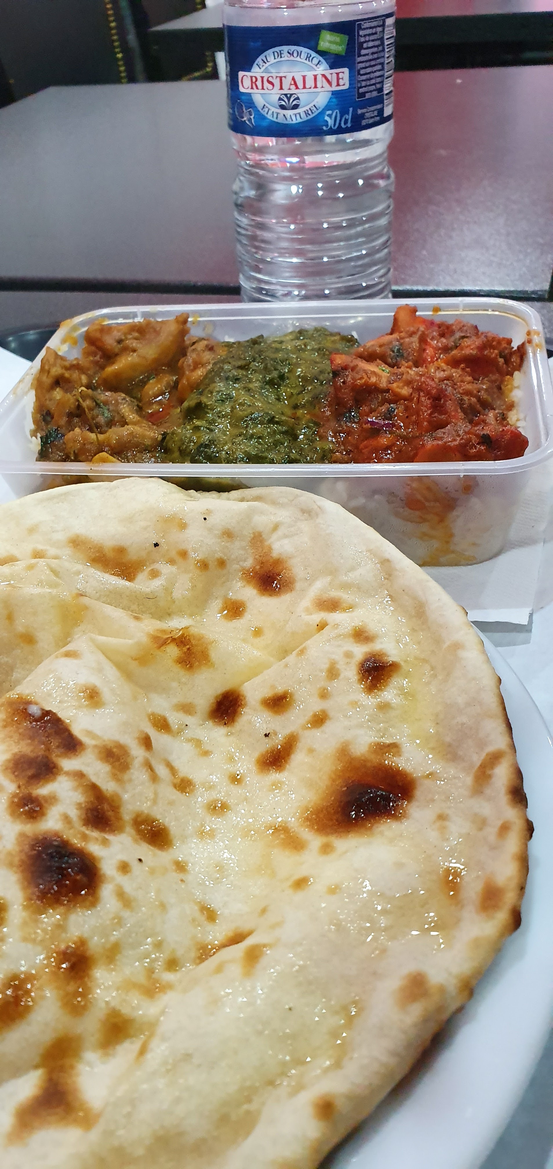 la sauce était bonne mais le poulet avait un arrière goût très désagréable, le riz était passable… mais les naan était très sec on dirait des galettes de wrap trop cuit