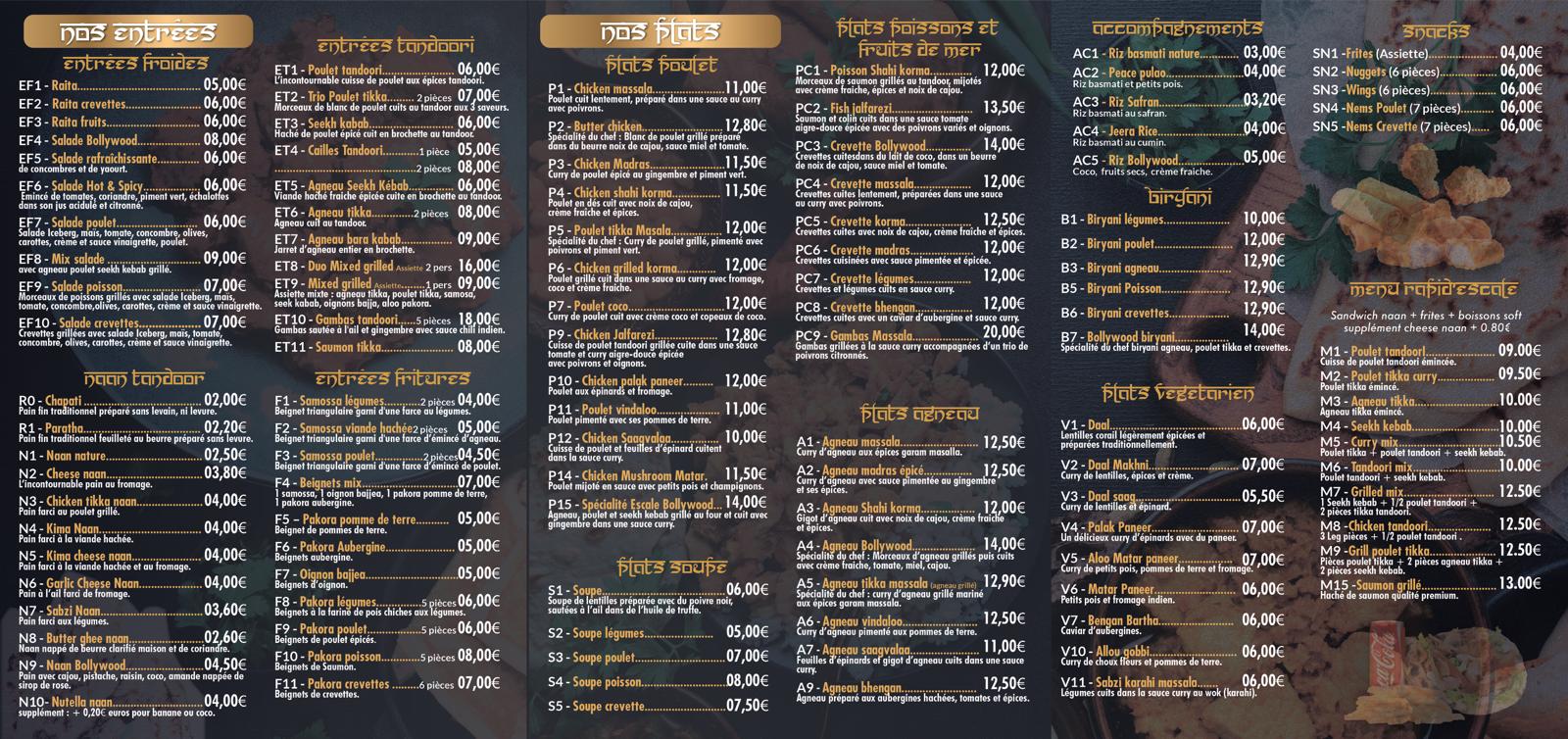 C'est ma 1 ère fois à l'escale bollywood et franchement vous pouvez y allez les yeux fermés, c'est excellent, variés, à prix abordable. Le menu du midi est à 17€ et 20€ le soir ,il y a d'autre choix de menus. Le menu enfant est à 6,5€ et 10€ et très complet la cuisine est raffiné et très goûteuse, le service est rapide et attentionné au client ,je recommande vivement ce restaurant, les étoiles 🌟 🌟 sont mérité