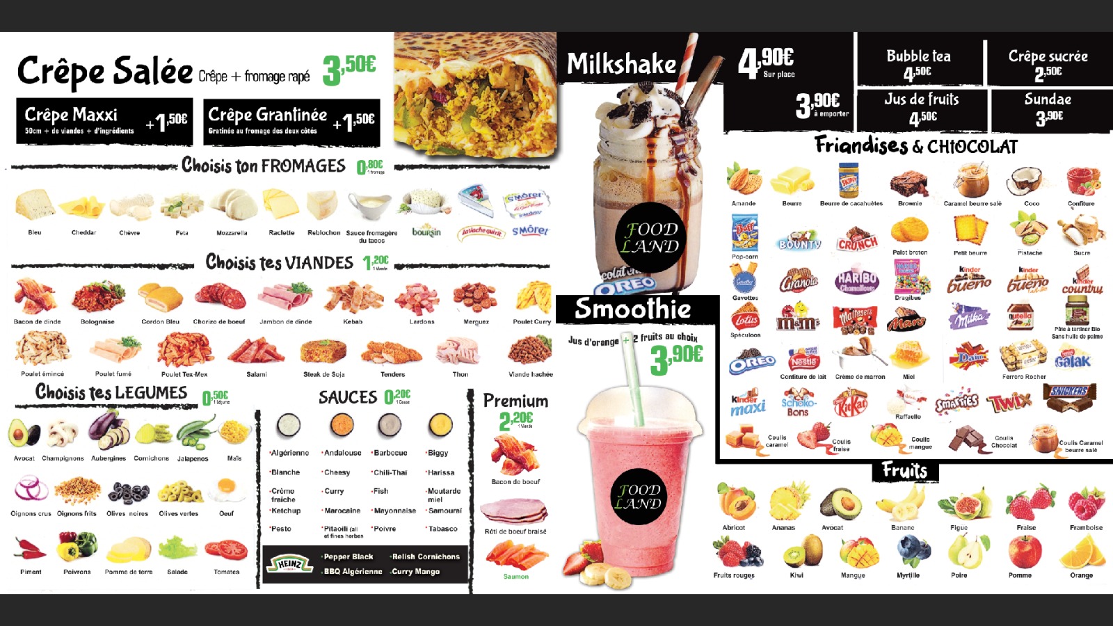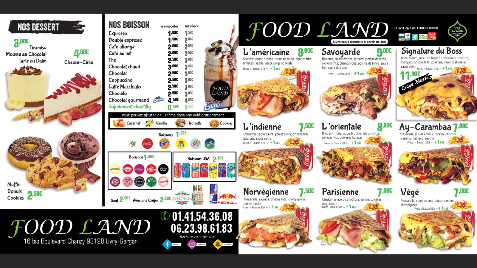 Je déconseille de commander dans ce restaurant sandwich sans goût, j'ai demander de la sauce n'en ai pas eu, une sois disant promotion 1 naan acheté 1 naan offert j'en ai acheté 2 pour la promotion et en ai reçu 2, des frites racis d'au moins 3 jours, ce restaurant profite du fait que vous ne soyez pas là pour vous escroquer avec de la nourriture avariée N'ACHETER RIEN CHEZ FOOD LAND je vous garanti une intoxication alimentaire
