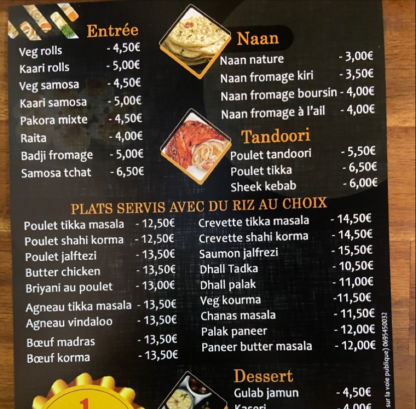 Déçu je ne comprends pas les avis précédent… Nous sommes peut-être tombés le mauvais jour… J’ai commandé un lassi mangue (40 cl sur la carte) j’ai reçu un verre normal (20cl) 😶 J’ai pris un poulet shaki korma. la sauce et le poulet était froide. Nous avons tous du demander de réchauffer les assiettes. La sauce shaki korma ne contenait aucune amande au noix cajou. Il s’agissait plus d’une soupe que d’une sauce. Dommage car j’ai aussi pris un cheese naan et il n’était pas mauvais. Attention les assiettes arrivent avec un supplément sauce sur les côtés ça peut tacher certains vêtements. Je suis sincèrement déçu en l’état je ne recommande pas.
