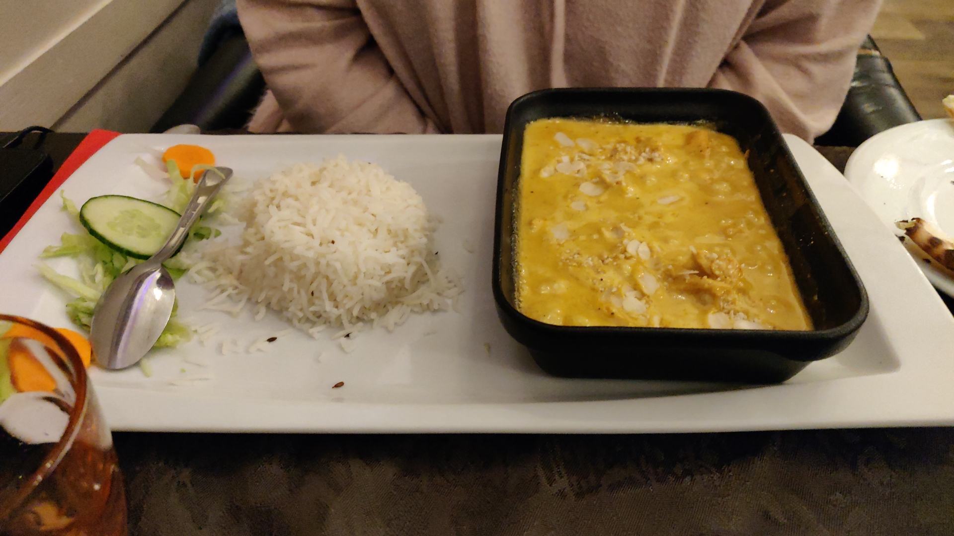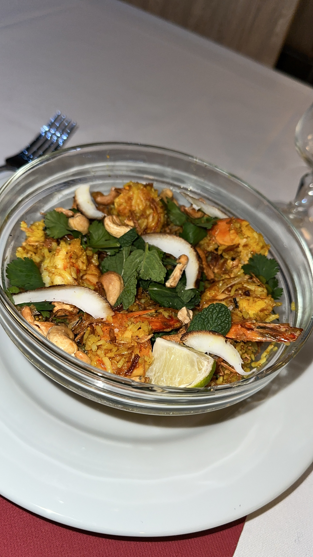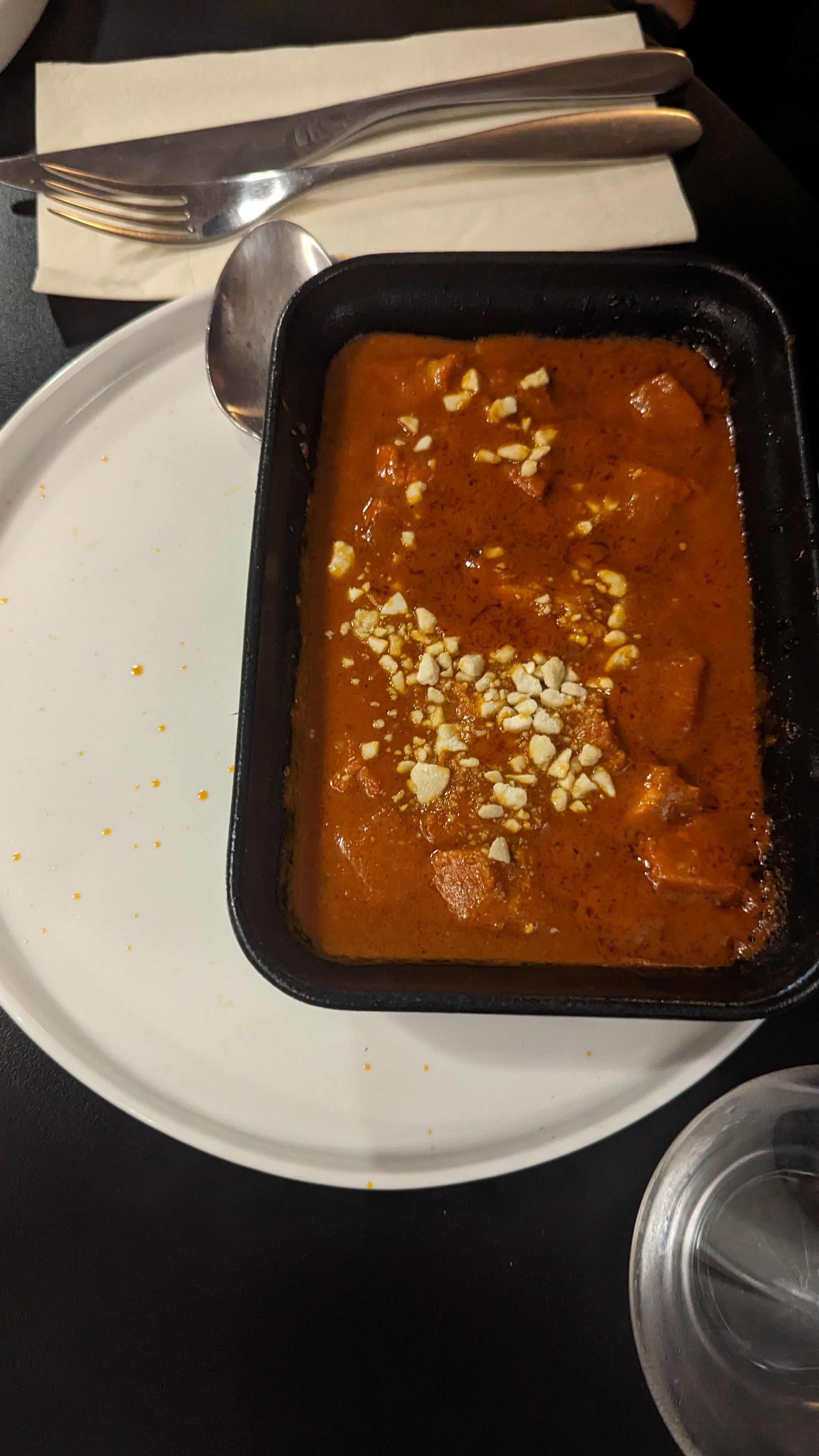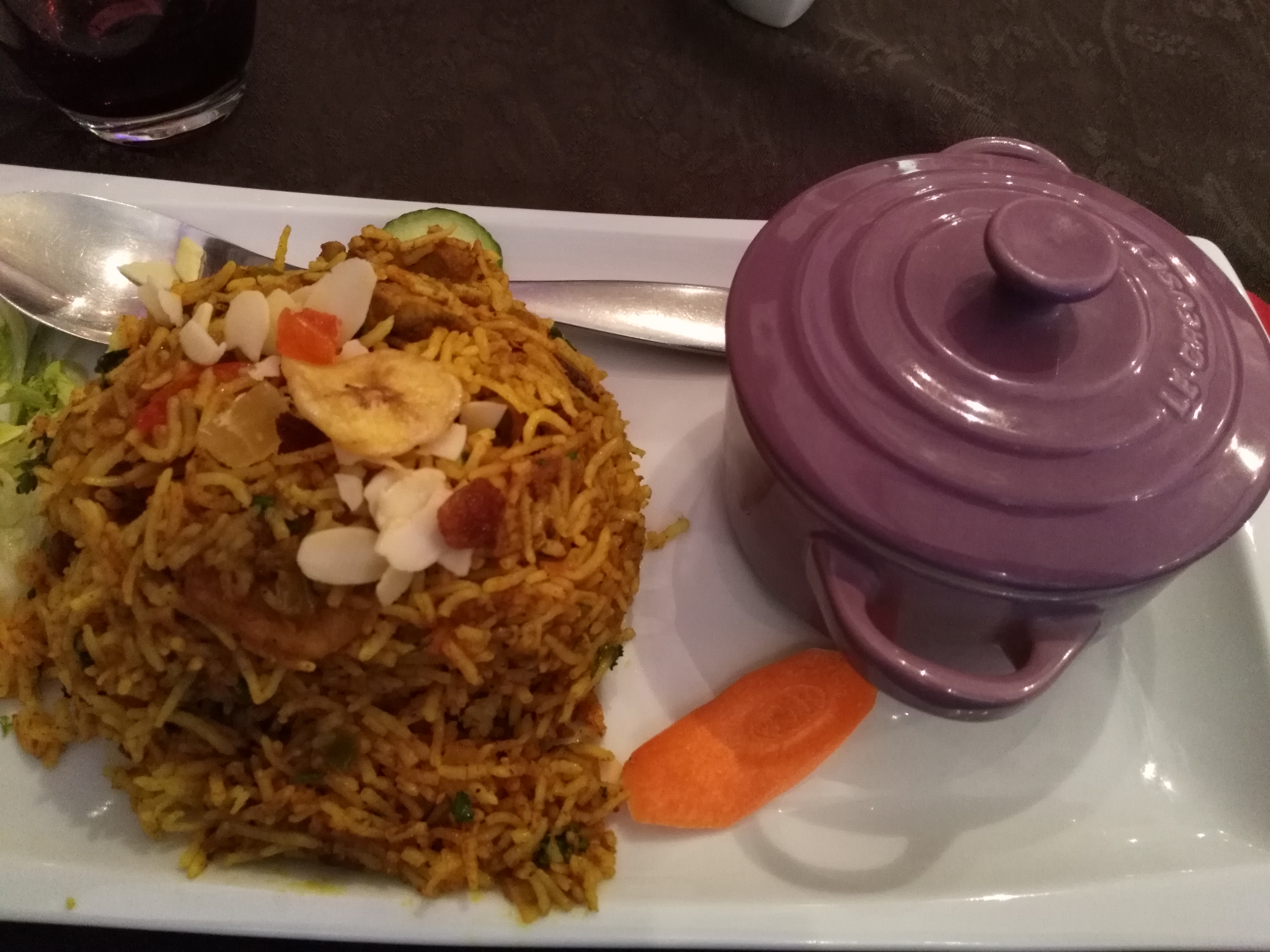 J'ai commandé un plat aux crevettes qui était délicieux , Par contre le thème indien au pakistanais est bien absent le côté ambiance aussi très froide silencieux !! Une petite musique serai pas mal pour ne pas entendre la conversation des clients à côté 😁