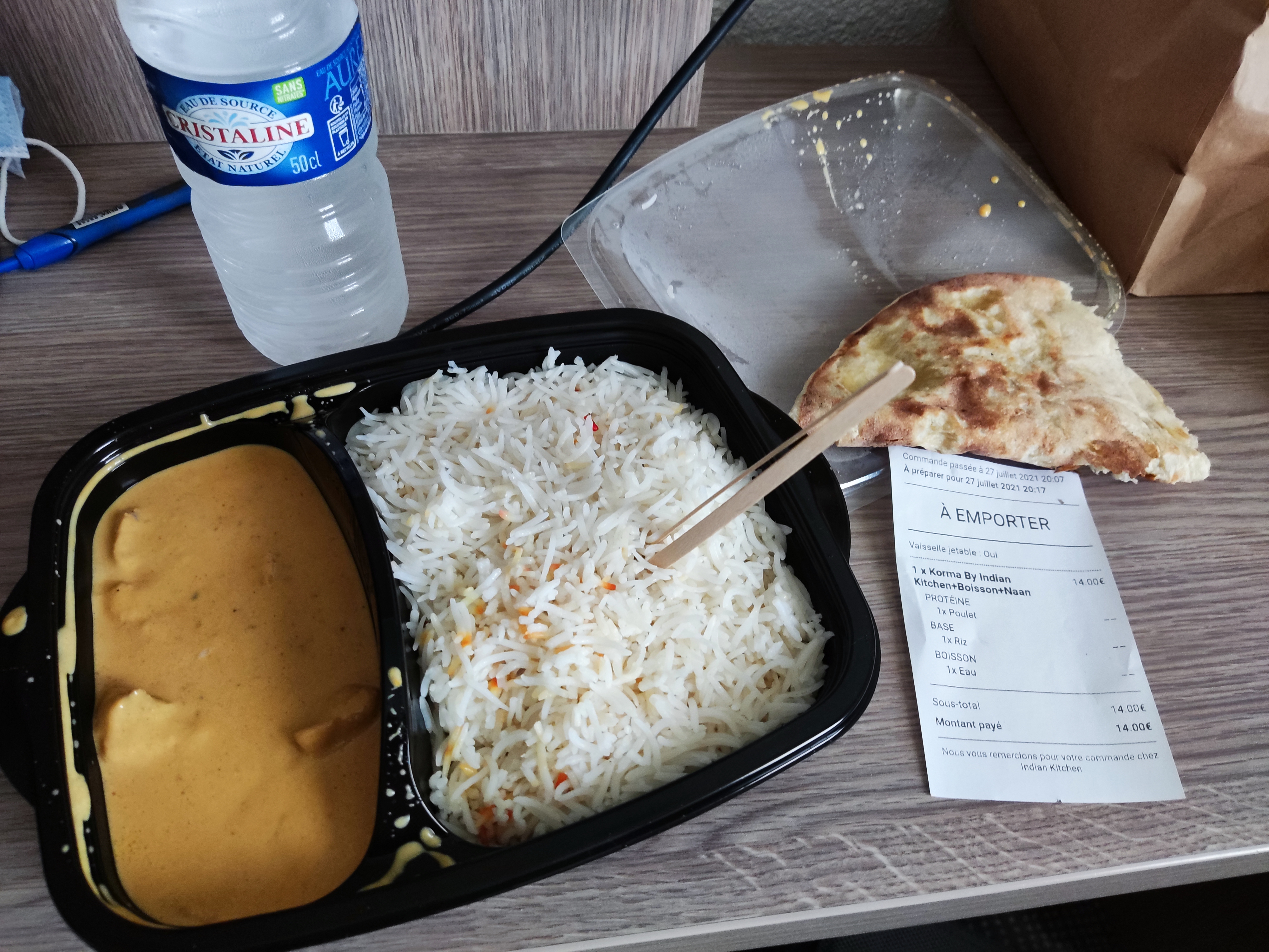 14 euros pour ça c'est décevant. Pas vraiment de saveur. Chicken korma noyé dans la sauce. Riz parfumé. Pas de couvert ni de serviette. Personnel très sympa et poli. Pas très authentique, peut être est ce adapté aux goûts européens mais si vous cherchez bien, il y a mieux pas très loin.