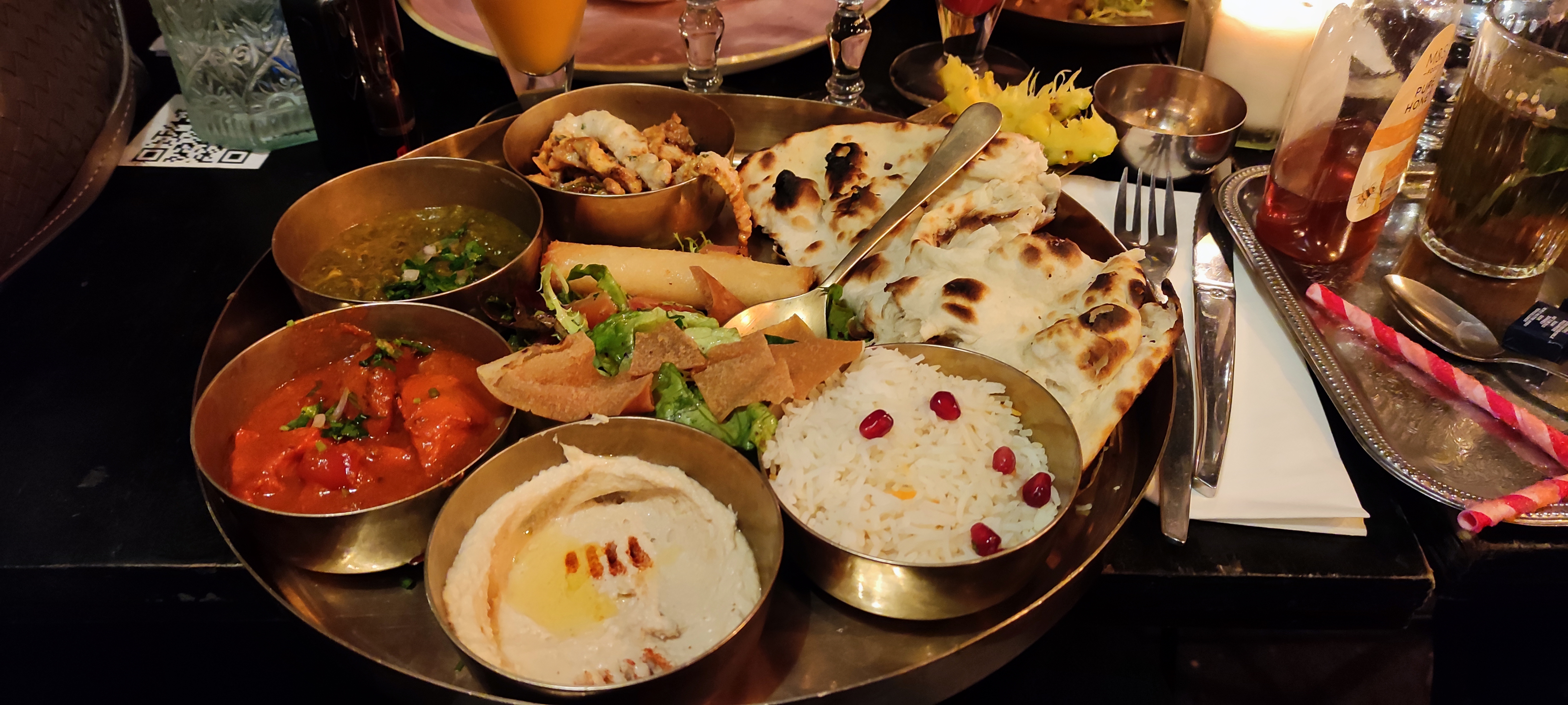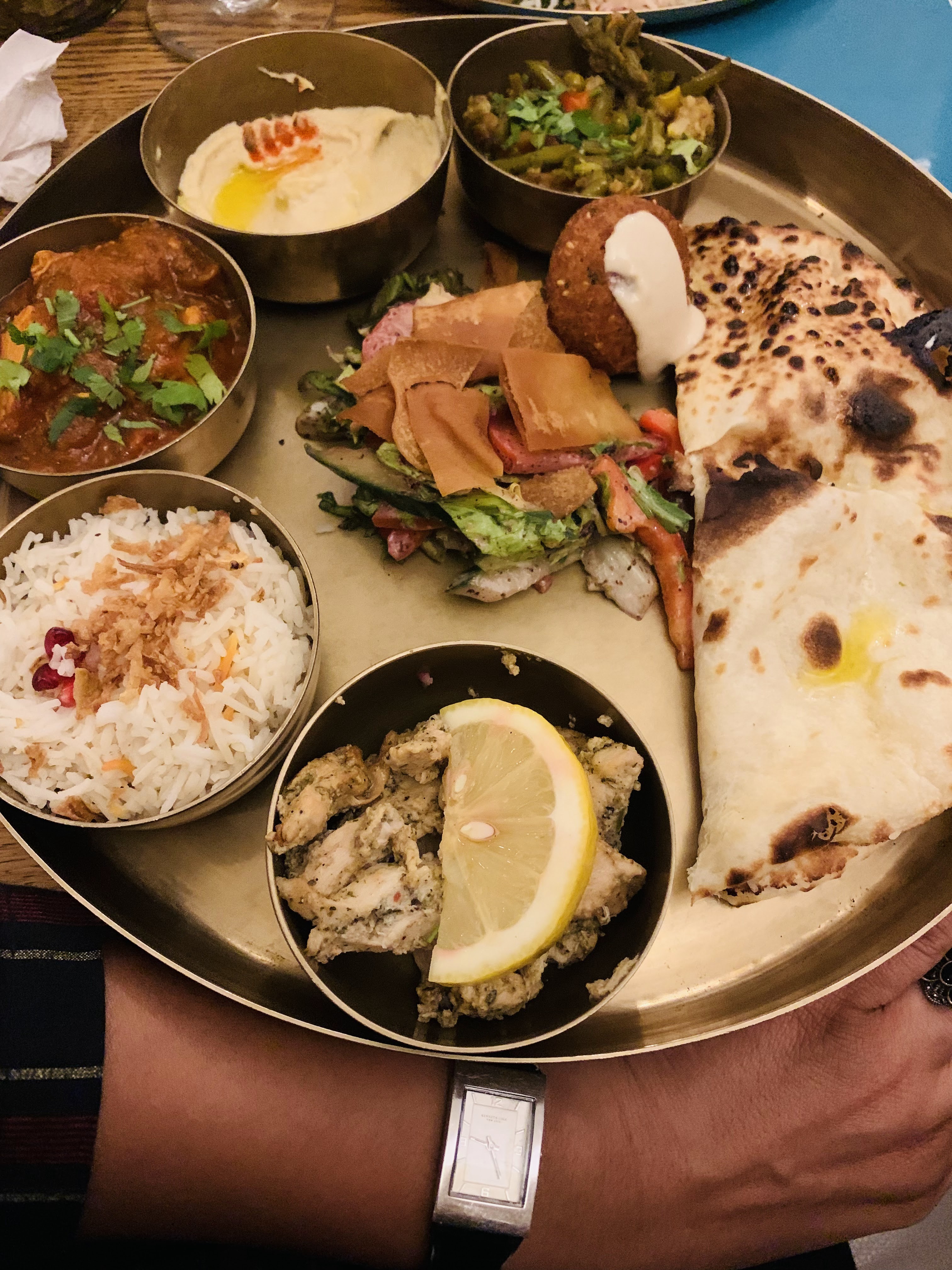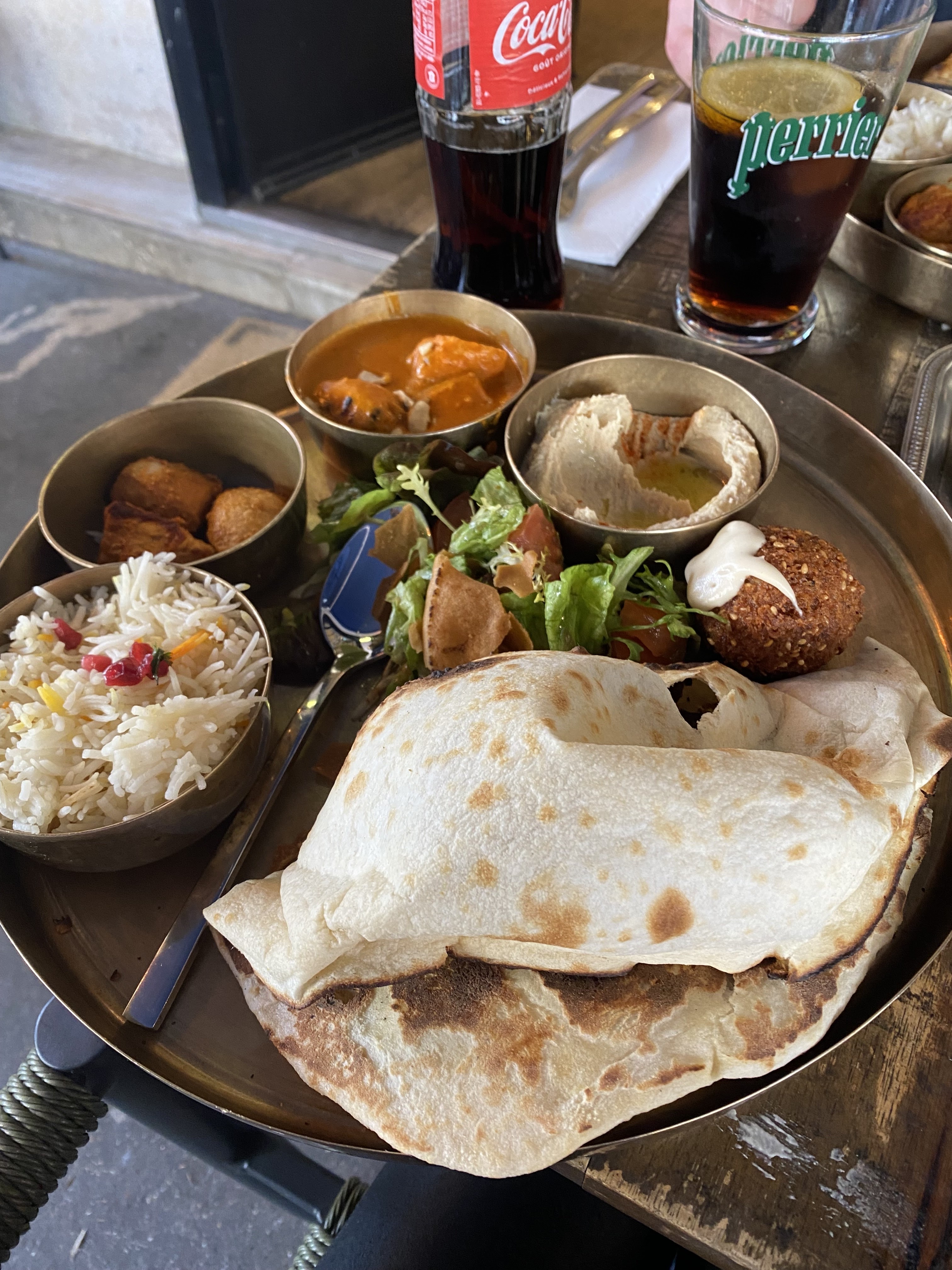 C'est un endroit que j'ai découvert grâce à un ami. J'y suis allé et j'ai pris le menu phare qu'ils propose qui est le Thali Yah Mezze. C'est une assiette mixte, avec diverses garnitures faisant la corrélation entre la cuisine Indienne et Libanaise. C'était correct et visuellement ça donnait faim, malheureusement il y a des petits détails qui ont fait que j'ai trouvé cela correct. Le houmous est bon mais il manque de saveur au niveau du sésame. Le butter chicken est très bon il n'y a rien à redire. Le riz safran est bon. La falafel était trop sec et on ne sentait pas les différents parfums à l'intérieur. C'est dommage. La dahl de lentilles manque d'épices. Et le dernier Mezze au poulet était très sec. Le naan au fromage quand à lui je n'ai pas eu de trace de fromage par contre il était trop cuit tout fin et tout sec, c'est dommage à nouveau. Le cocktail du jour était en fait un smoothie aux fruits.. 😂