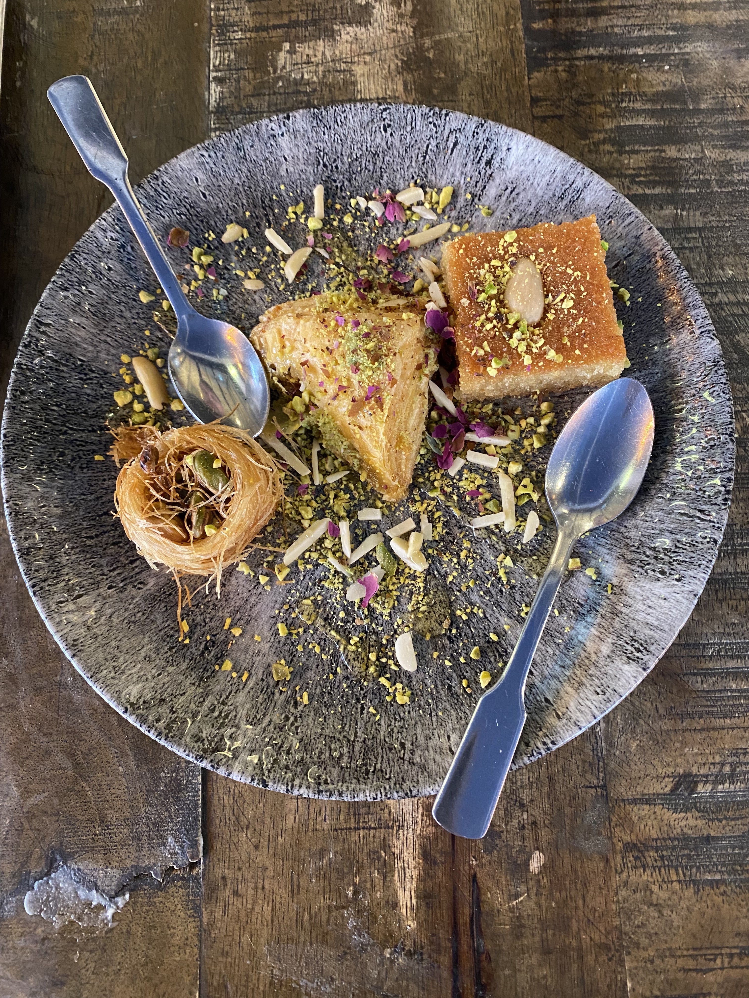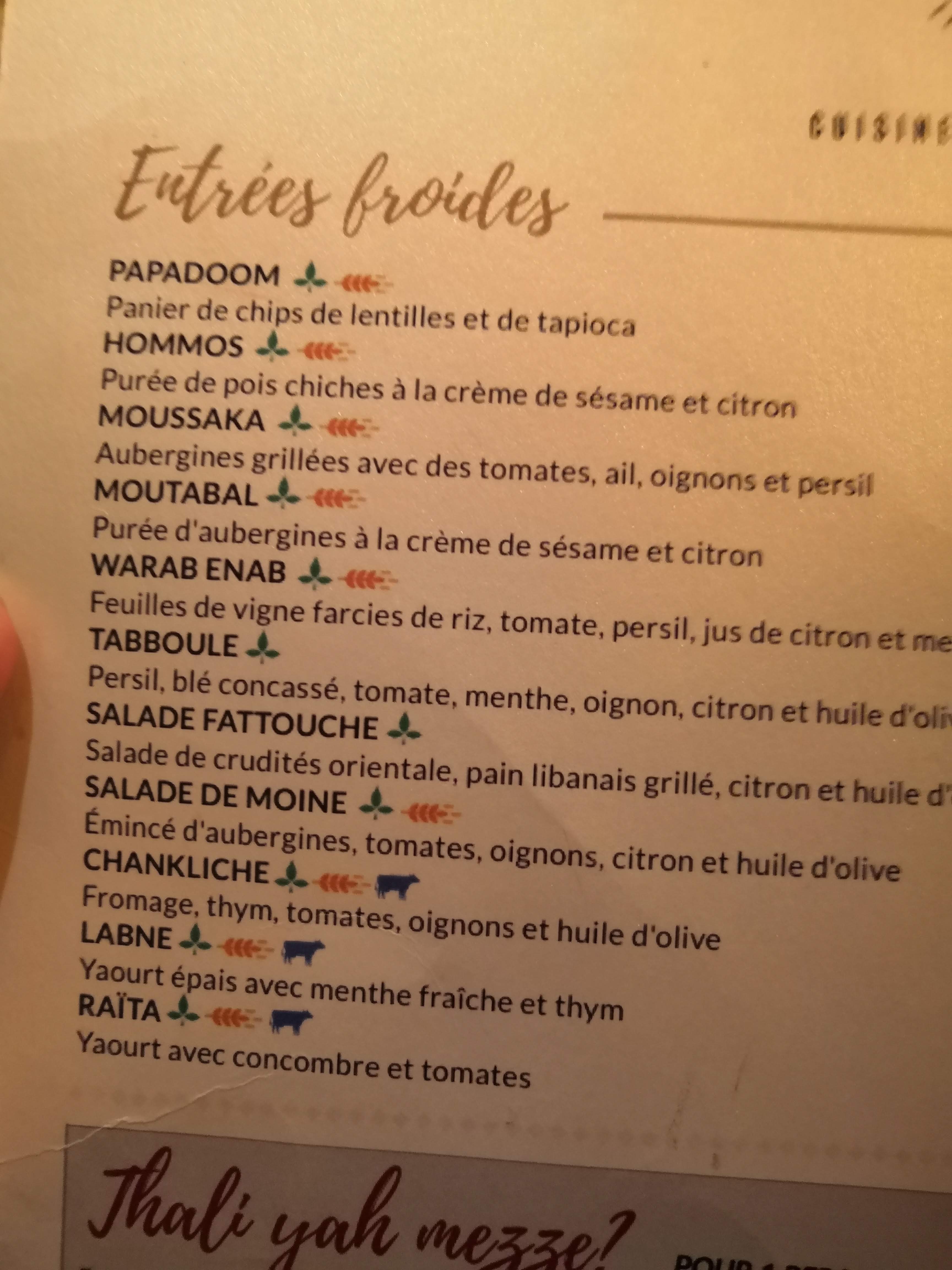 Excellente surprise! La cuisine salée est surtout d’inspiration indienne avec quelques touches libanaises (zaatar, houmous..) et les desserts sont surtout libanais. Un mélange intéressant!