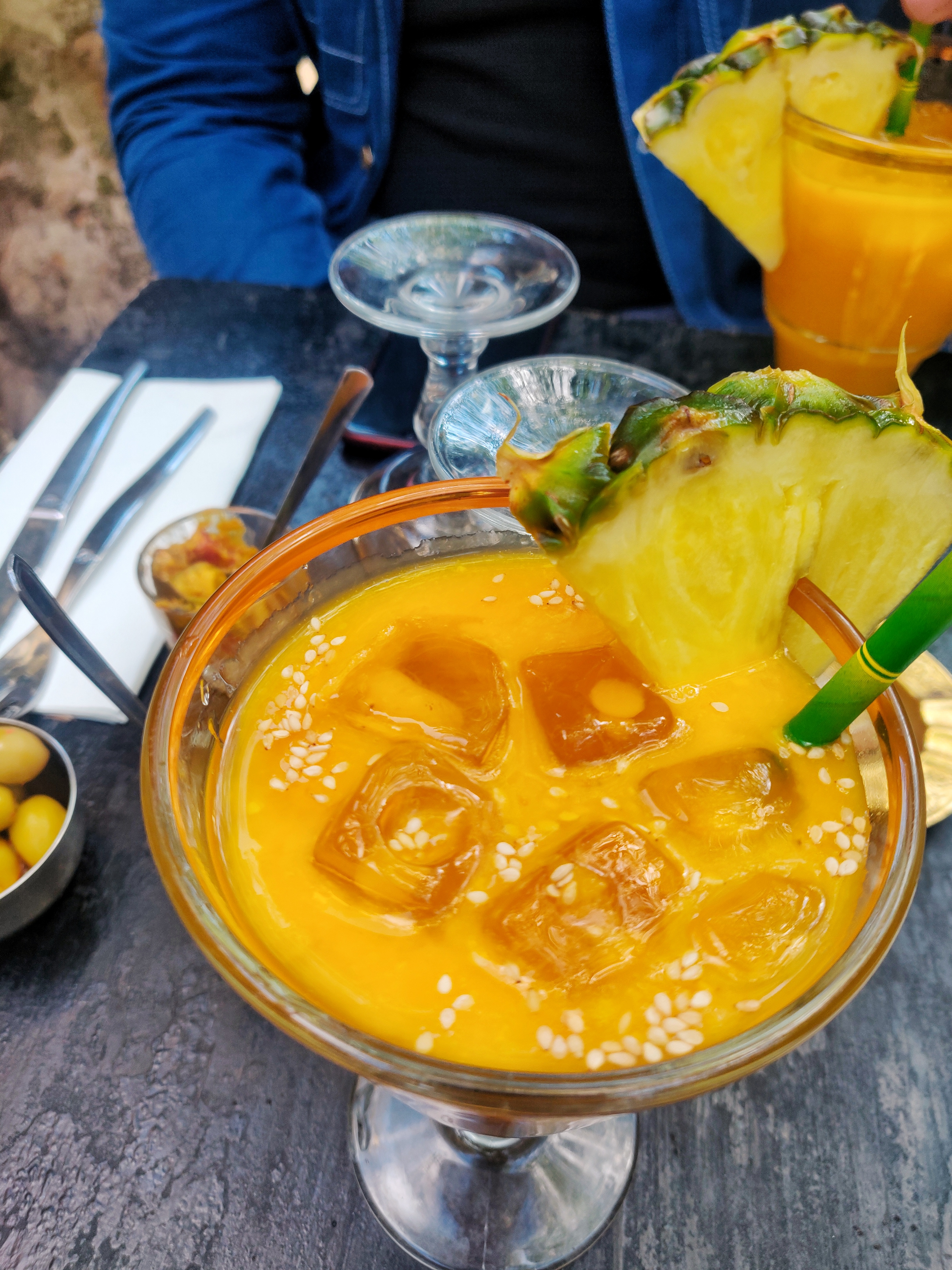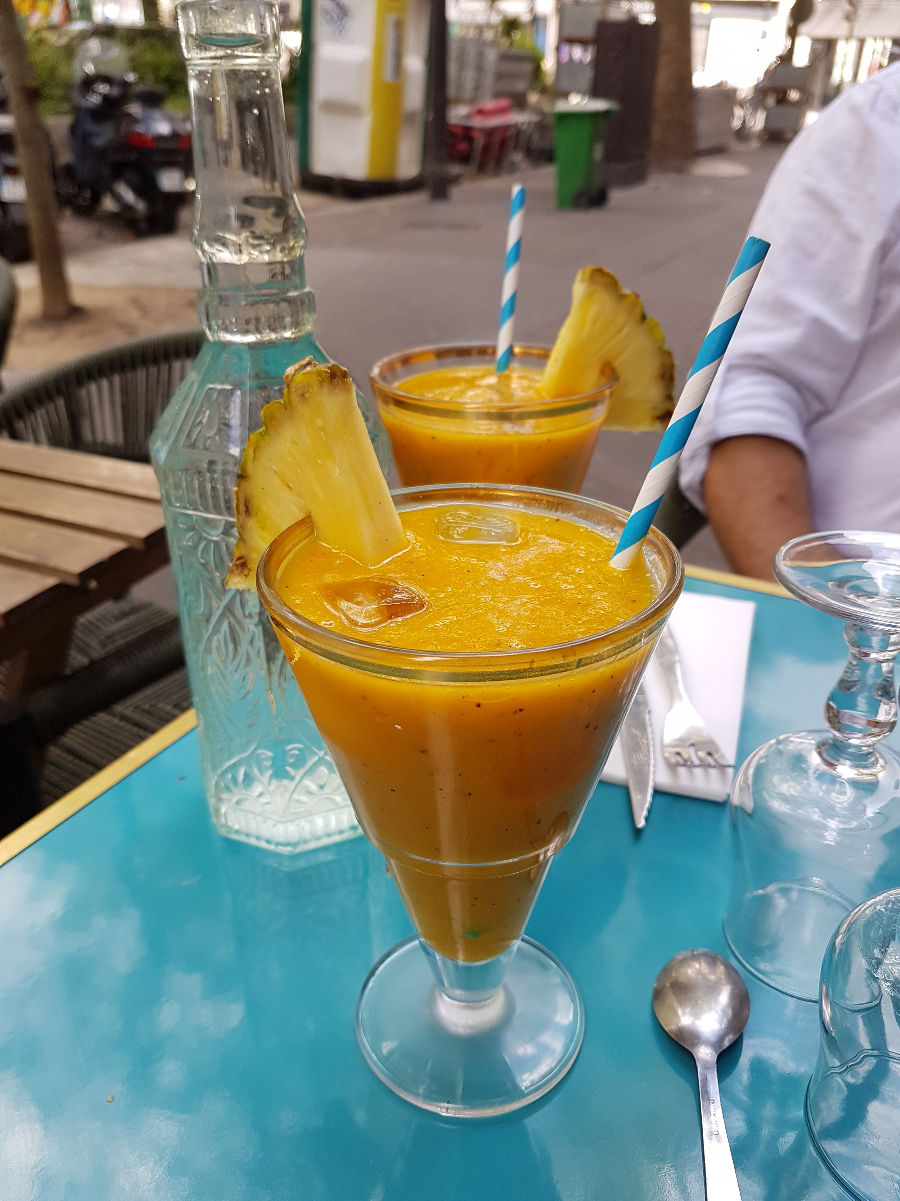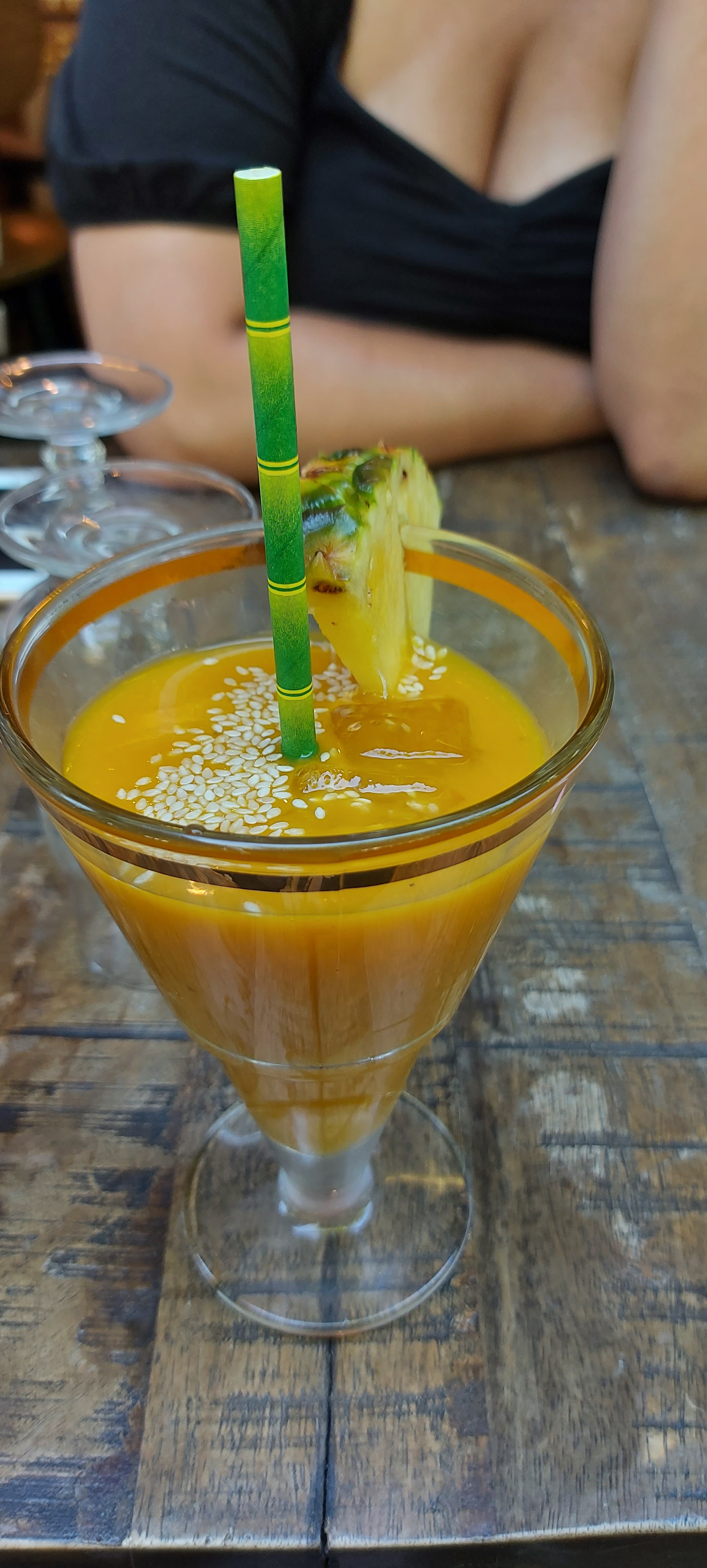 on a essayé la combinaison de tous les plats proposés par le menu. C'était très riche et délicieux, et le cocktail du jour( mangue, kiwi,etc) pressé était rafraichissant
