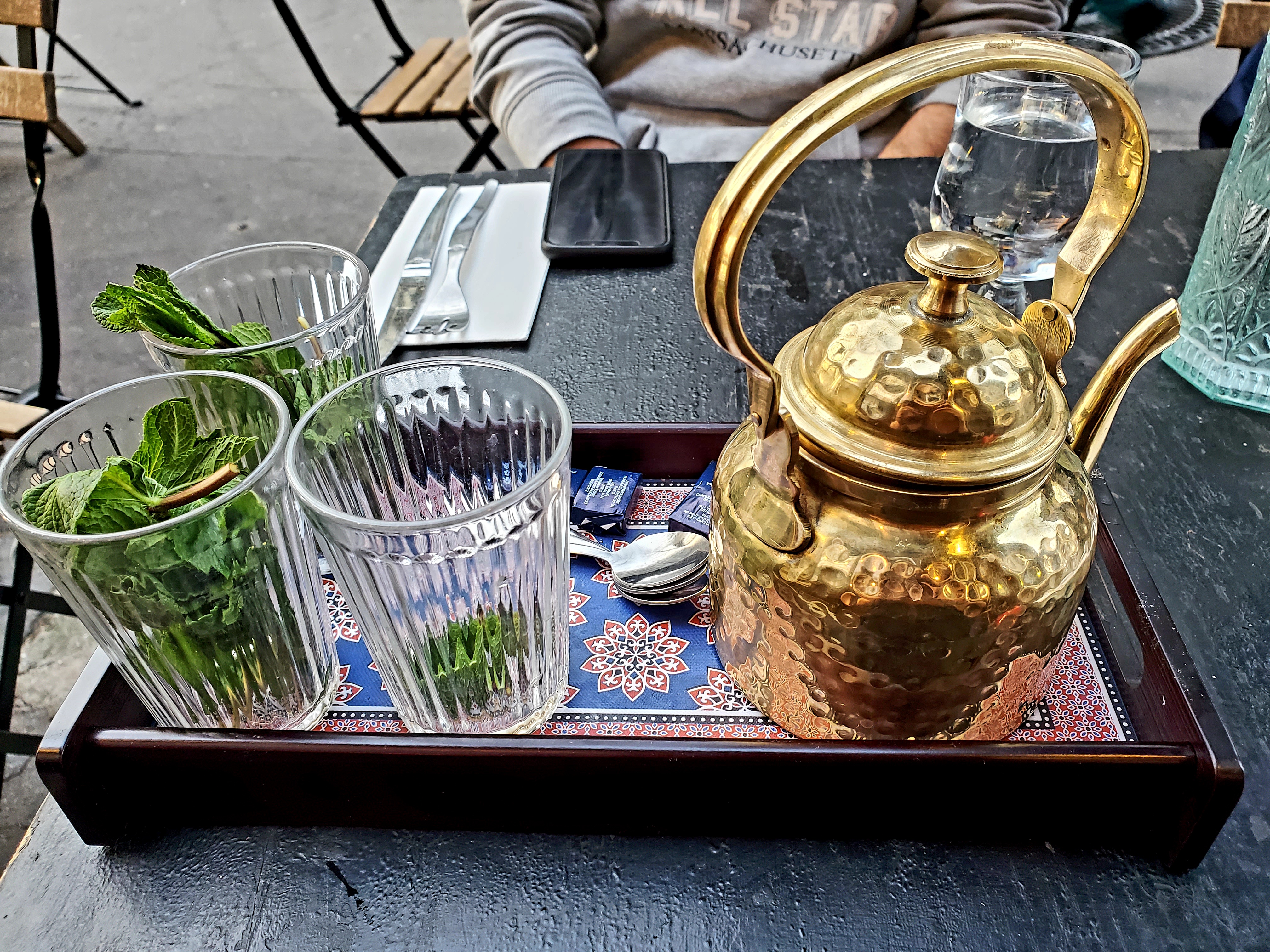 Le thé vert à la mente fraîche servi avec les pignons de pin et le miel 😌 Why not… Les rikakat et les pickels…👌🏻 Tout était très bien