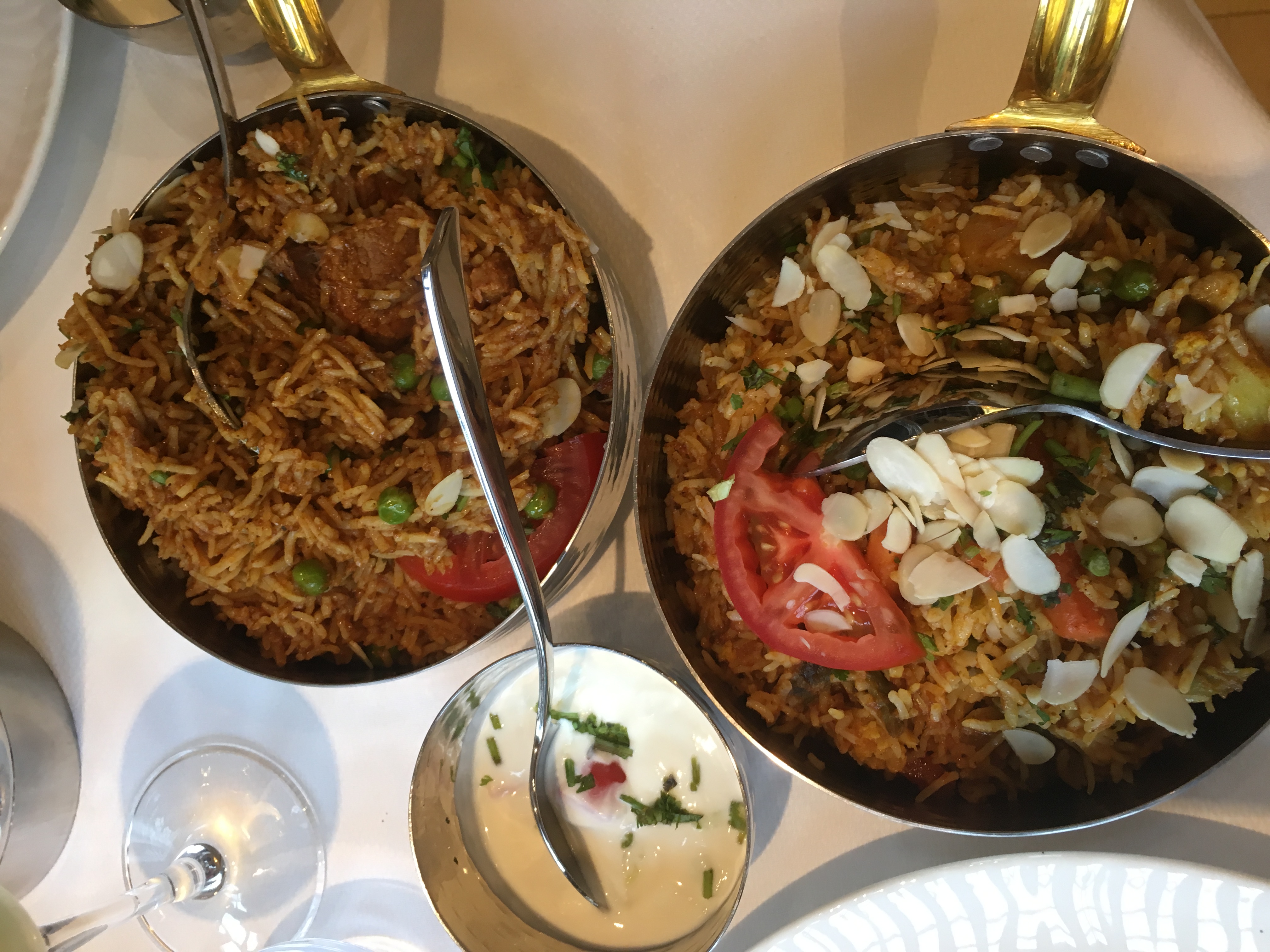 Accueil très aimable, au moment de la commande, comme au moment du paiement 20 mn plus tard. Cependant, un peu déçue par les saveurs des biryanis commandés. Difficile de les différencier les uns des autres. Le riz avait toujours le même goût; j'ai eu l'impression que la garniture avait été rajoutée un peu tard, les crevettes, le poulet ou les légumes n'ont pas eu le temps de se combiner avec le riz. Le naan ail fromage n'est pas top, il s'agit d'ail concassé, un peu cru, qui laisse un goût amer en bouche. Les prix me paraissent assez élevés (17€ pour un biryani de crevettes ). Je voulais essayer, voilà c'est fait.