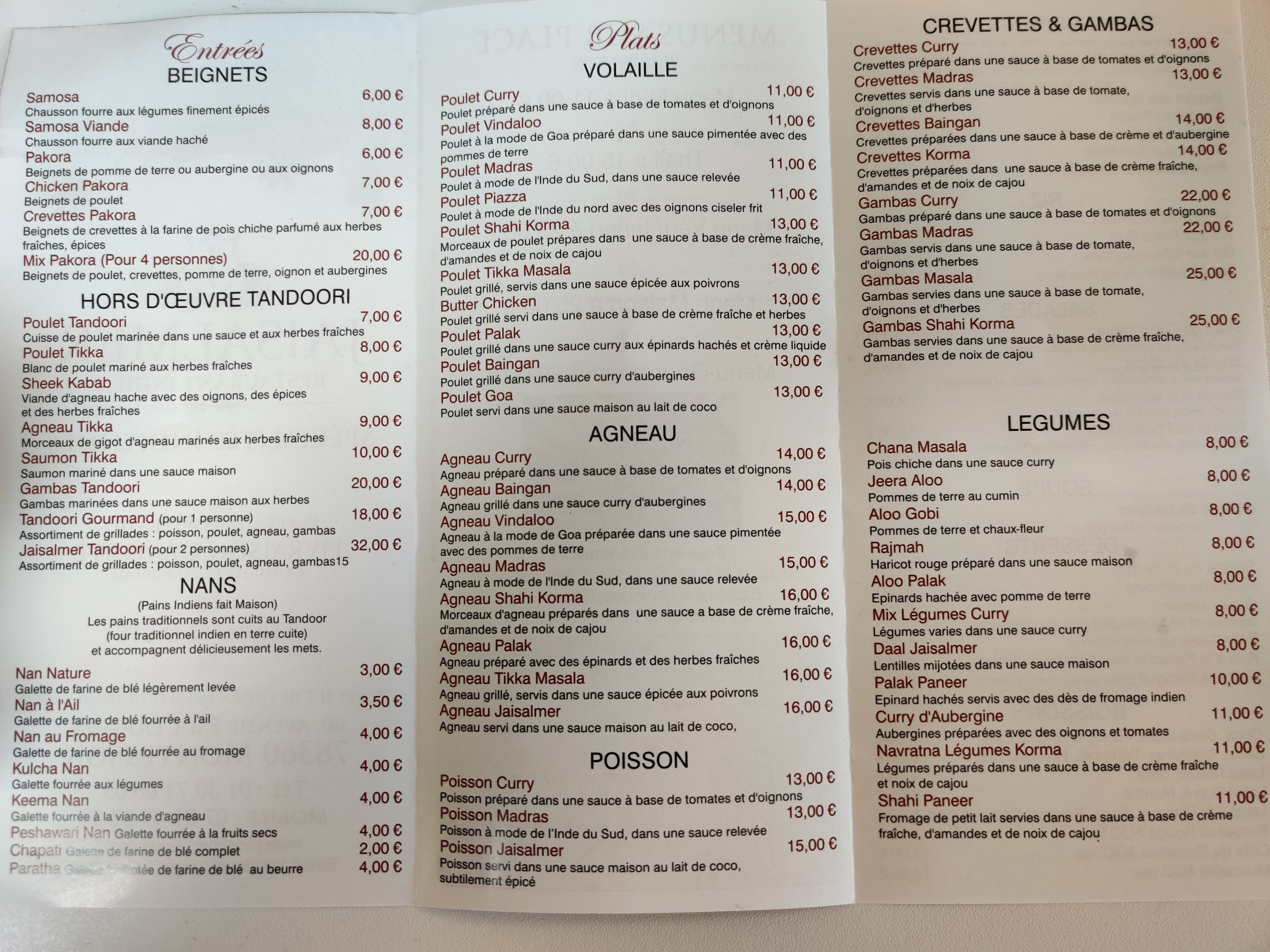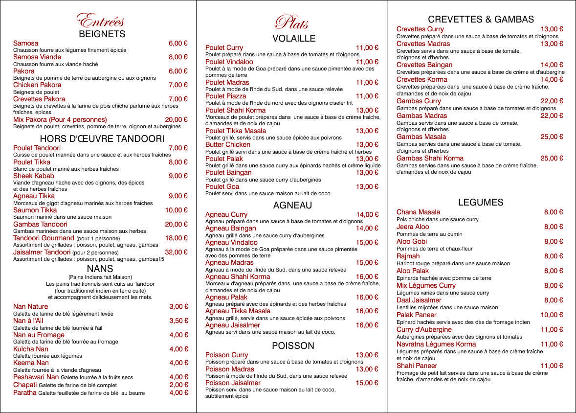 Pour avoir voyagé en Inde et à Jaisalmer je trouve la décoration un peu fade comme les plats qui manquent de caractère, mais c'est pour le goût des Français.. Alors cela reste quand même correct, évitez l'agneau qui est toujours trop cuit, préférez le poulet qui reste bien moelleux et prend bien les épices. Bonne dégustation.