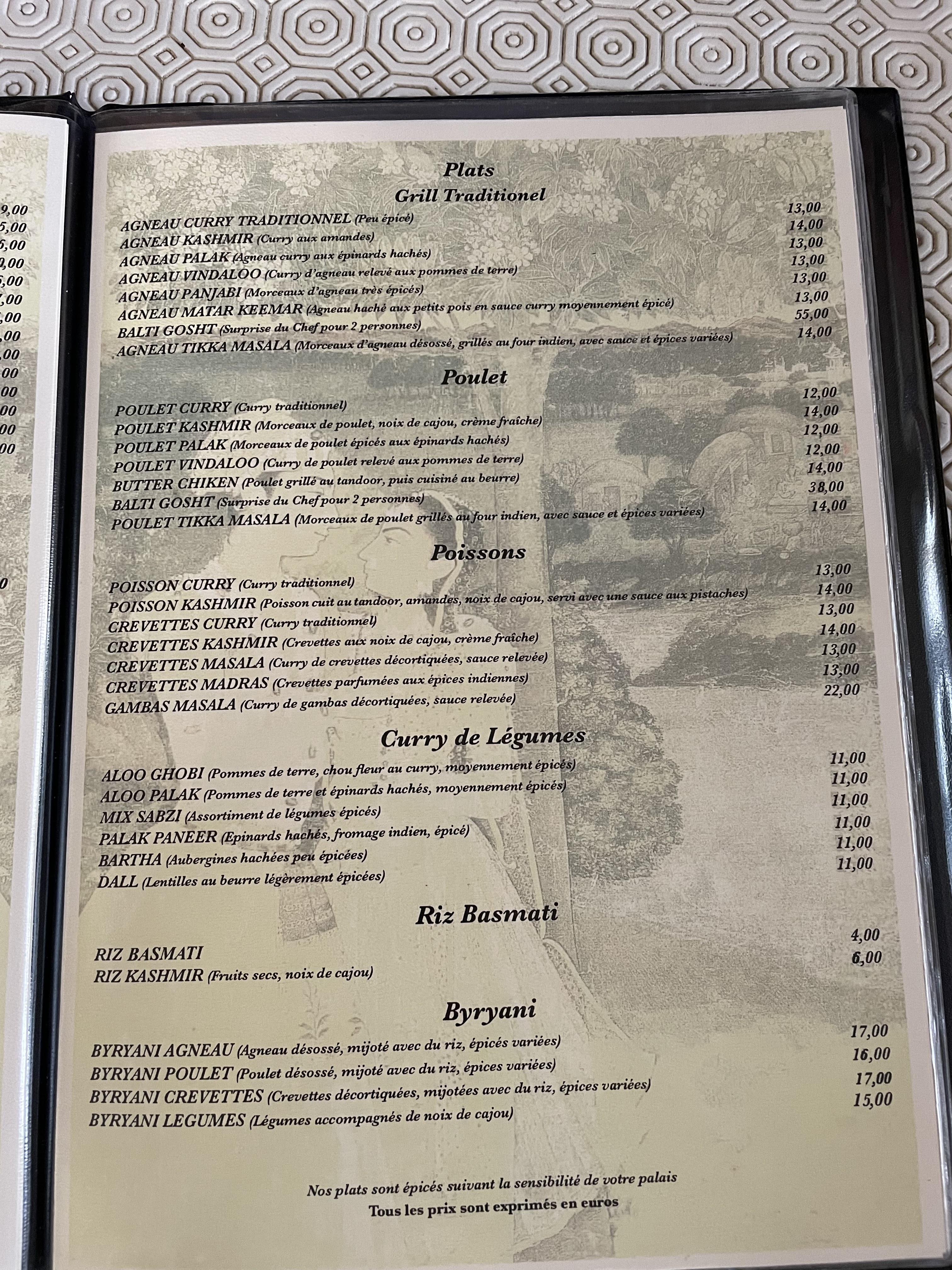 La nourriture y est excellente mais les prix reste excessif . Nous avons opté pour le byriani d'agneau qui est un vrai délice ainsi que les cheese nane réussi. Mais le prix du soir pour les dîner est une vraie barrière qui fait que je ne renouvellerais pas l'expérience dans ce restaurant. Le midi les prix sont beaucoup plus abordables