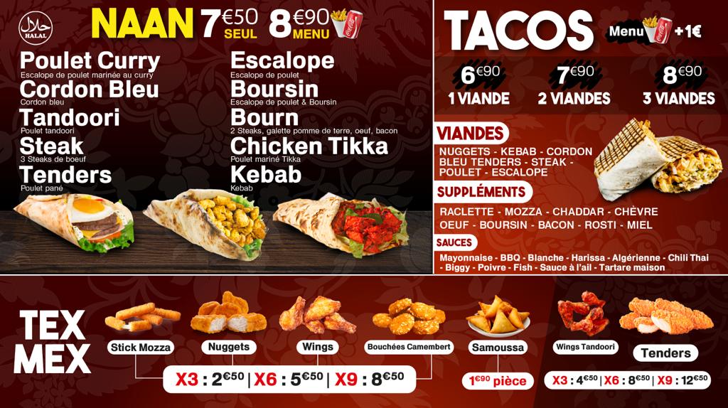 Naan Chicken Tikka bon mais AVEC des oignons (commandé SANS oignons !) 😡 Accueil simple et rapide. Large choix de repas (tacos, naan, Tex Mex…) Ouvert un jour férié. Pas de parking devant. Terrasse avec table extérieur et intérieur.