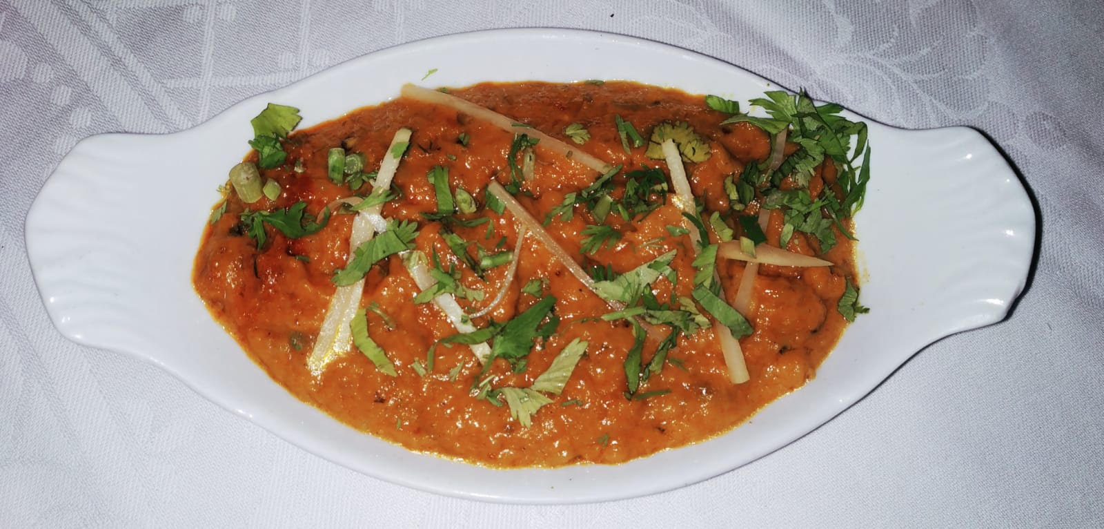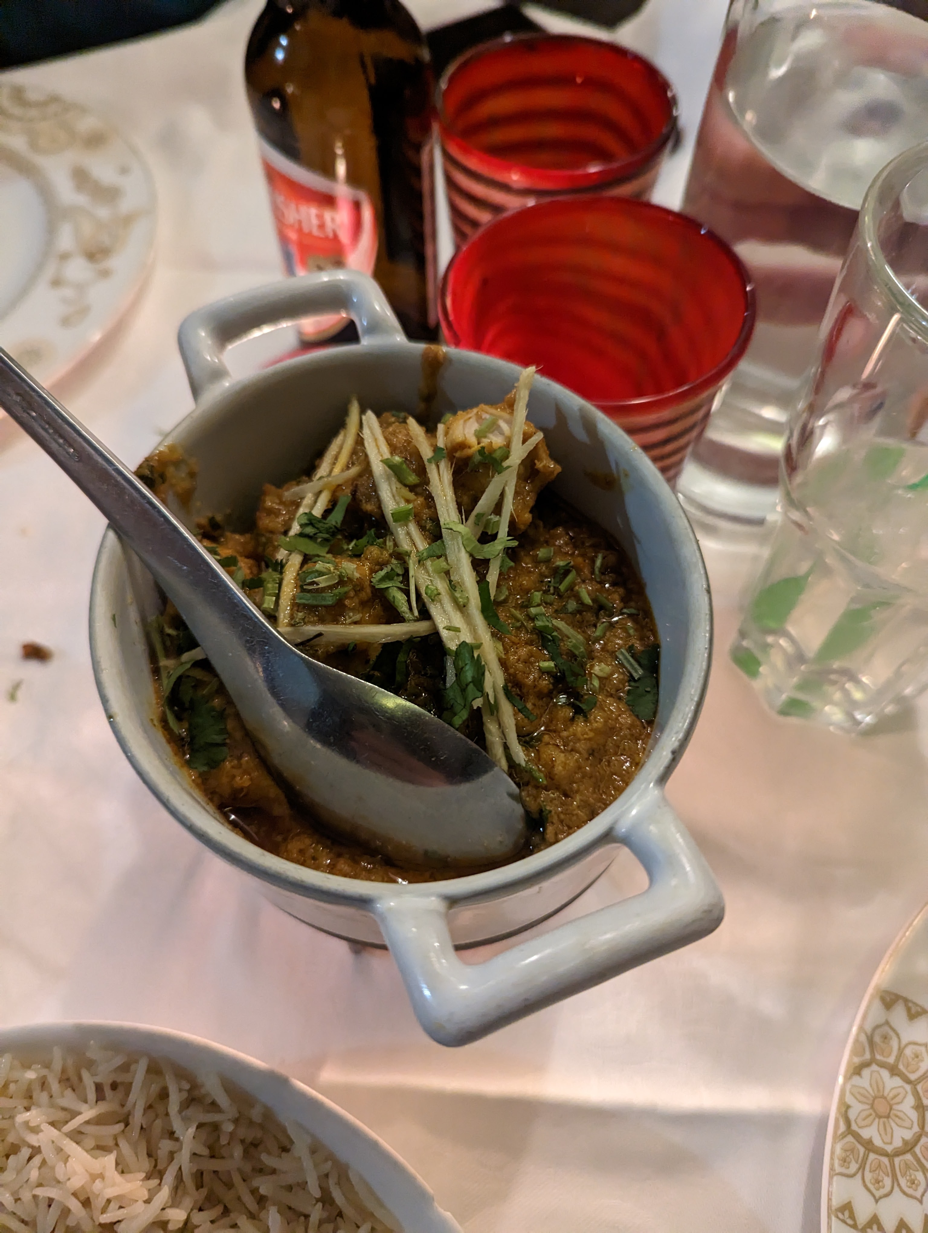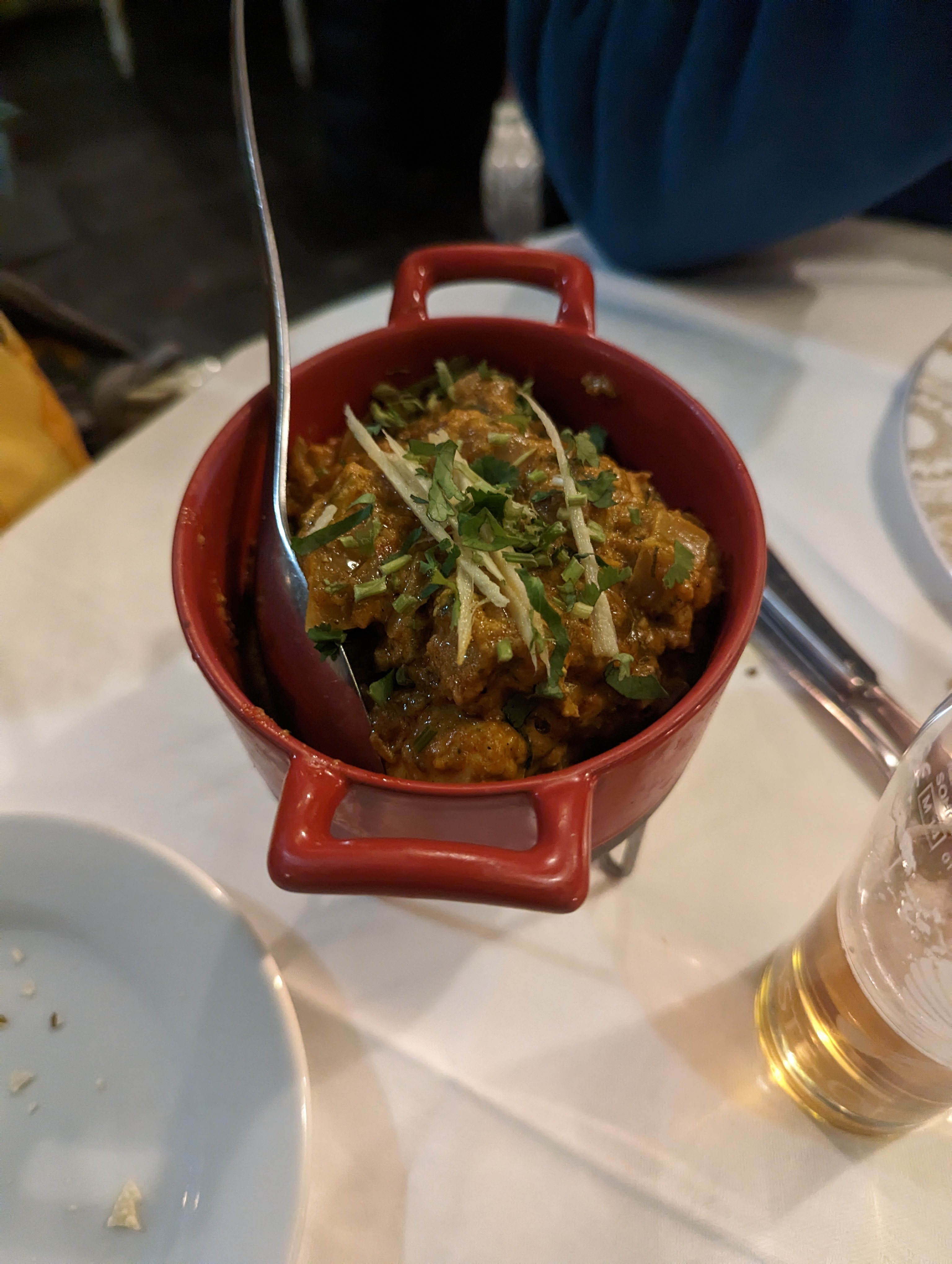 Très bel endroit cosy avec Nappe en coton blanc. Bonne cuisine, cardamome, coriandre fraîche, les saveurs sont là.