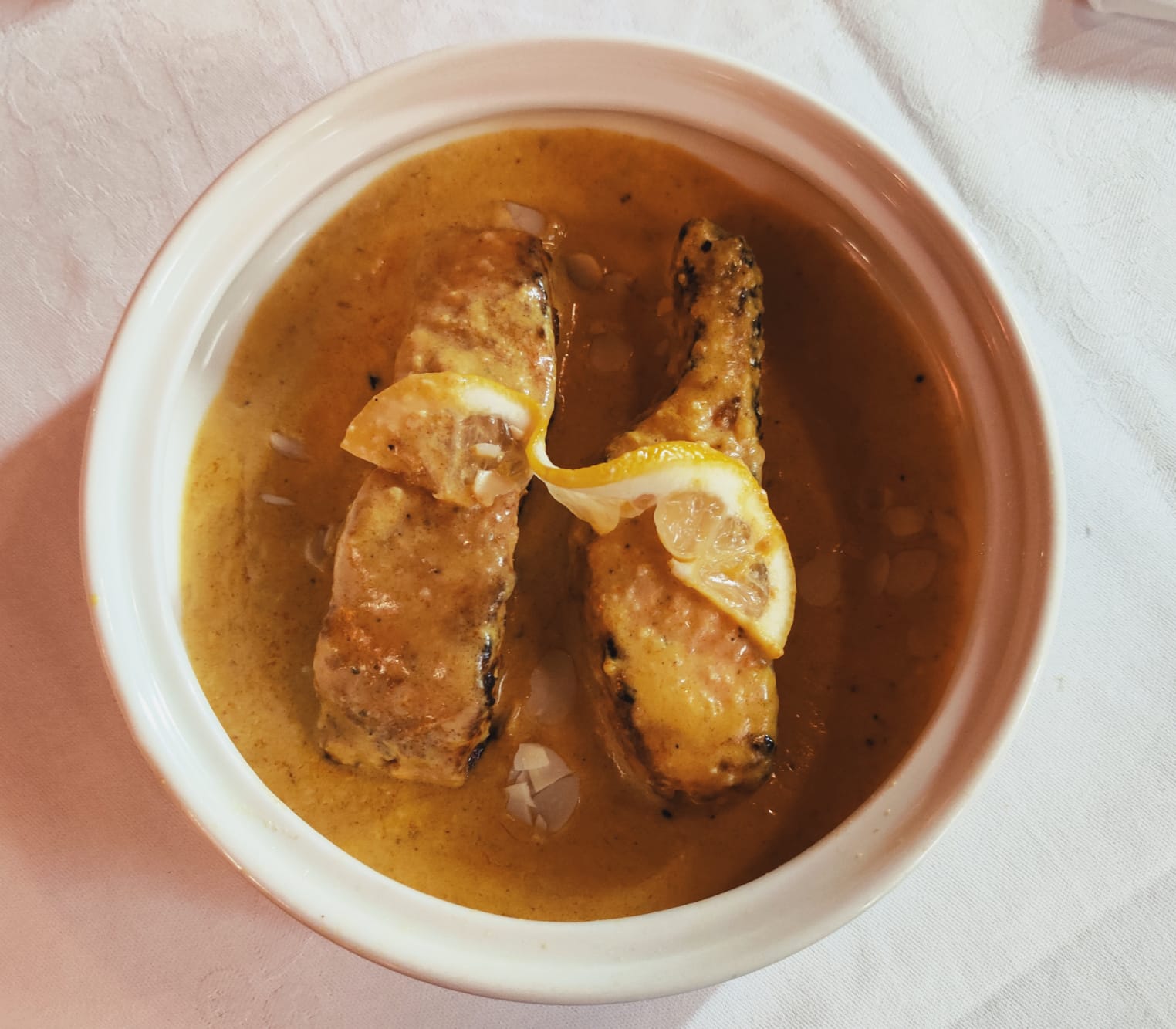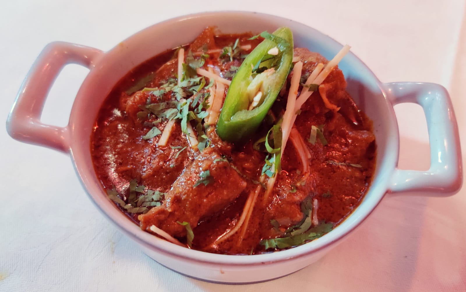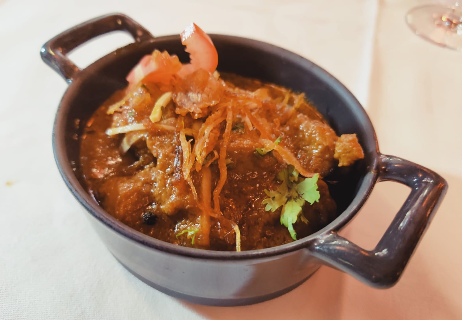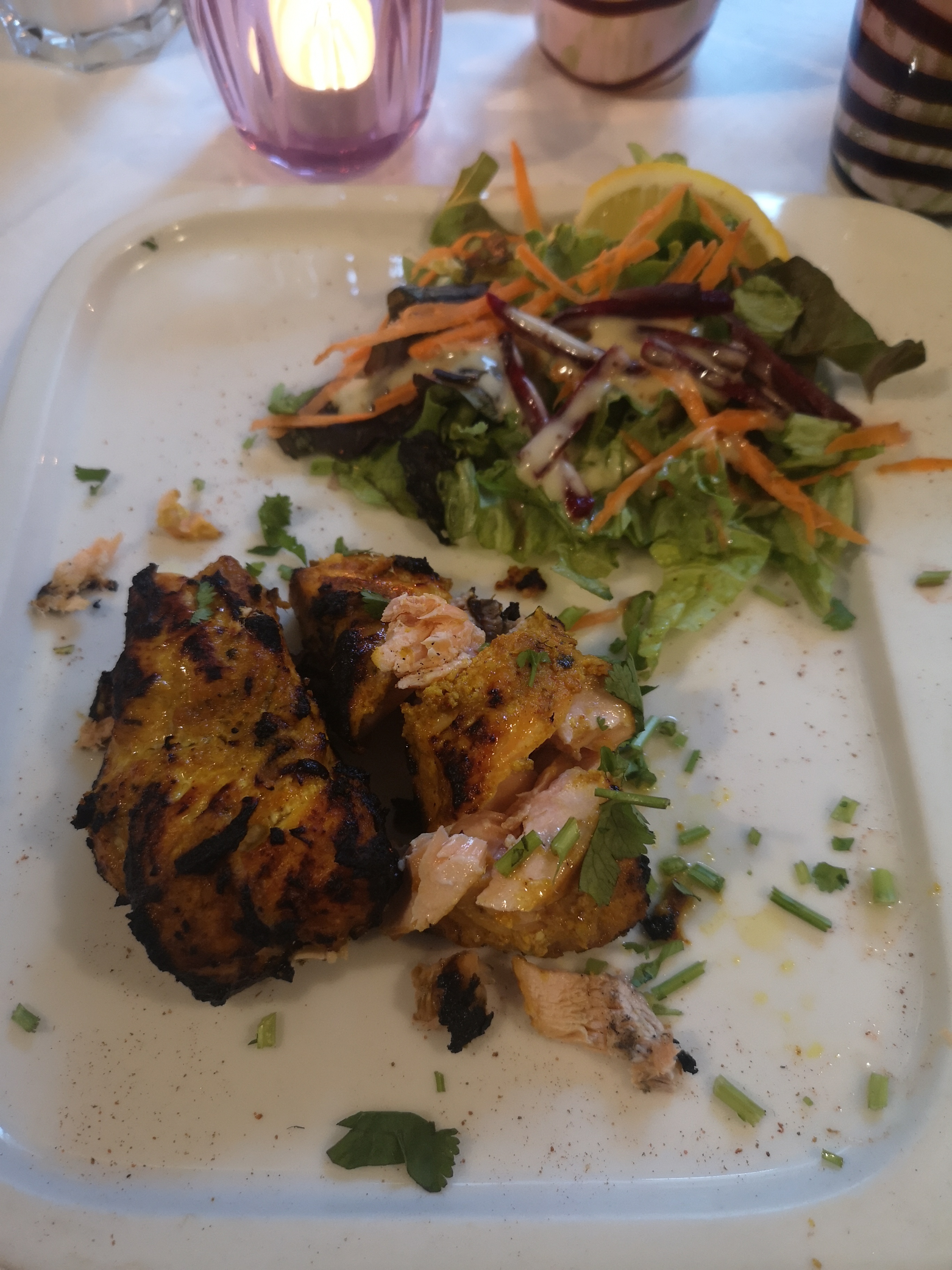 Très bel endroit cosy avec Nappe en coton blanc. Bonne cuisine, cardamome, coriandre fraîche, les saveurs sont là.