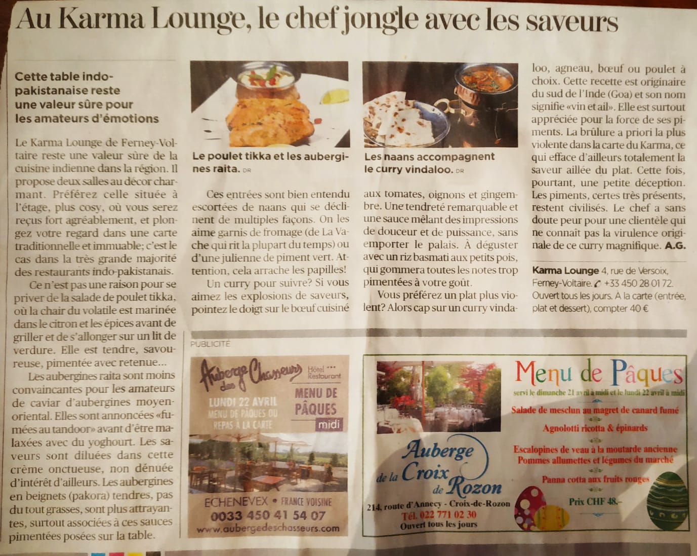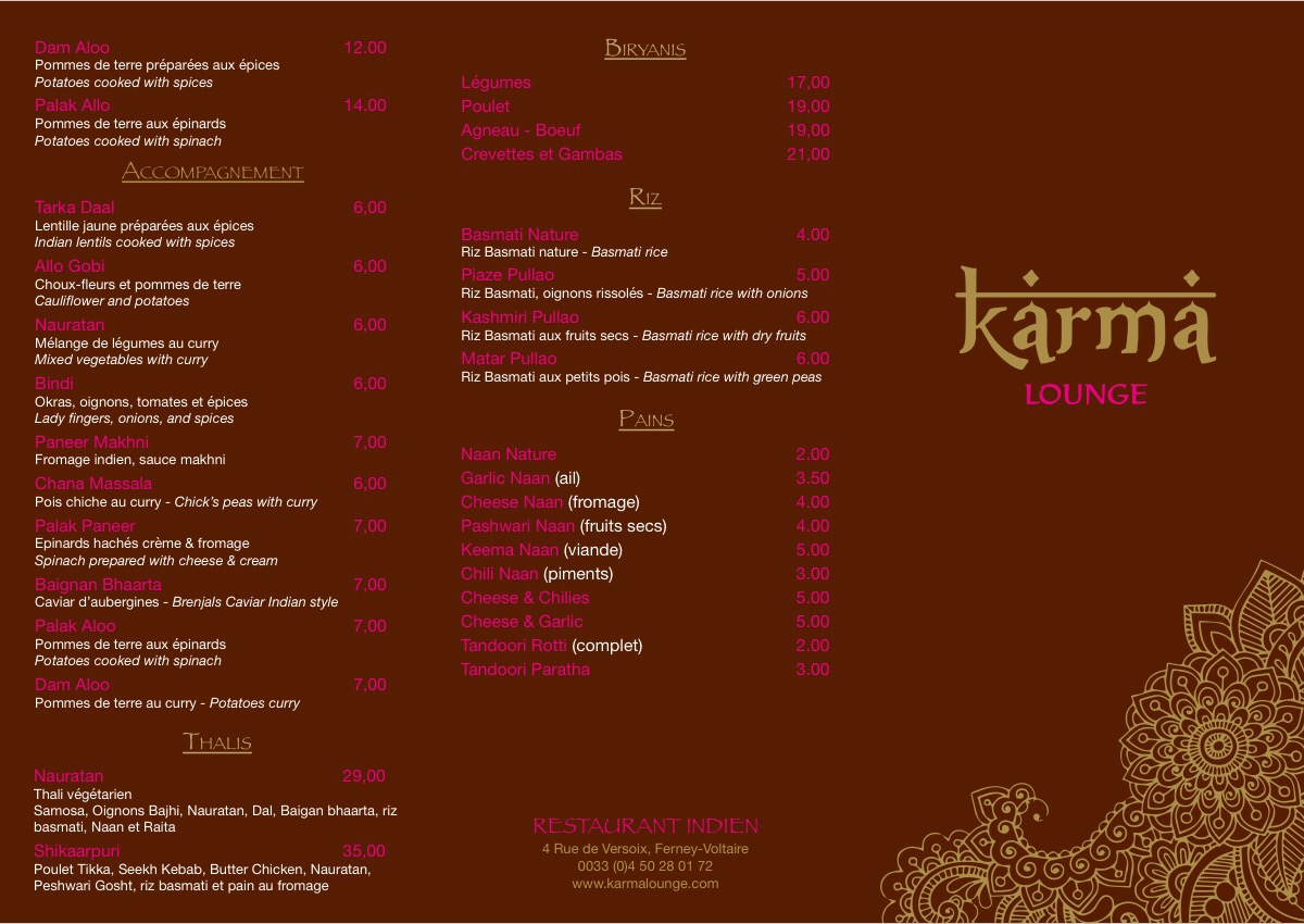Voici toutes les informations sur le Restaurant indien Karma Lounge qui ce trouve au 4 Rue de Versoix, 01210 Ferney-Voltaire (01). Sur cette fiche vous trouverez les photos, l'adresse, les horaires d'ouverture, le numero de téléphone et les avis clients.Vous pouvez églement rédiger un avis si vous le souhaitez en bas de page.
