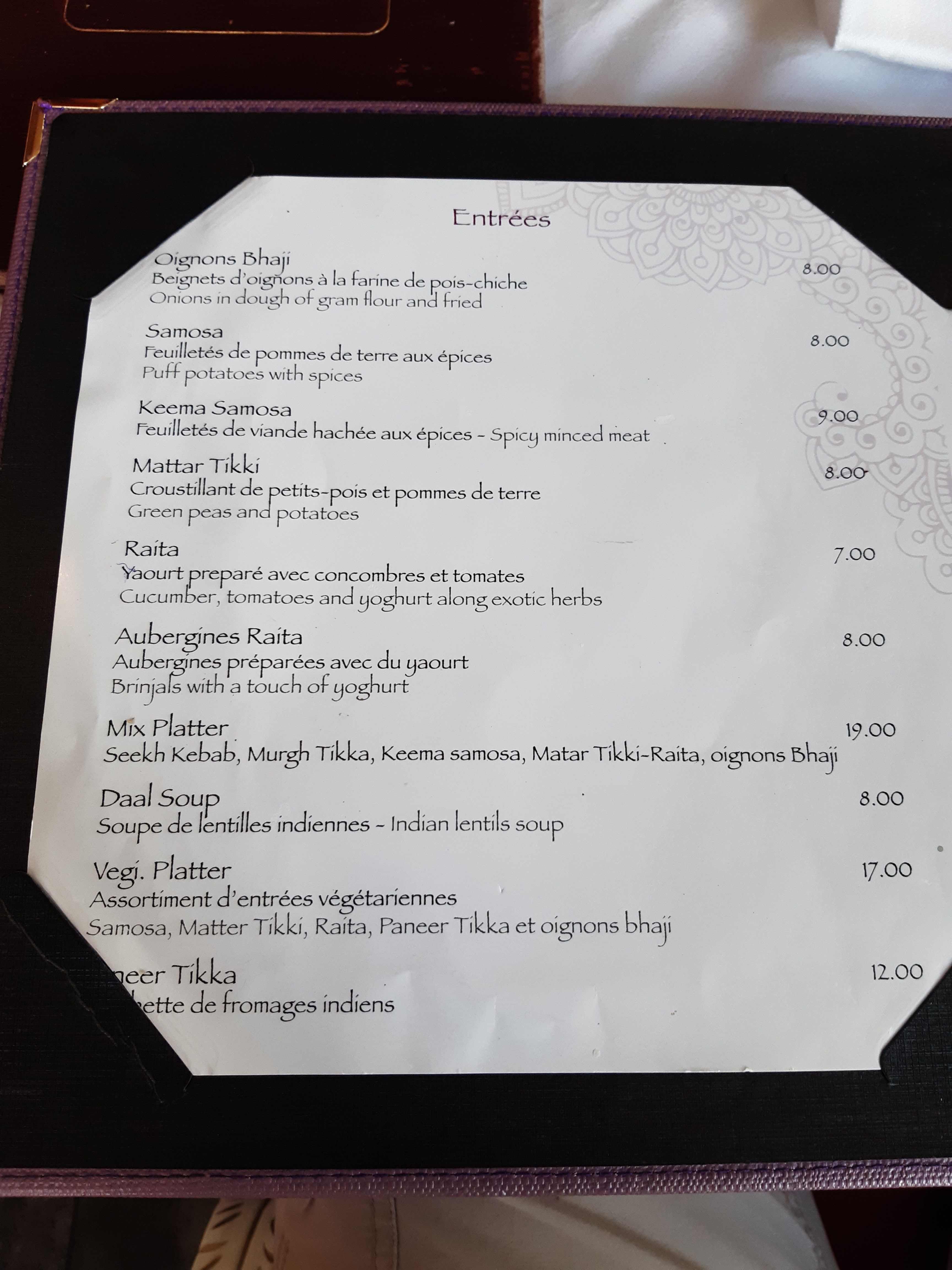 C'est ma première fois dans un indien et je ne suis pas déçu. Les plats sont juste incroyablement bon. J'adore la décoration c'est un cadre chaud et agréable. Très bon restaurant je vous le recommande.
