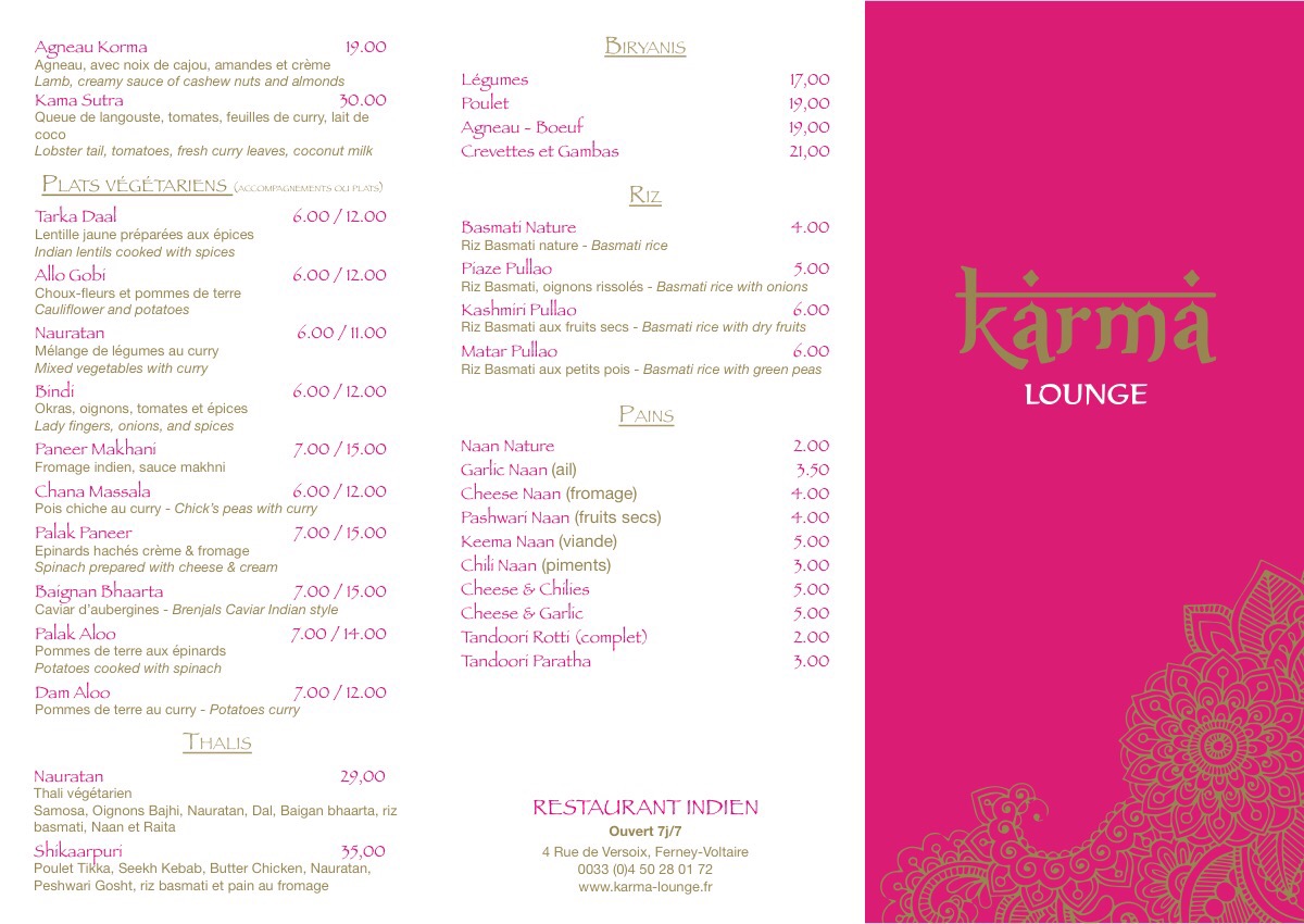 La cuisine du KARMA LOUNGE est excellente et l'accueil très agréable. Les serveurs apportent de précieux conseils lorsque vous n'avez pas l'habitude de manger indien.