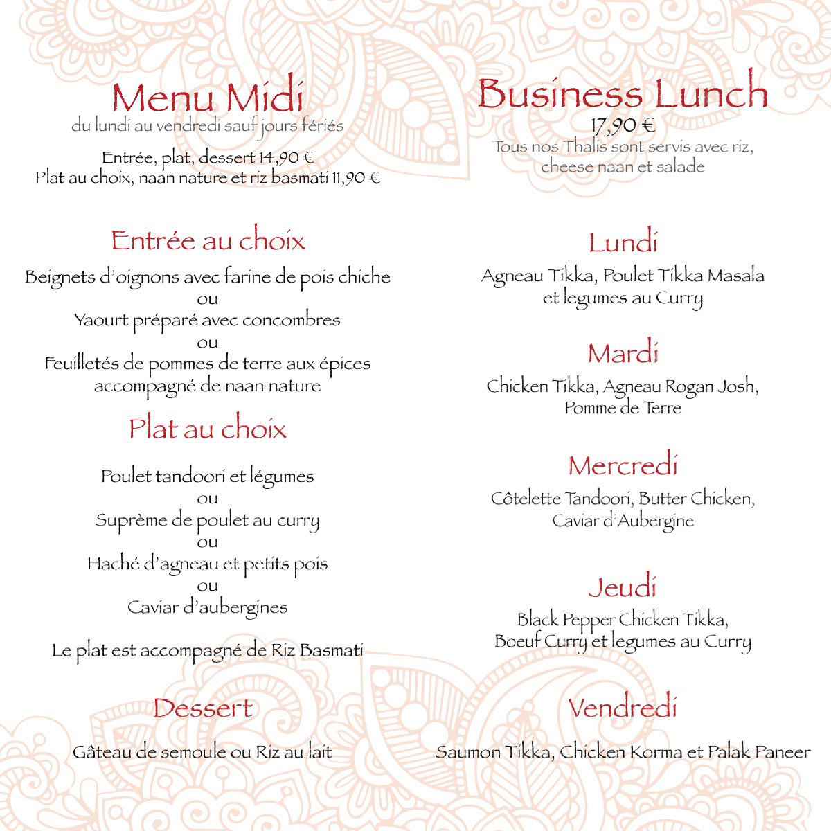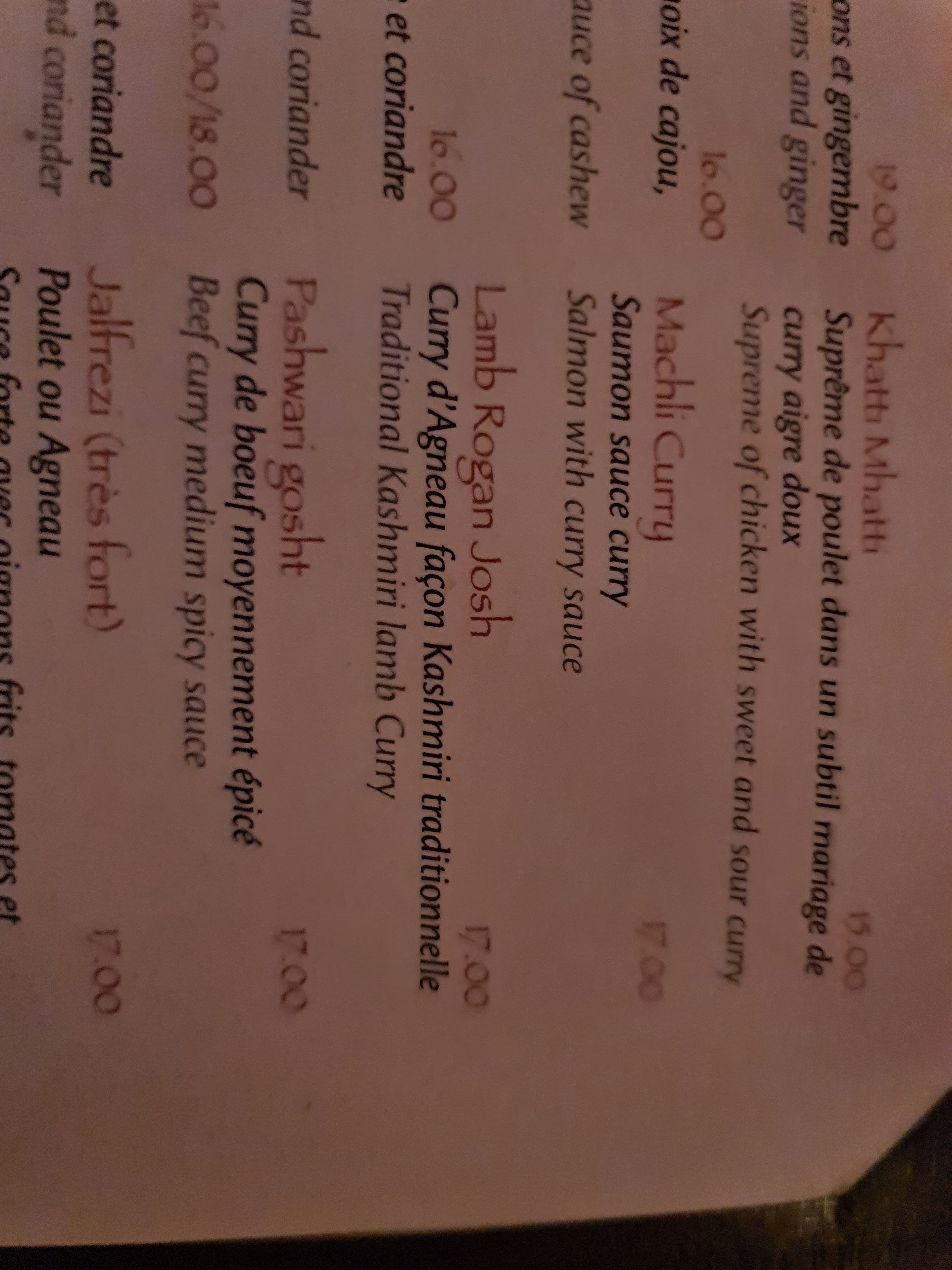 Un accueil glacial, certains mets d une grande qualité, mais le menu rapide laisse a desirer, le plat principal est bon mais ressemble peu a ce que je mange dans les autres restaurants indien. Viande hachee aux petits pois qui n a rien de tres indien si ce n est qu ils l on épicé sans me demander si je supportais. Ca brule. Le lassi est extraordinaire, ce qui est rare, mais comme il est 2 fous plus cher qu ailleurs, c est bien le moins. Les prix sont au niveau suisses. Je dois ajouter qu on m a un peu poussé vers la sortie en voulant debarraser a plusieurs reprises alors que je n avais pas fini. On m a apporté le plat chaud alors que je n avais pas fini l entrée et il a eu le temps de refroidir. Il y avait bien une bougie éteinte en dessous mais mon briquet ne marchait pas. Le dessert est excellent. Je pense que si vous mettez le prix, 30€ par personne, vous pouvez fort bien manger et peut etre les derider.