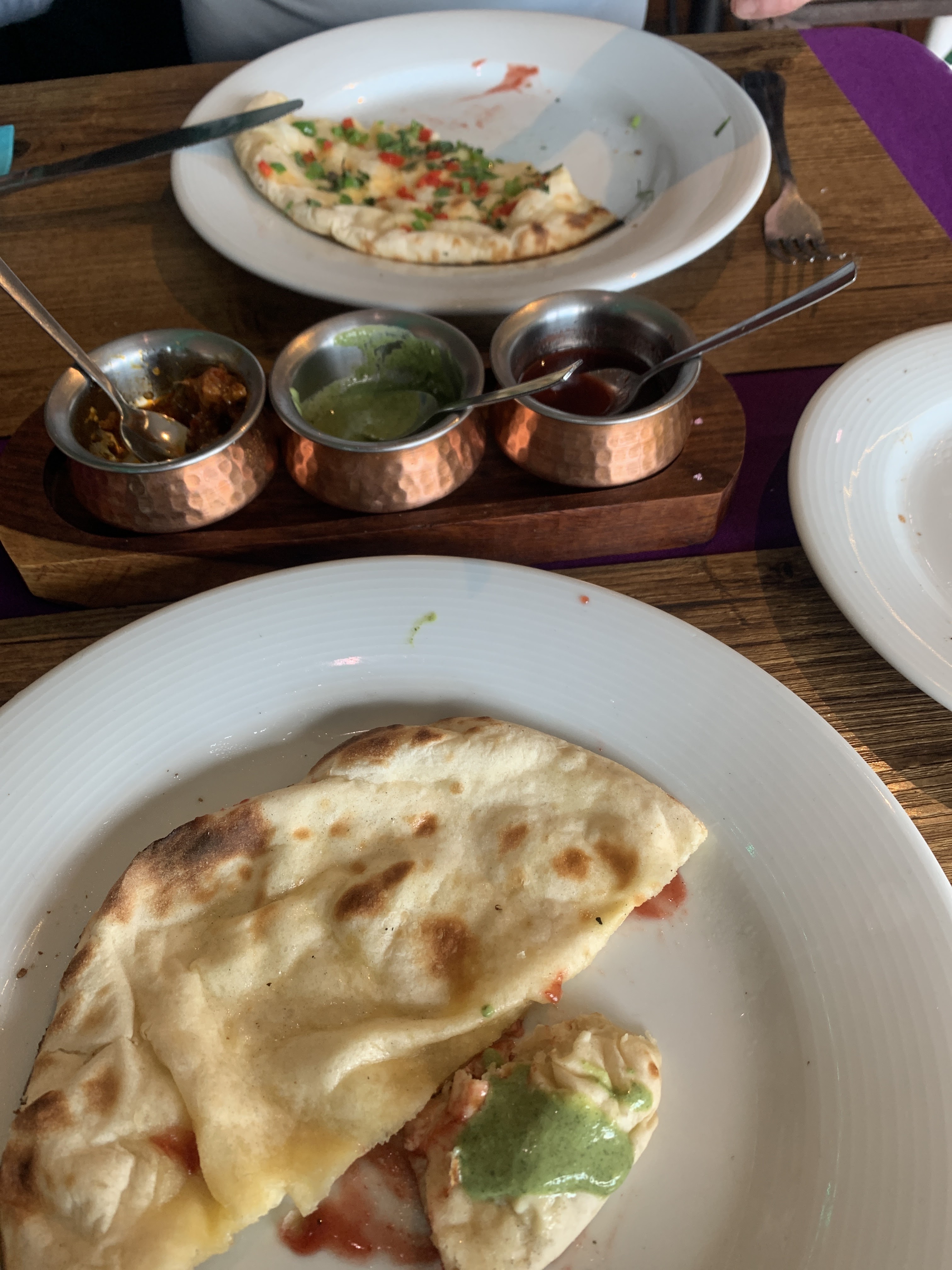 Cuisine indienne décevante, naans au fromage bof, poulet korma sauce tranchée. Gambas 4 dans l'assiette. Sans compter le prix un peu excessif