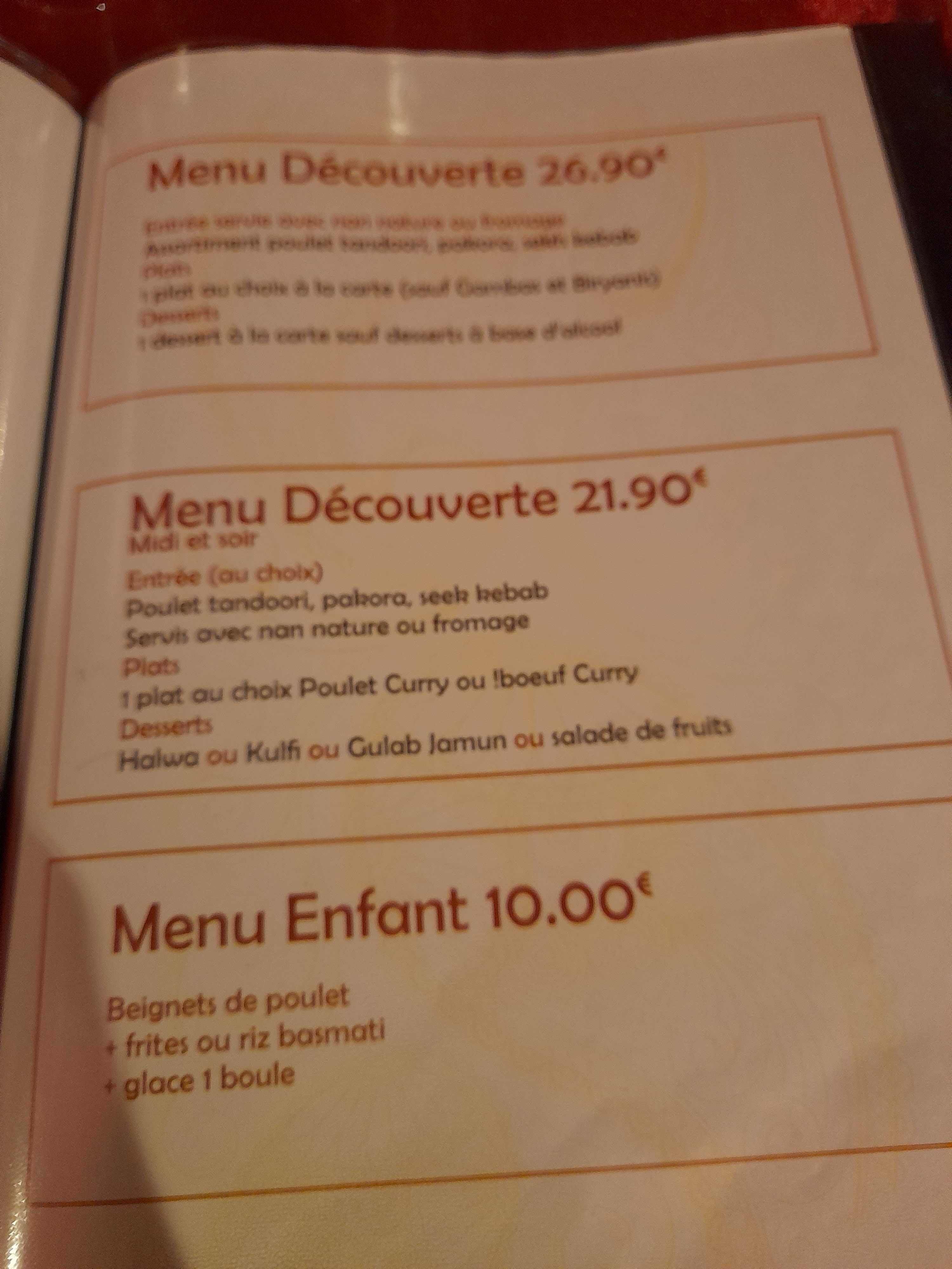 Première fois hier que je mange indien avec le menu découverte et franchement je ne suis pas déçu, la qualité était au rendez-vous et c’était très copieux pour des prix très abordable! Le service impeccable, nous reviendrons avec plaisir