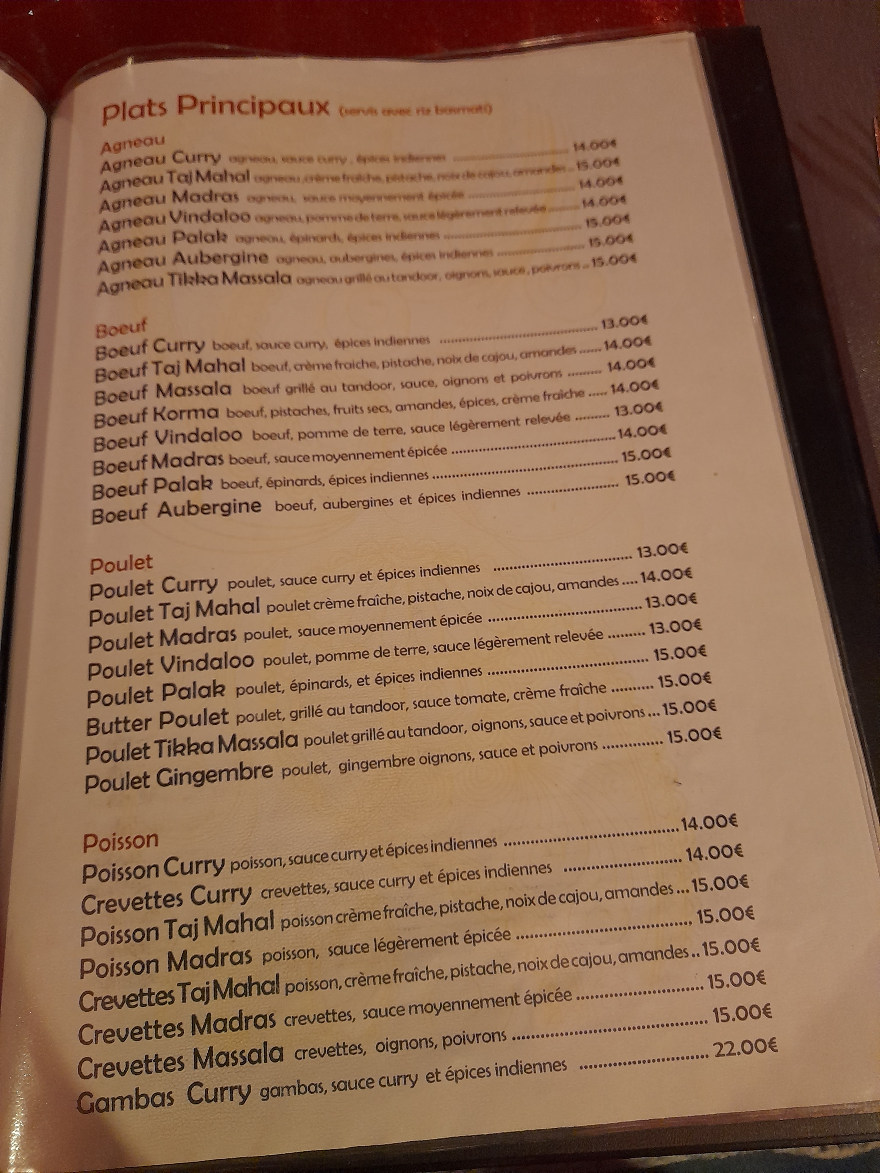 Un restaurant Indien repris dernièrement. Repas servi copieusement avec des saveurs très agréables. Service impeccable avec nombreuses sollicitations du patron pour s'enquérir du bon déroulement du repas et de nos appréciations sur celui-ci. Je recommande vivement.