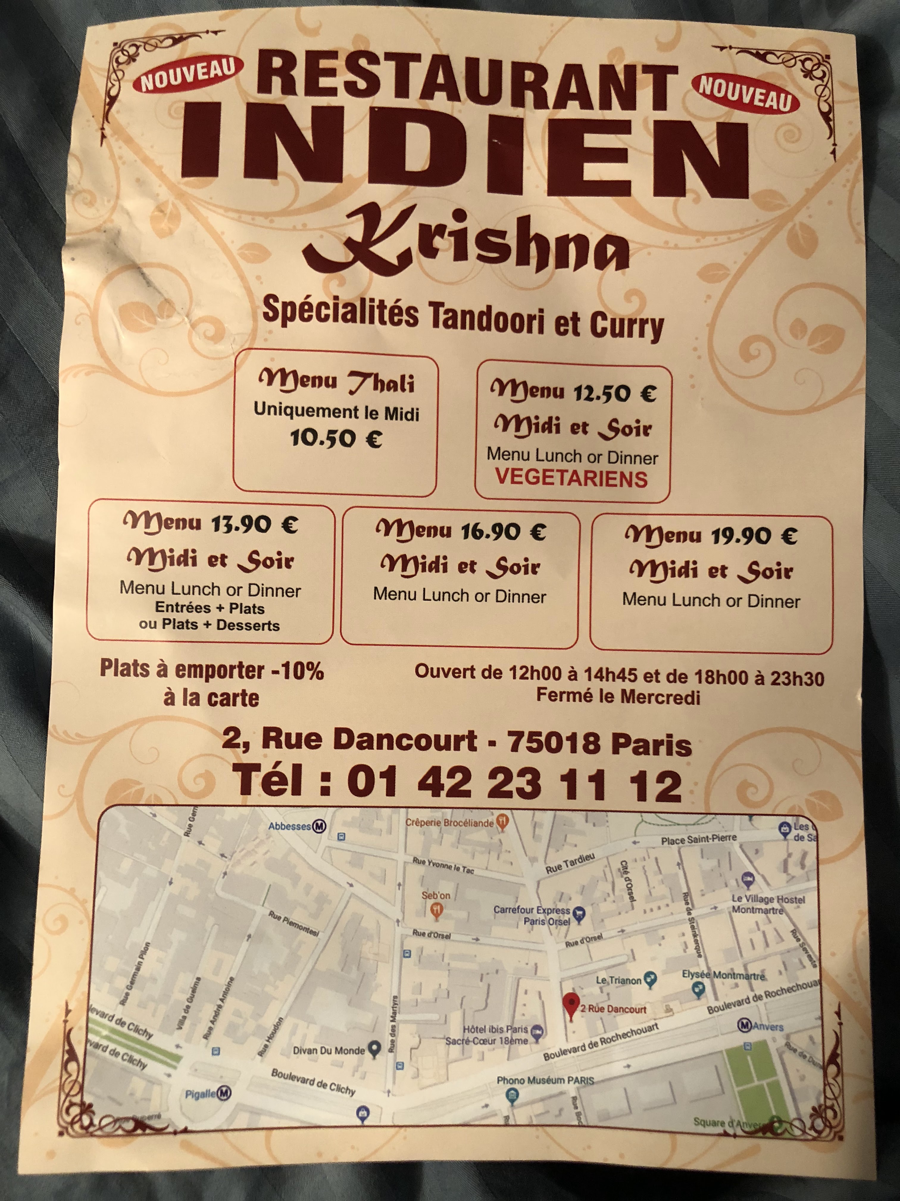 Voici toutes les informations sur le Restaurant indien Krishna qui ce trouve au 2 Rue Dancourt, 75018 Paris (75). Sur cette fiche vous trouverez les photos, l'adresse, les horaires d'ouverture, le numero de téléphone et les avis clients.Vous pouvez églement rédiger un avis si vous le souhaitez en bas de page.