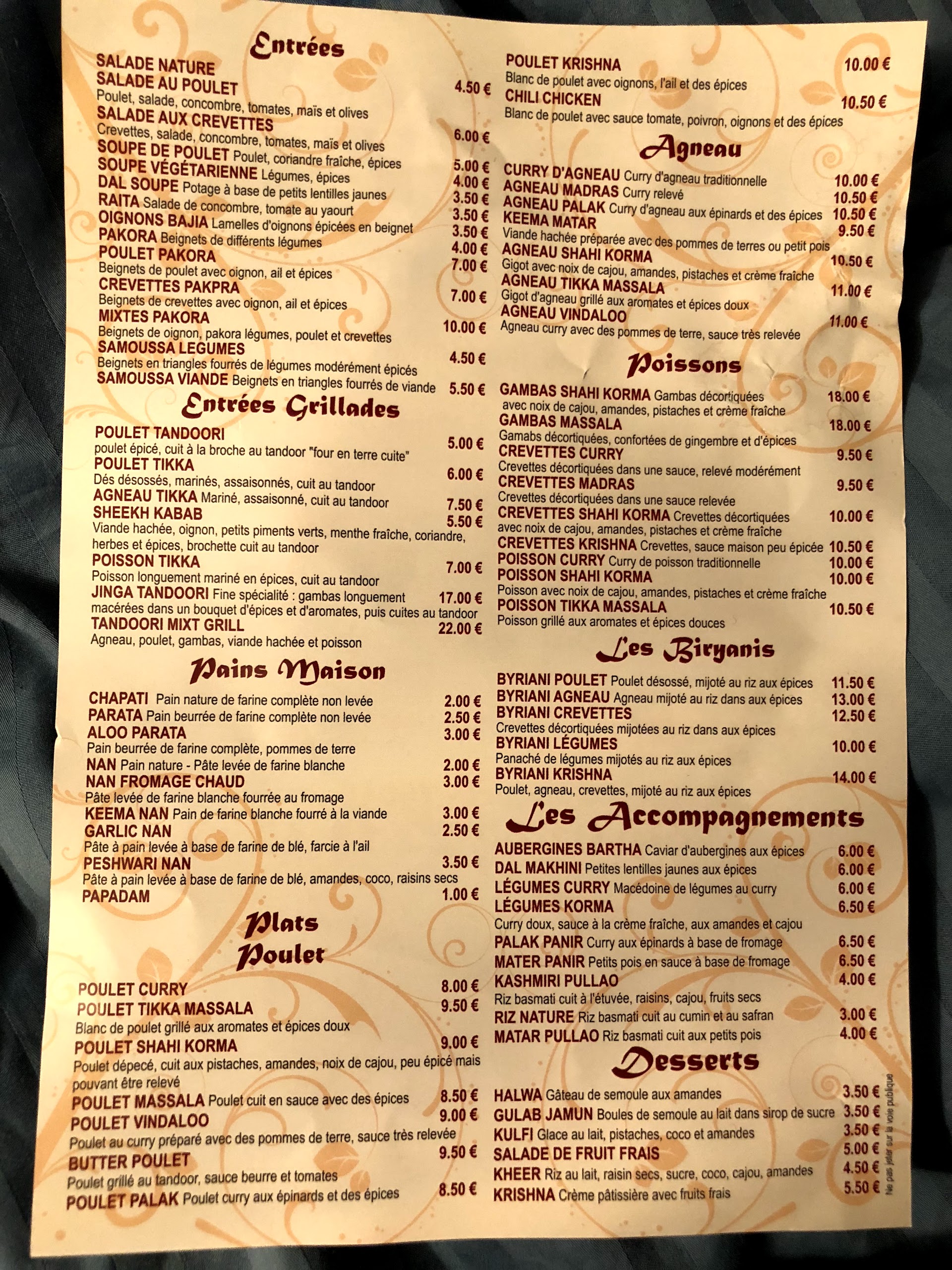 Après un concert le 8 décembre 2018, nous y sommes alles à 22h40. Nous avons vraiment très bien manger. Le poulet au curry et les épinards sont délicieux et mon compagnon a pris du poulet tandoori un régal. Le serveur toujours au petit soin. Très souriant. Vraiment je recommande ce restaurant : entrée + plat + coktail sans alcool : 44€ pour 2 personnes. Très bon rapport qualité prix