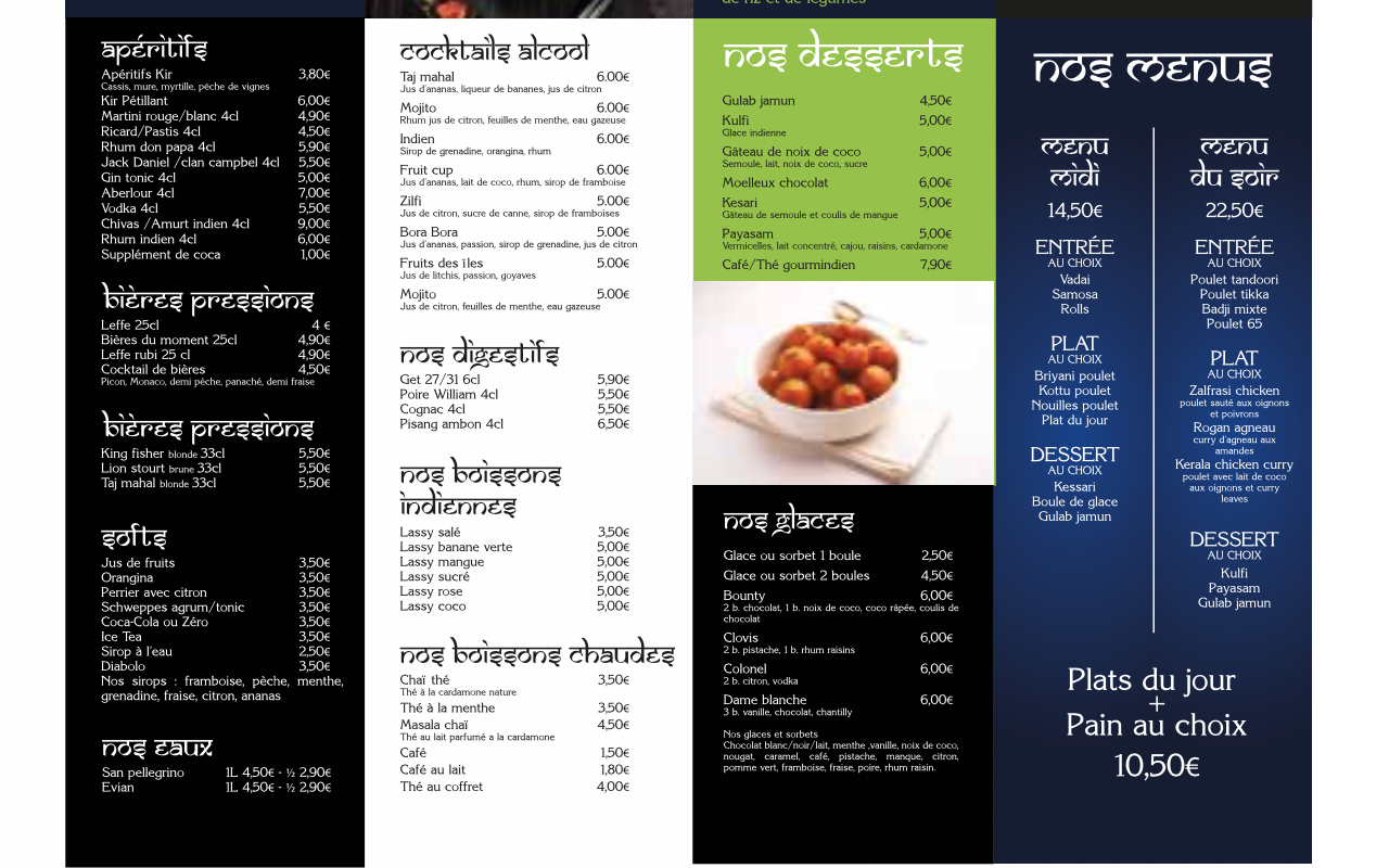 Très déçu et pour plusieurs raisons. 1 heure d'attente sur place pour une commande à emporter pour 5 personnes car le patron n'a pas voulu prendre une commande par téléphone alors que, d'après la serveuse, c'était possible. LA QUALITÉ : le pire resto indien à ma connaissance, fromage inexistant dans les naans, le riz aux 'fruits' est une blague, pire une honte, ils ne savent pas ce que ça doit être. Les plats emportés, non notés sont méconnaissables, les quantités de viandes baignées dans leurs sauces sont dérisoires. C'est une atteinte à la réputation des spécialités de leur pays, A FUIR.