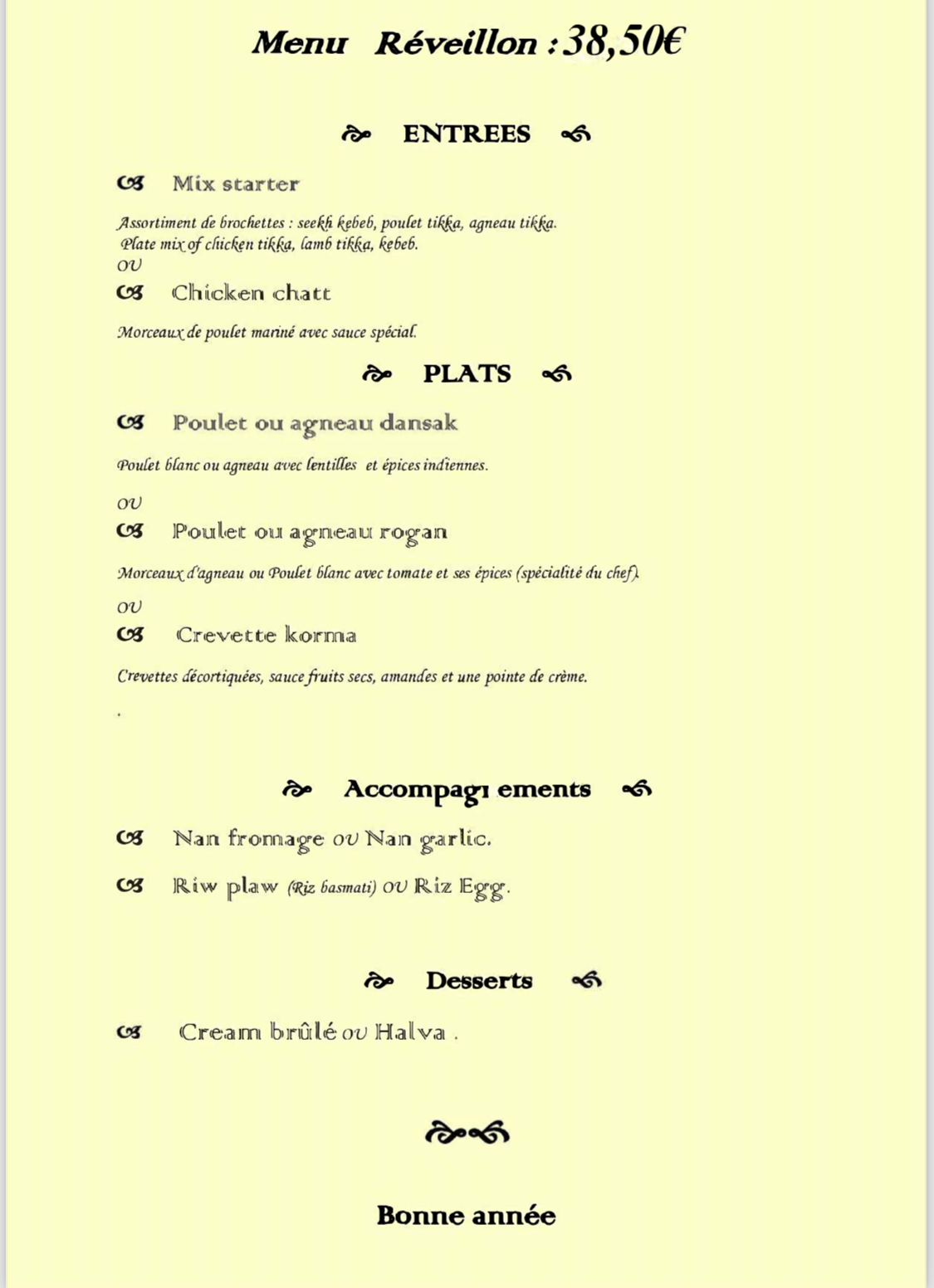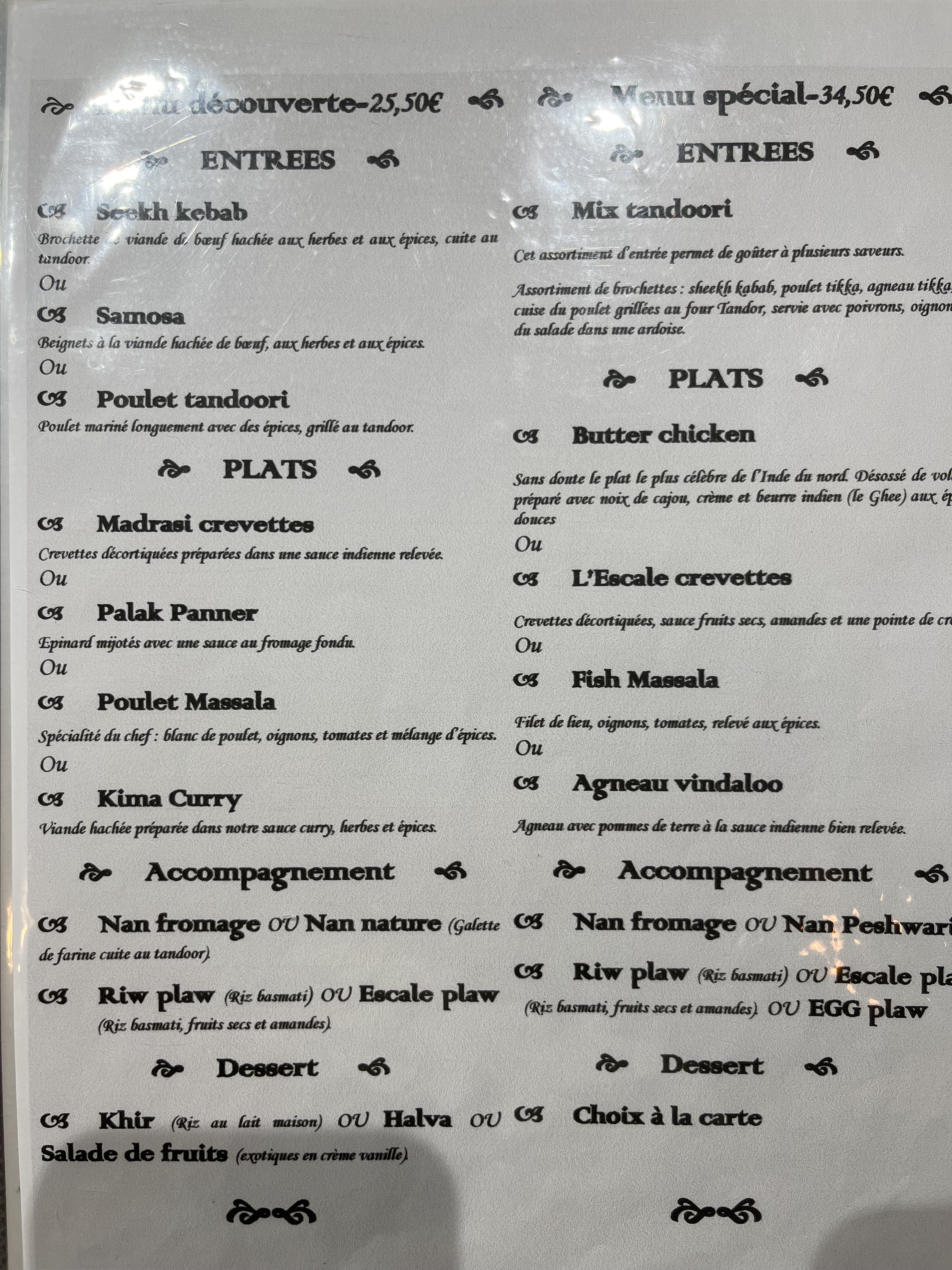 Excellent ! Nous n'avons pas été déçus de notre choix. Les mets sont succulents, la présentation soignée, le service tout en discrétion et professionnalisme indien, les prix sont corrects au regard de la qualité et quantité des plats, je recommande vivement !