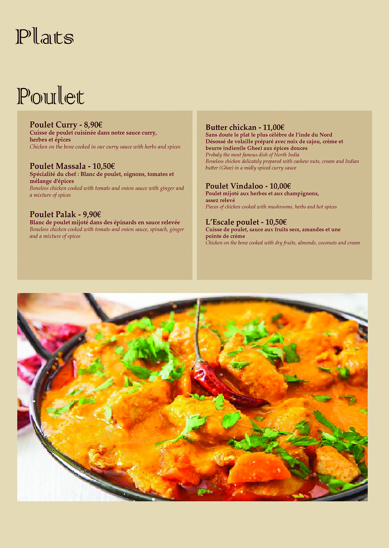 Poulet massala sans épices, nous n’avons pas retrouvé le goût du curry ainsi que le poulet trop cuit. Butter chicken sauce hyper sucrée sans épicé non plus.