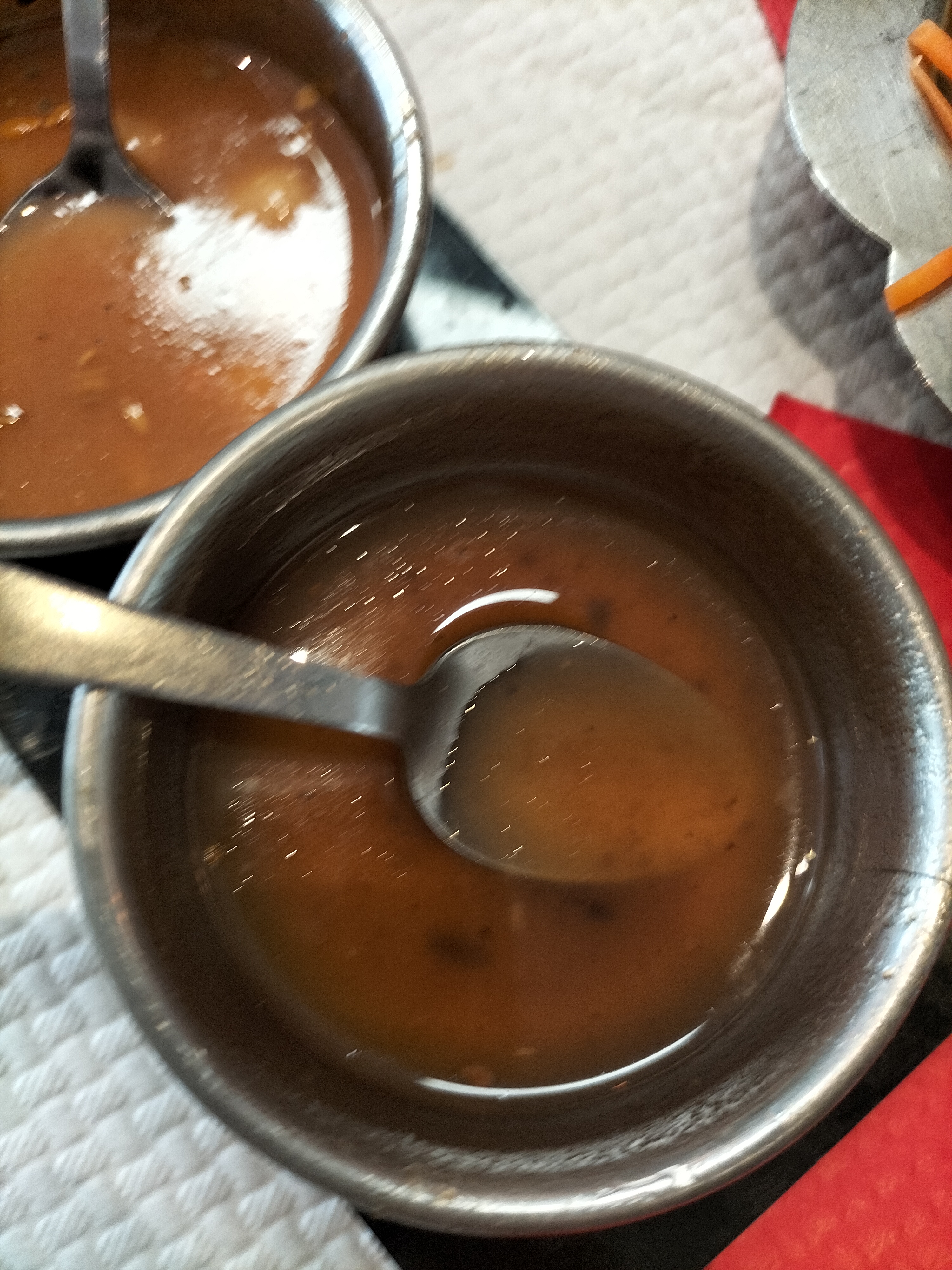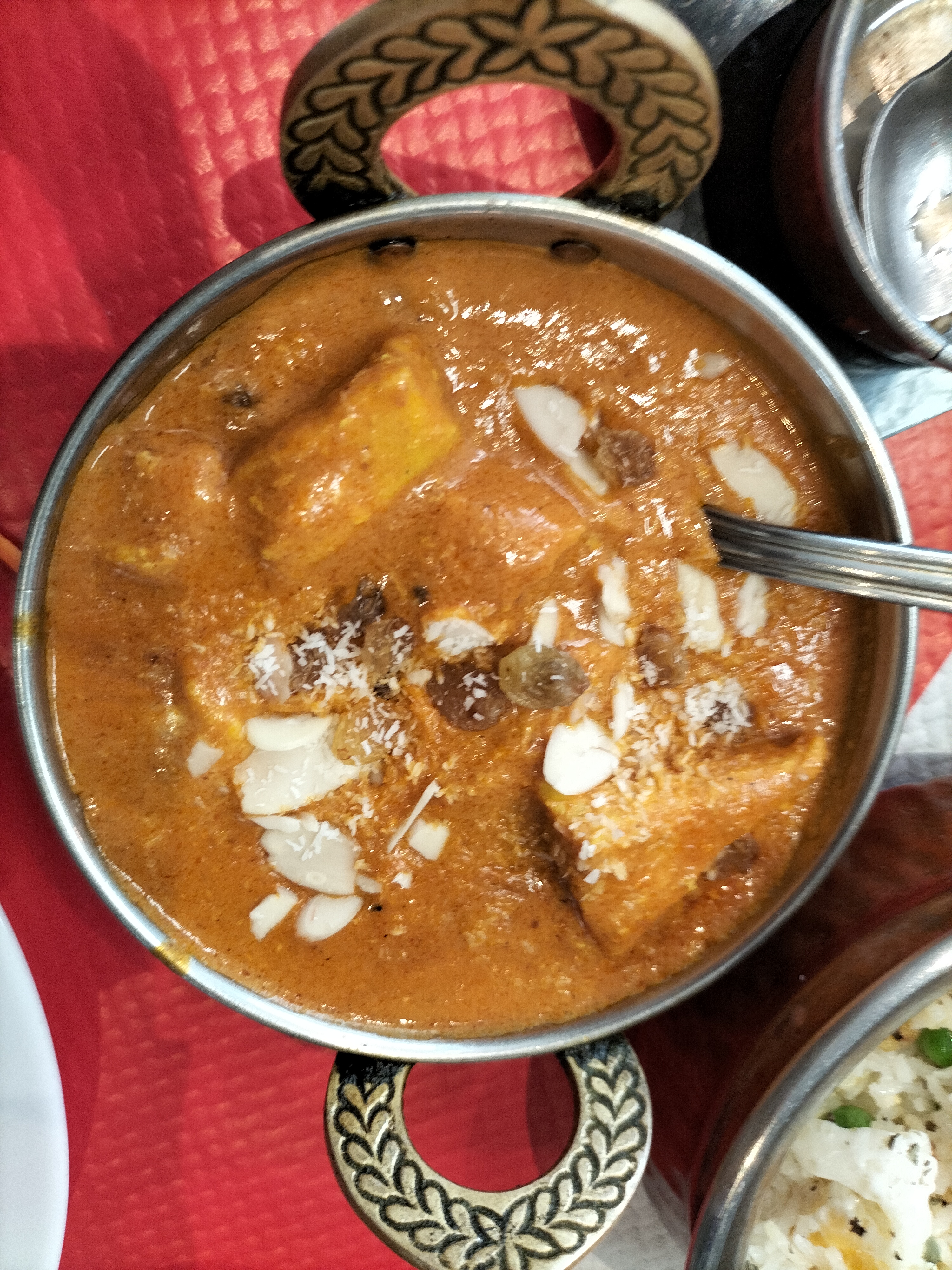Malheureusement, le panneau à l’entrée qui donne les prix du menu du midi et des plats au choix à emporter « omet » gentiment de préciser que le prix du riz sera à ajouter au prix affiché. Le butter chicken était plutôt insipide et le palak paneer était servi avec une unique portion de vache-qui-rit (?) Malgré un gérant sympathique et du riz plutôt bon, cela reste mangeable mais oubliable.