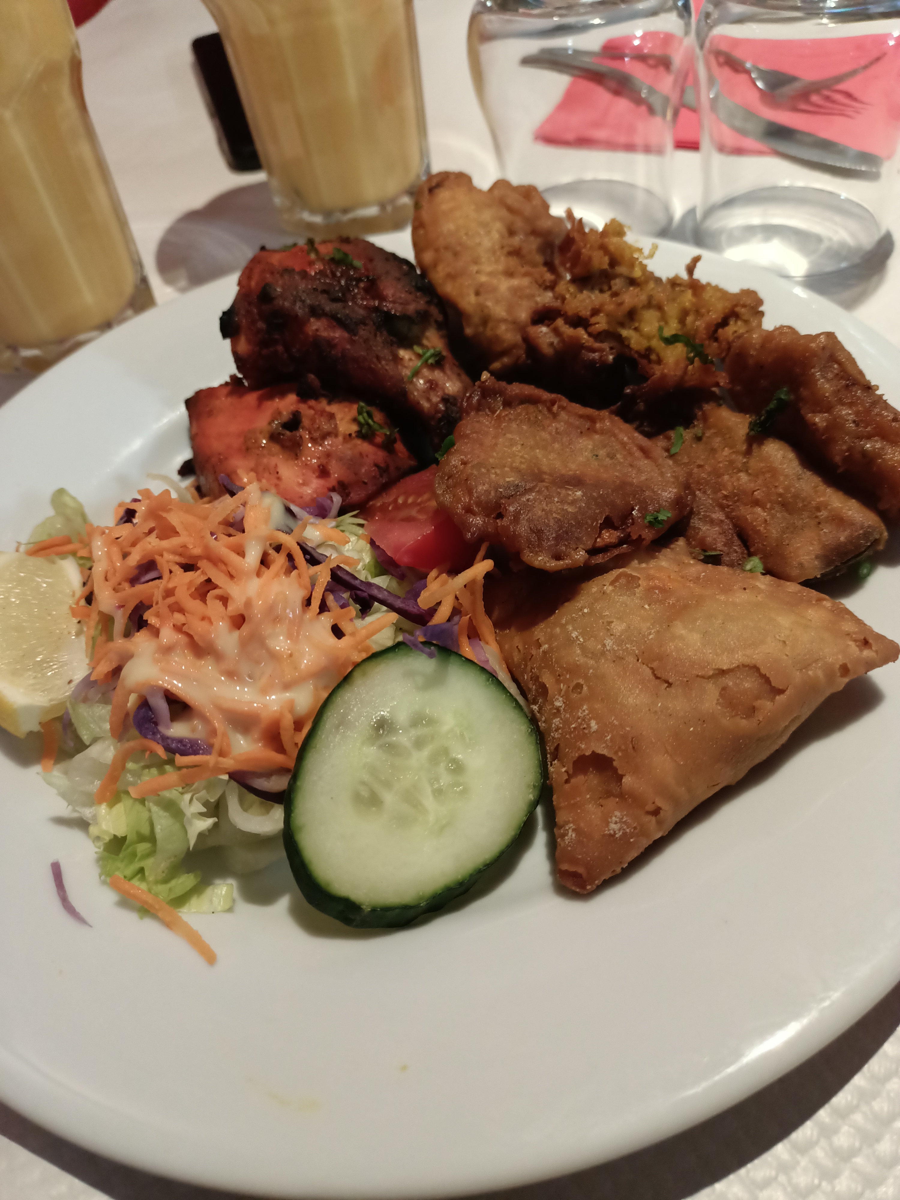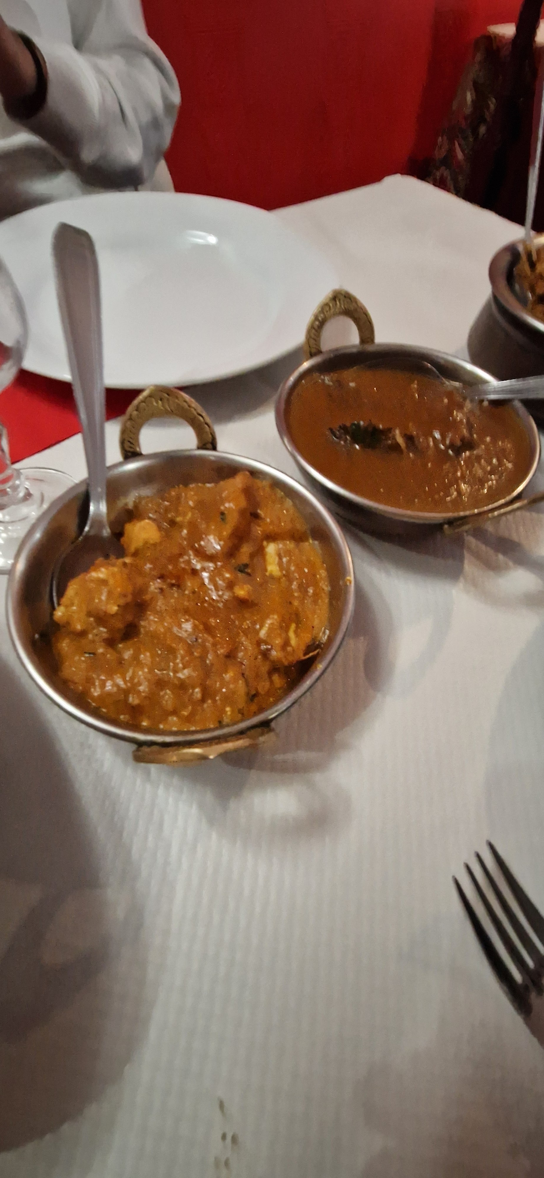 Super restaurant indien. J'ai apprécier le choix varié des plats. LA femme qui nous as accueillis est ADORABLE à souhait, nous sommes venus prendre à emporter et elle nous as offert l'apéritif pendant l'attente (voir photo). Dans le sac de commande on a eu la bonne surprise d'avoir des bonbons et deux petits desserts dont j'ignore le nom. Nous avons beaucoup aimé, c’était bien garni et à un prix tellement correct, une soixantaine d'euros pour 3 personne : 3 plats dont deux avec agneau (donc une viande chère), le riz qui accompagne et 3 naans fromage. Tout était délicieux j'y retournerai avec plaisir !