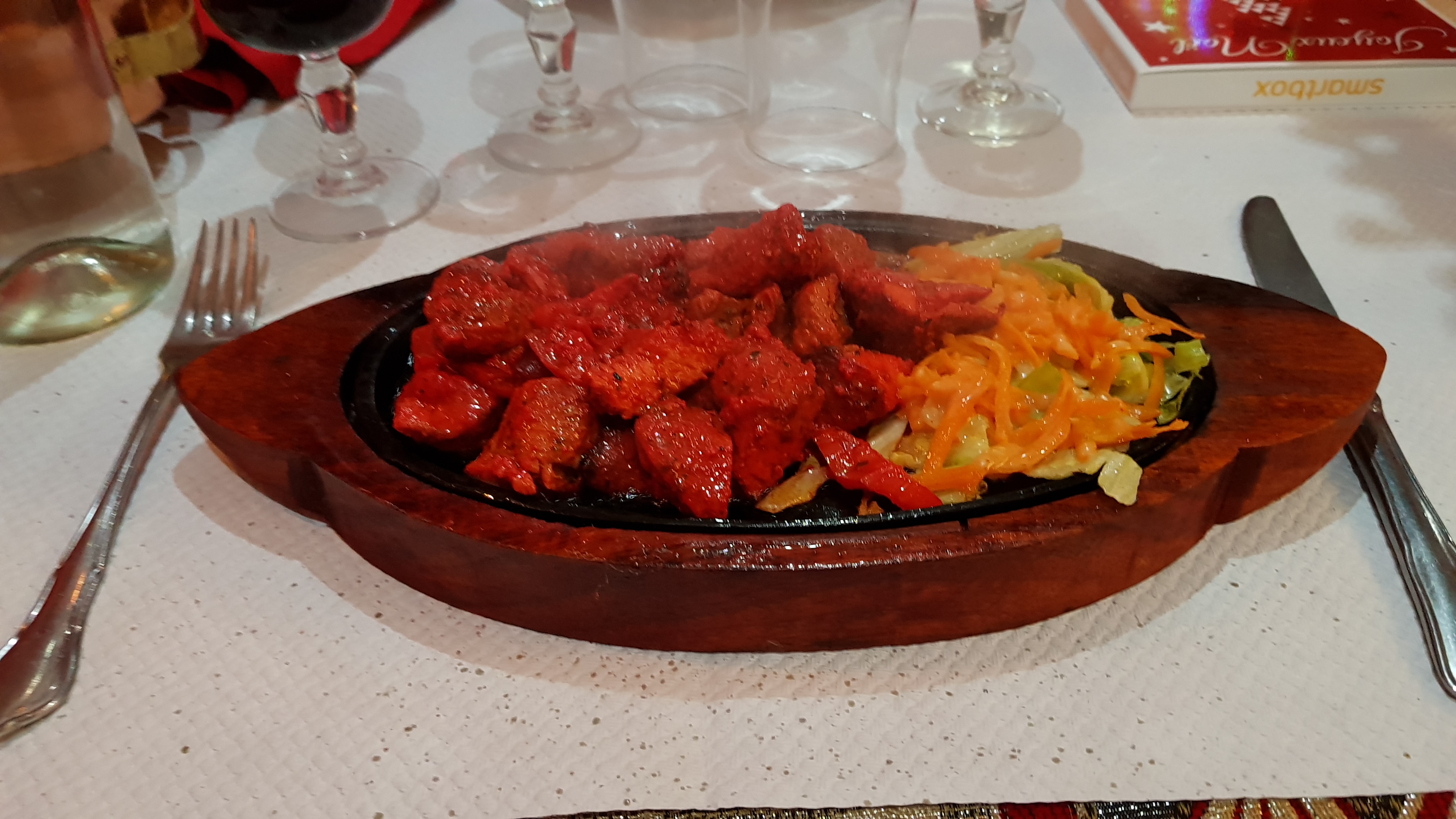 Nous avons trouvé l'accueil peu chaleureux, nous avions une smartbox le choix etait limité, le restautant ayant deja instauré un menu special box pre-defini qui laisse peu de choix, on a du rajouter pour les boissons et pour le pain indien. Les plats etaient peu épicés, pas très chaud et pas à notre goût par rapport aux experiences que nous avons déjà eu dans d'autres restaurants indiens. En conclusion nous avons été déçu de l'accueil, du repas et du fait d'avoir eu froid durant le repas par manque de chauffage. Nous n'y retournerons pas.
