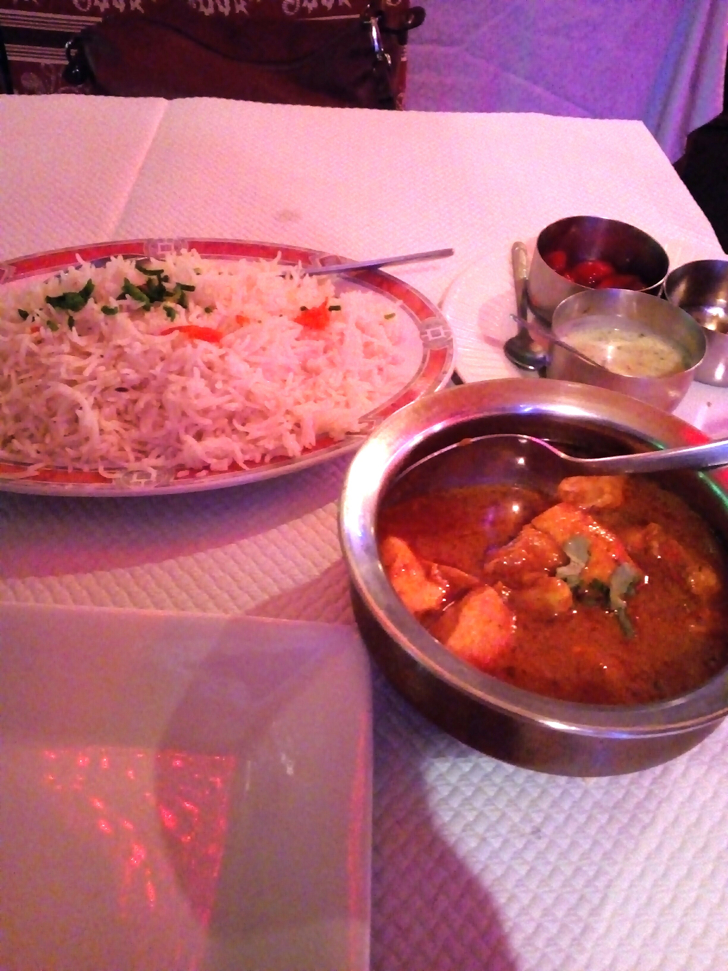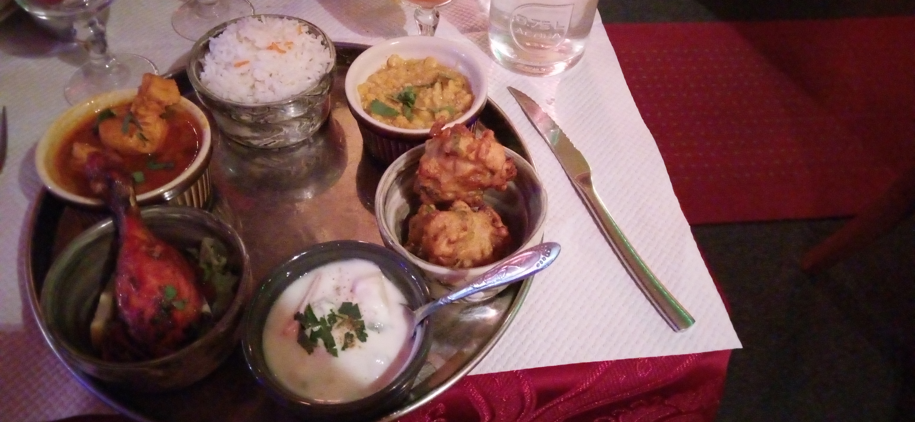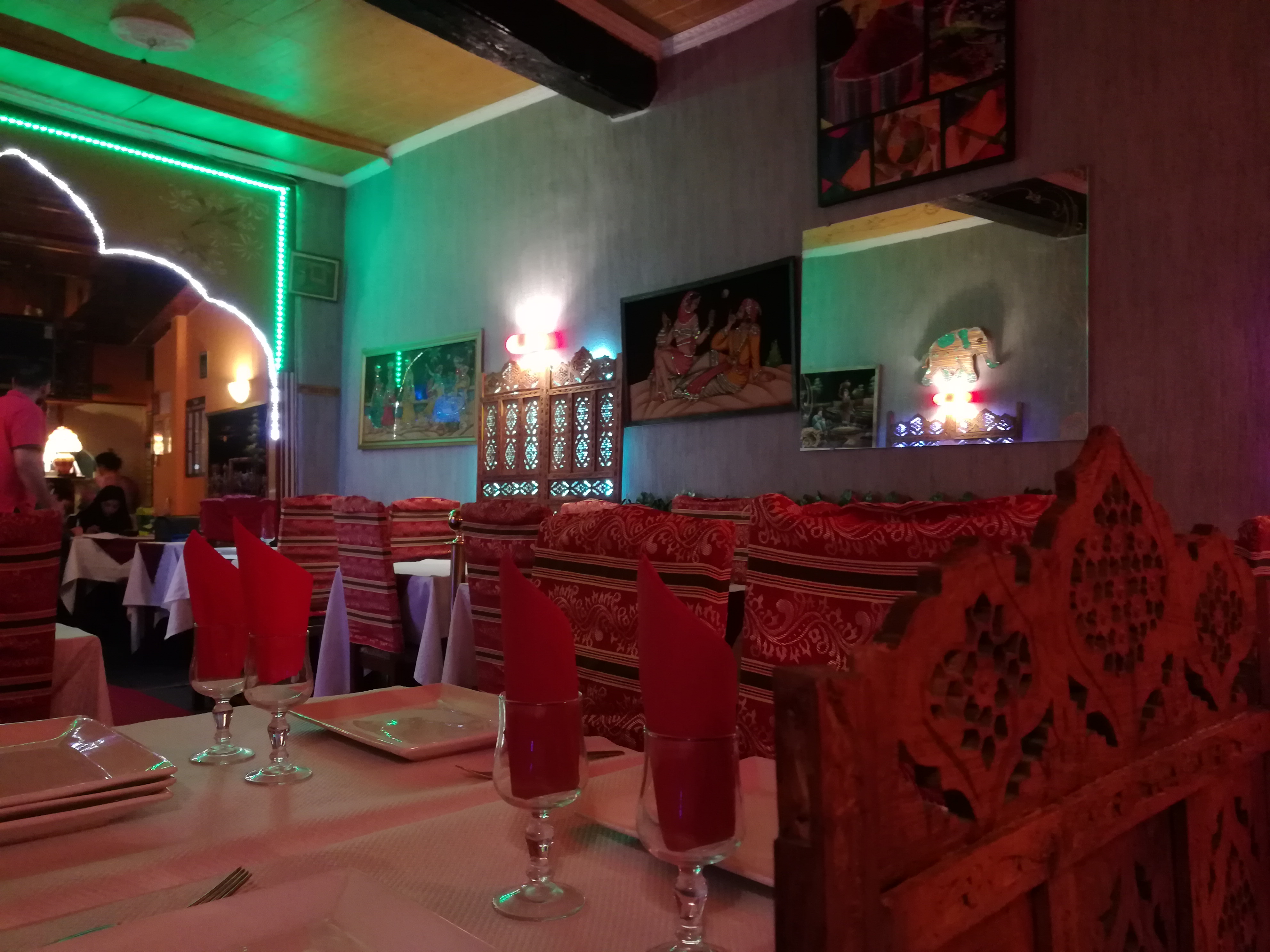 Salle chaleureuse, et bon accueil. Le service un peu trop rapide pour nous, le plat est servi alors que nous n avons pas terminé l entrée. Le byriani aux légumes et le dahl végétarien sont corrects, sans plus et manquent de saveur. Bonne soirée néanmoins mais déçus de la cuisine qualifiée d excellente par certains clients.