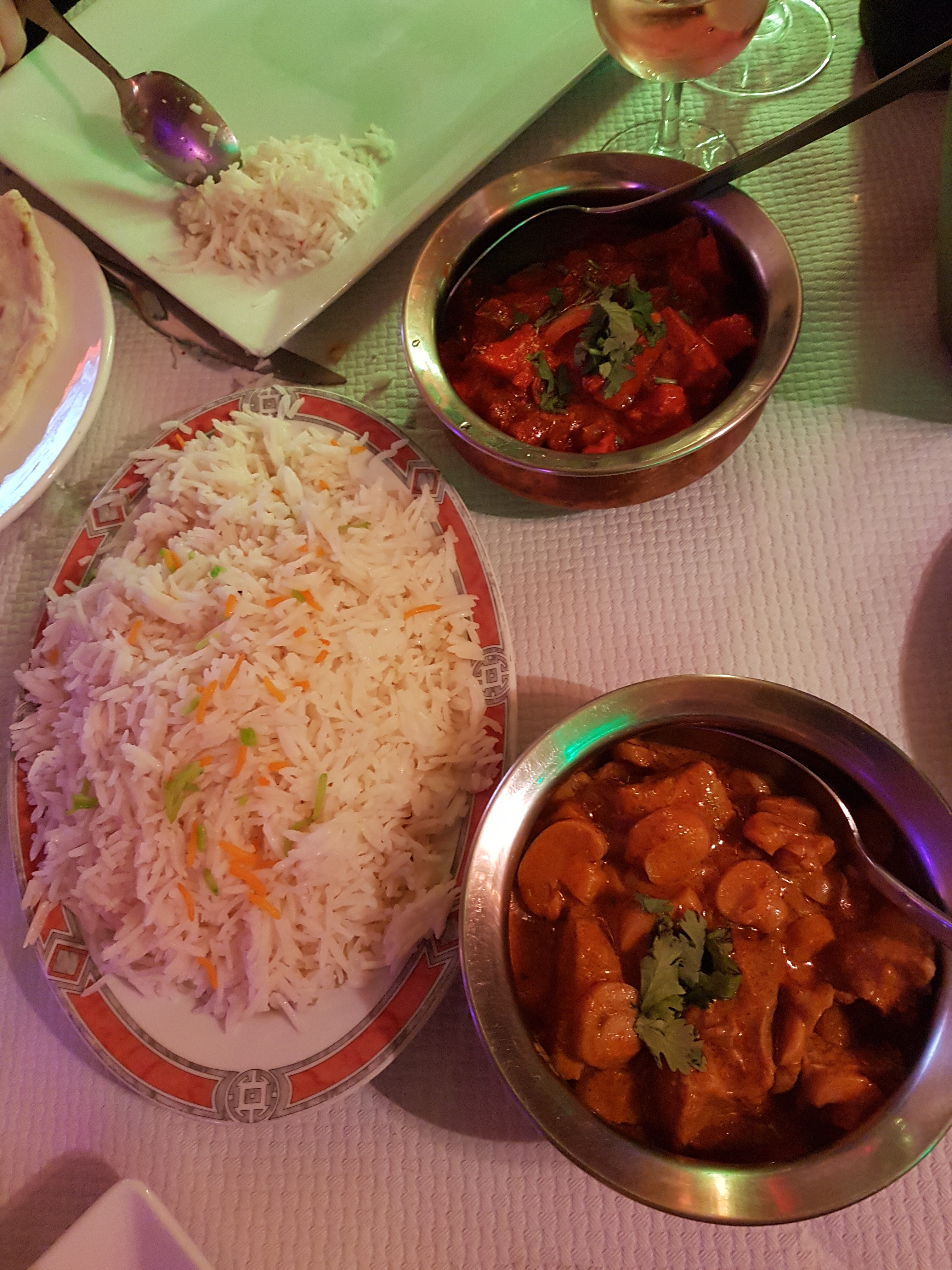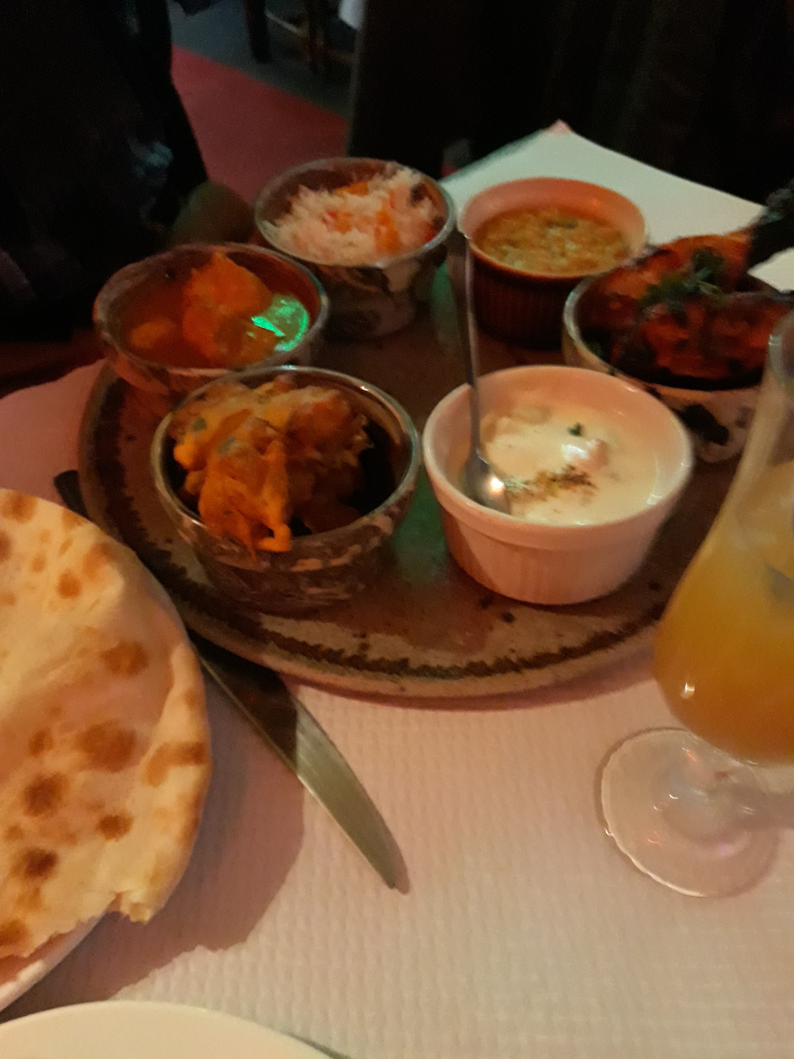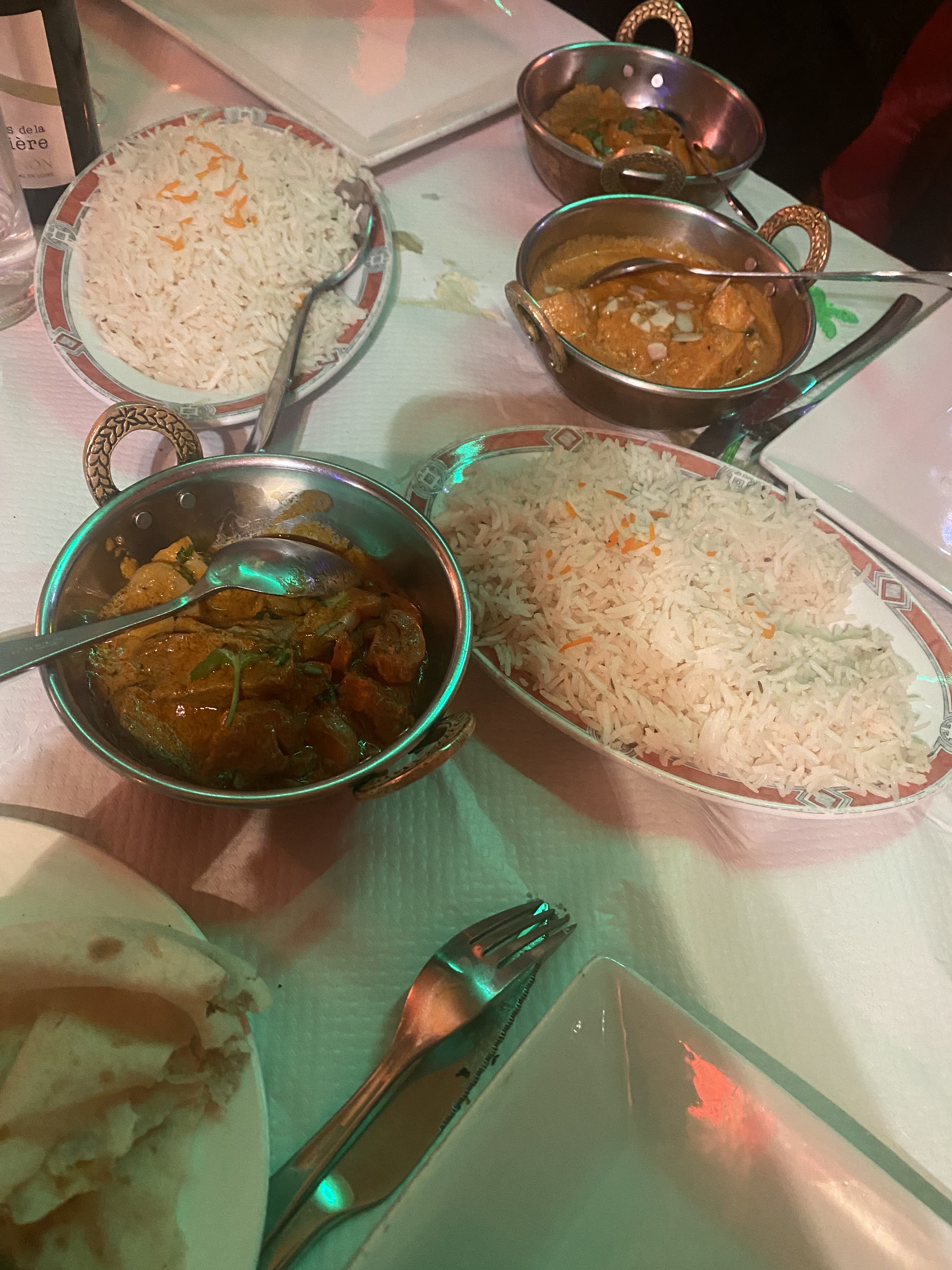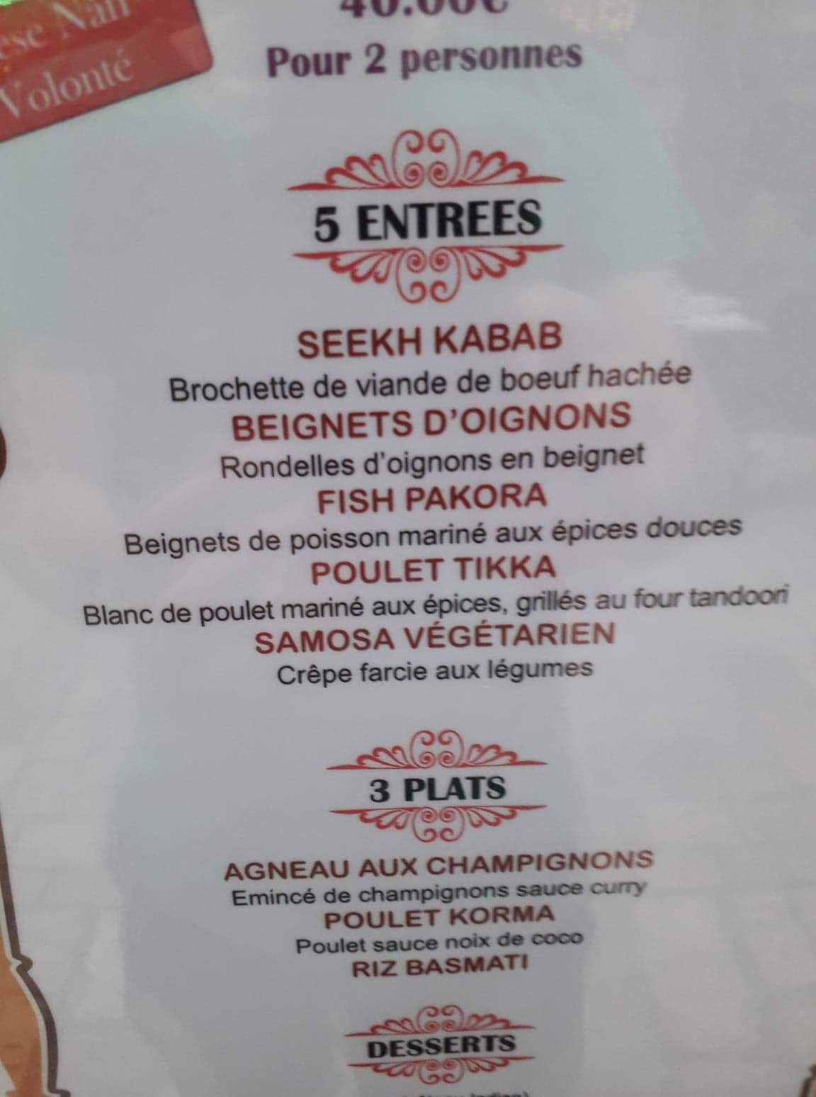 Acueil sympatique, menu dégustation pour deux personnes 40€, avec Pain cheese naan à volonté, un régal,voir menu ci dessous, très bon, Et le vin Indien sec mais avec un arrière goût de framboises en bouche, bon appétit à vous si vous vous y arrêter