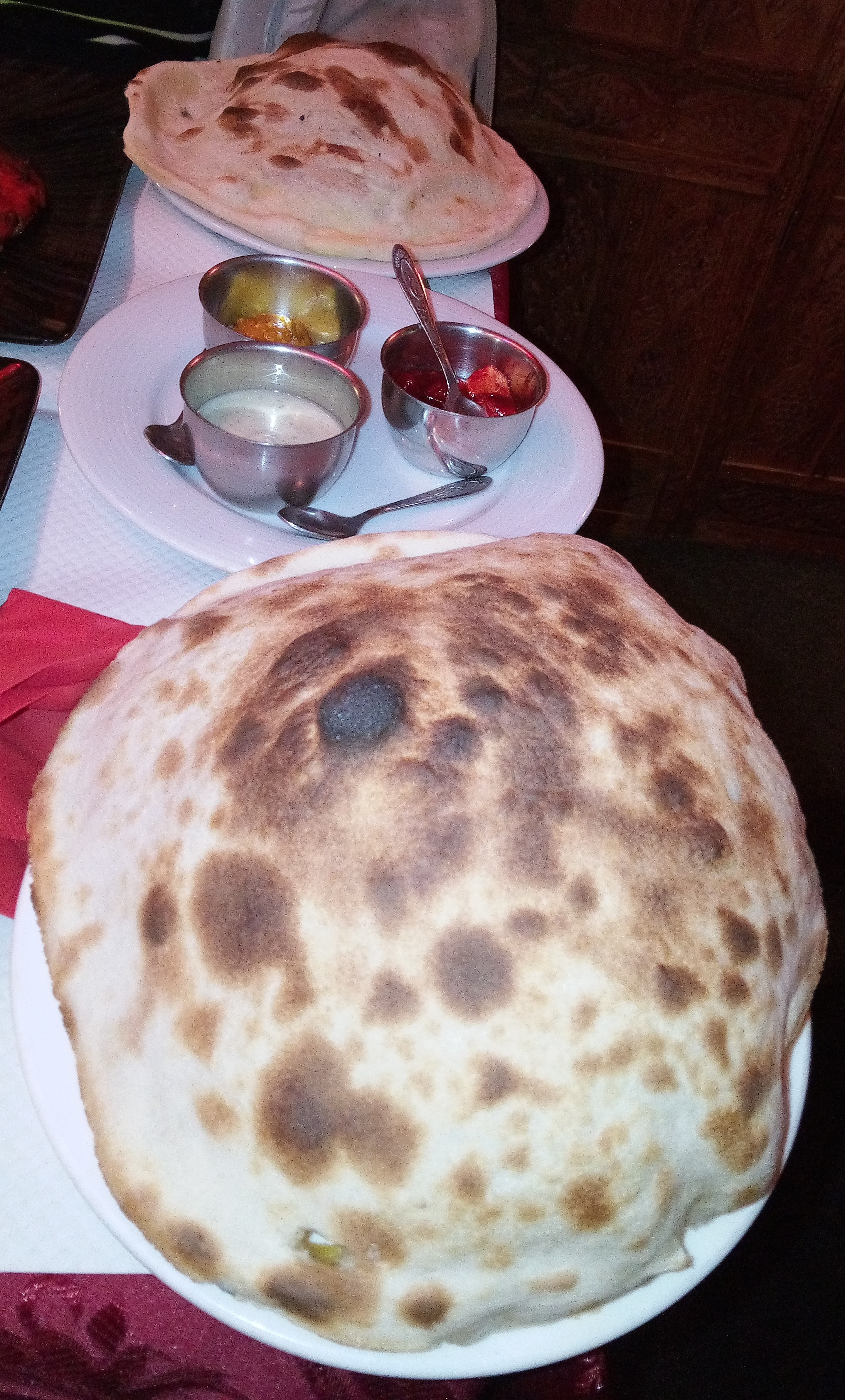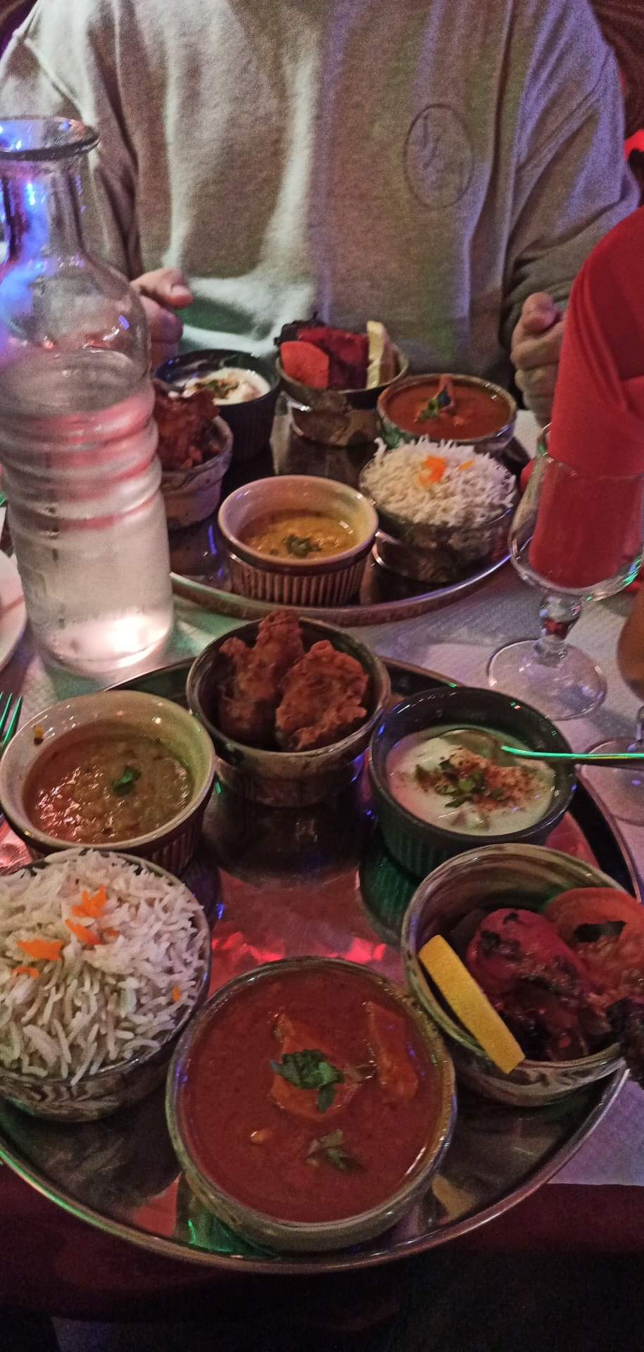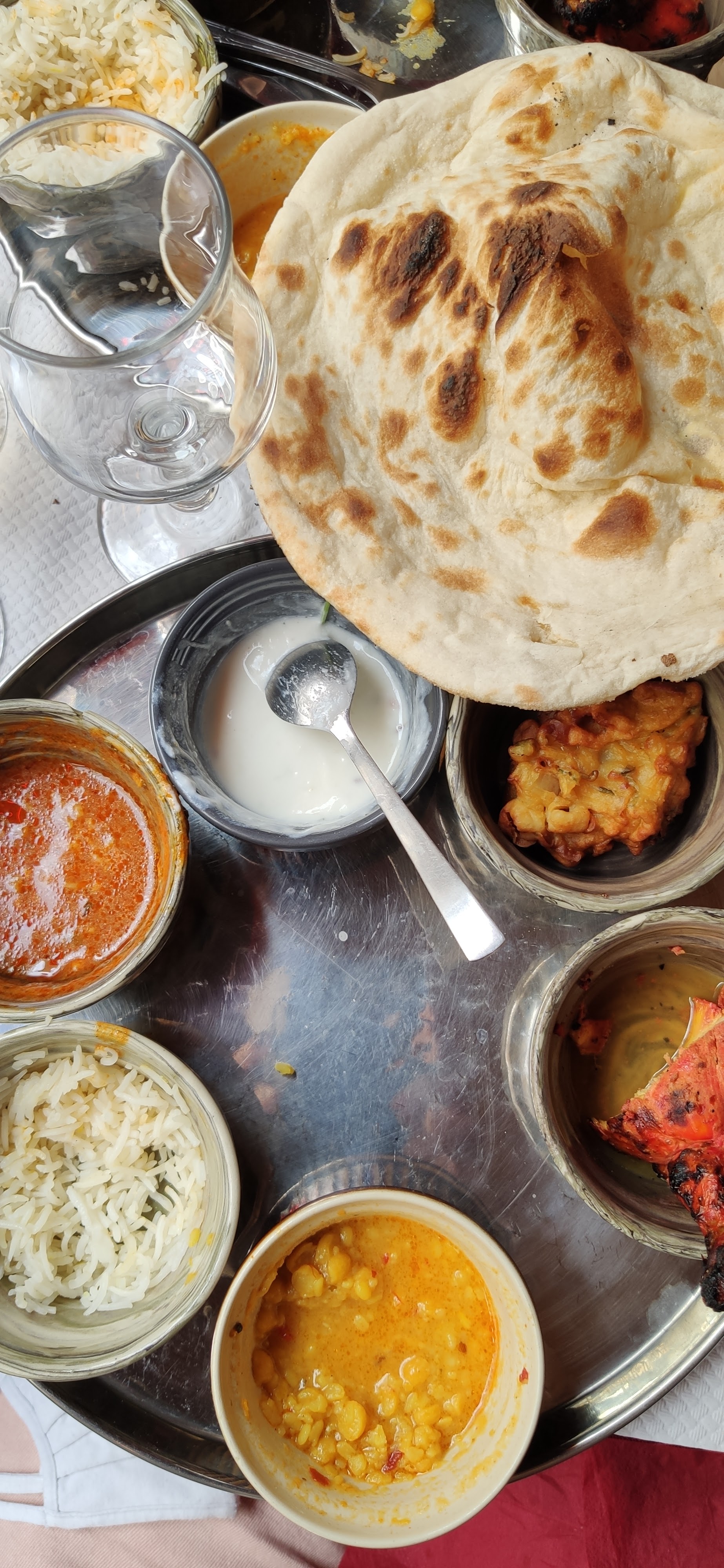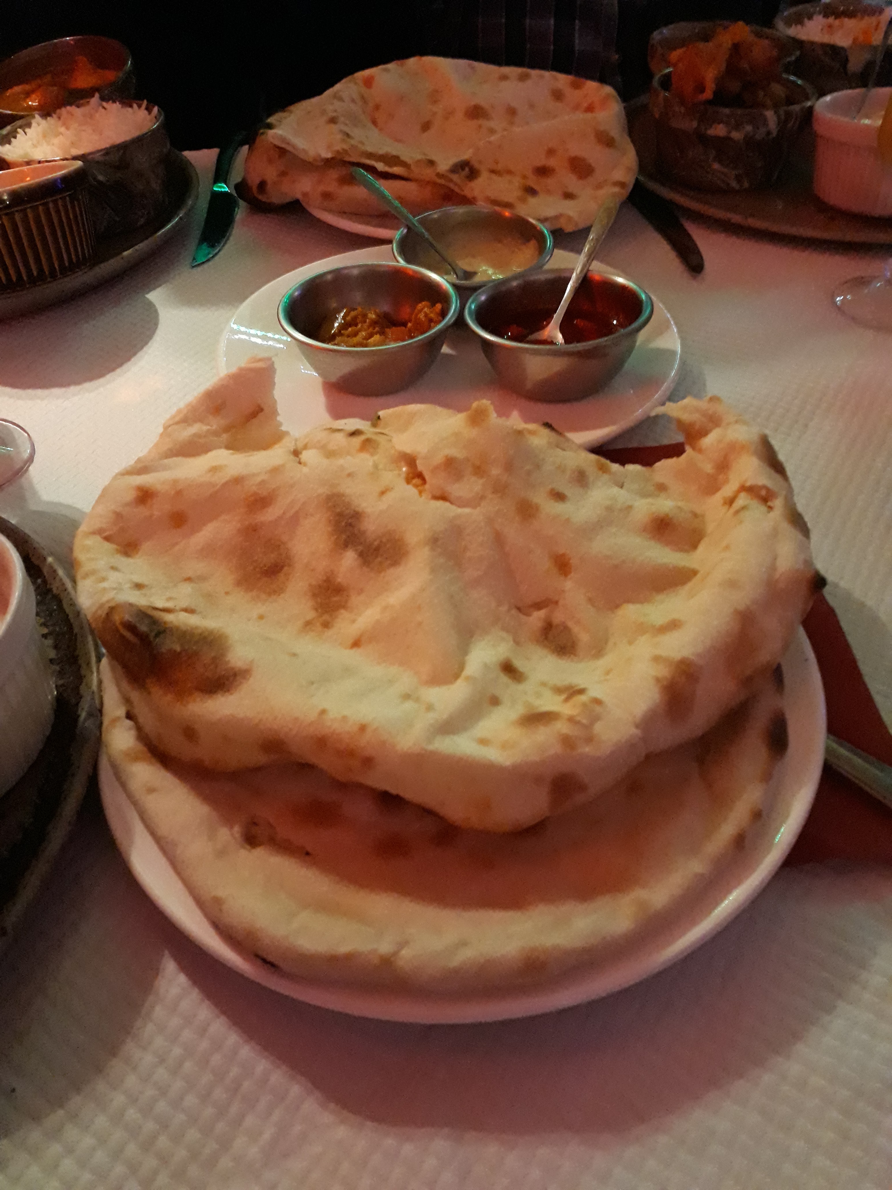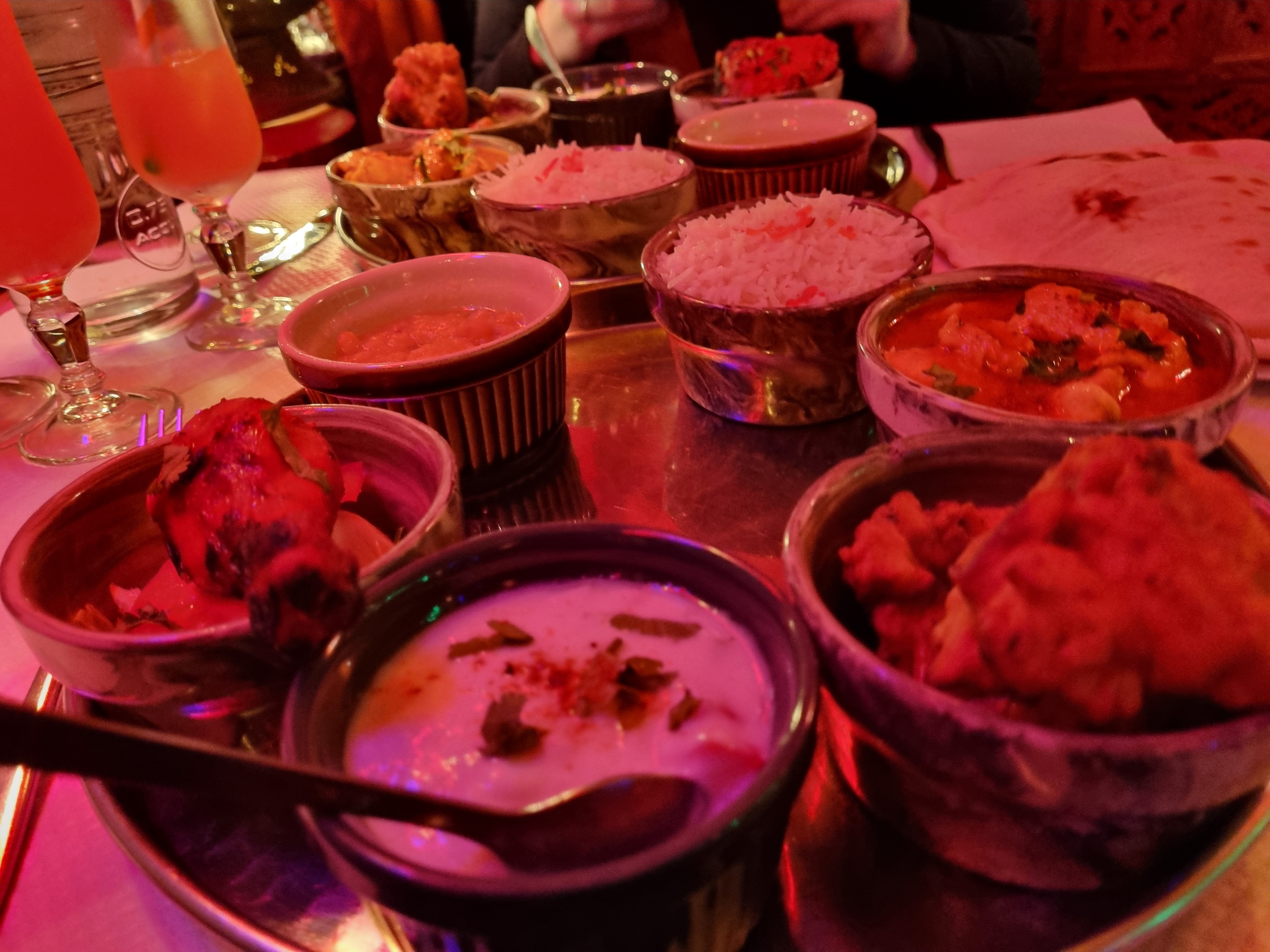 Acueil sympatique, menu dégustation pour deux personnes 40€, avec Pain cheese naan à volonté, un régal,voir menu ci dessous, très bon, Et le vin Indien sec mais avec un arrière goût de framboises en bouche, bon appétit à vous si vous vous y arrêter