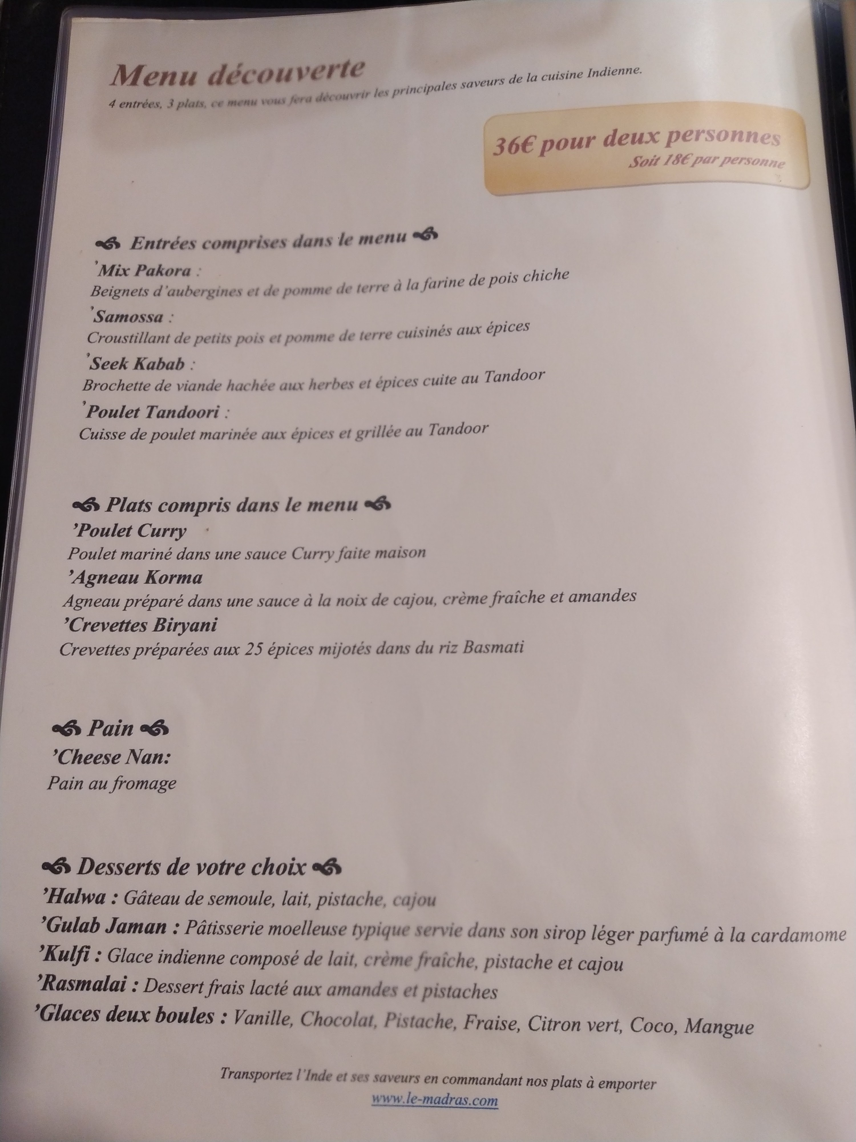 un vrai coup de cœur ! Le menu découverte (pour 2 personnes) était à la fois copieux et très savoureux. merci à la serveuse qui a été adorable et très intentionnée tout au long du repas. je vous recommande de réserver car le restaurant est victime de son succès ! Un restaurant à ne pas manquer si vous aimez la cuisine Indienne authentique.