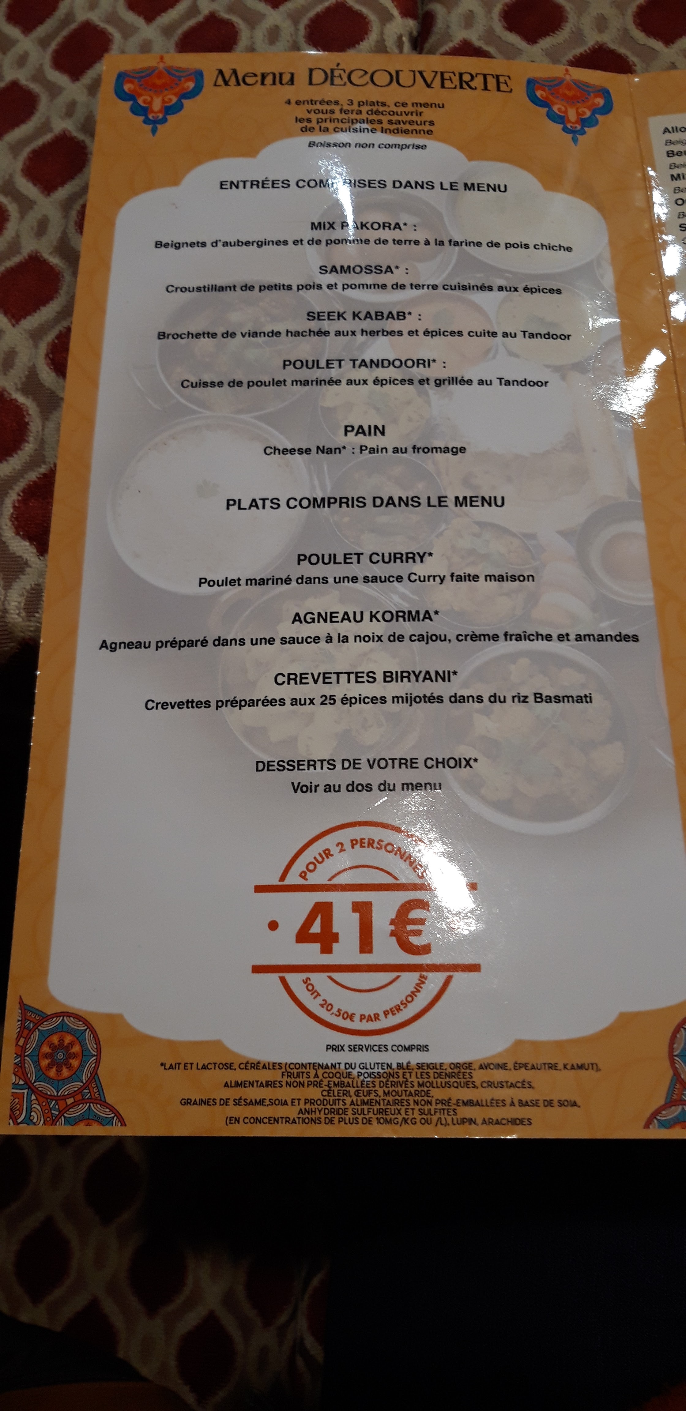 Très bien le menu ''découverte'' pour avoir un bon aperçu de la cuisine indienne... Bon rapport qualité prix 38€ pour 2 (septembre 2022).. Et en plus c'est bon et pas trop épicé.. Le restaurant n'est pas très grand, le week-end réservation fortement recommandée. Travail en famille, accueil sympathique avec les bons conseils et explications. Je recommande, refait plusieurs fois et à refaire...sur la photo le plat est déjà commencé..