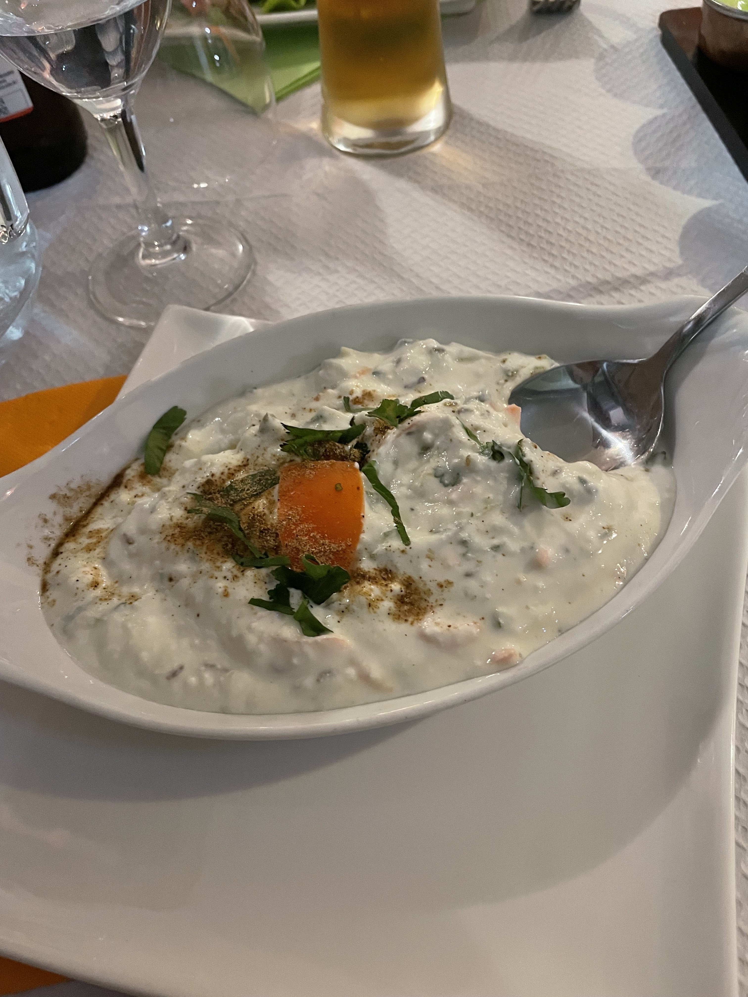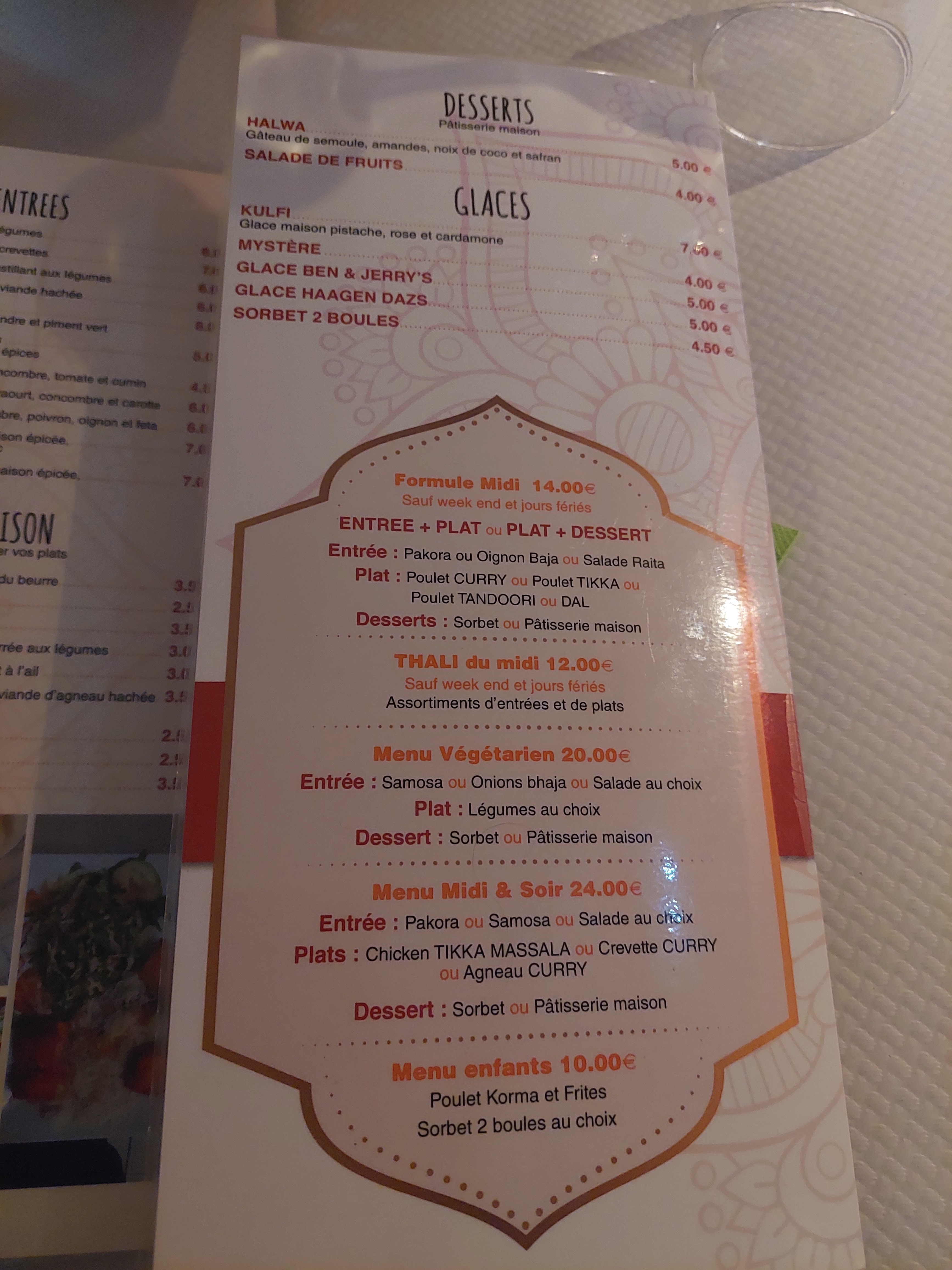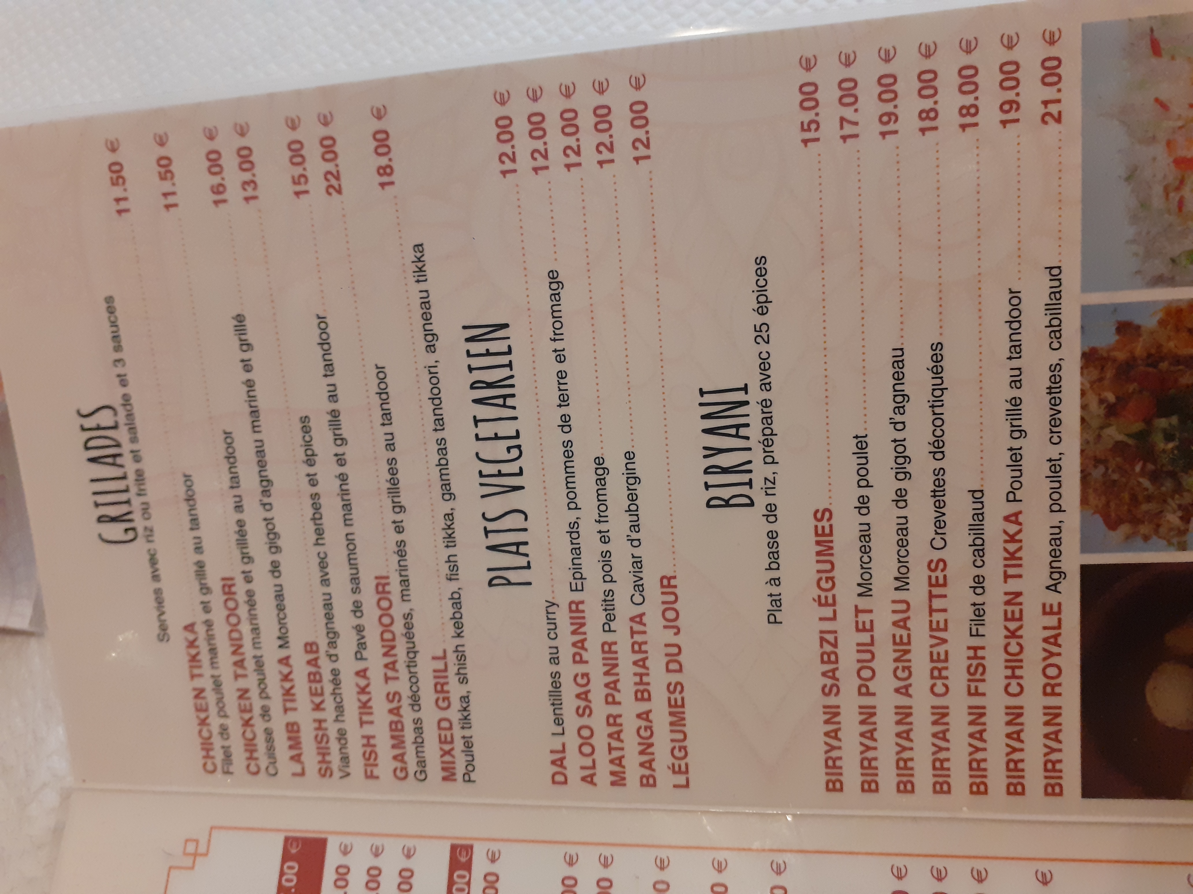 J'ai adoré les plats et les naans. À la fin un serveur est venu nous apporter un petit contenant avec des perles de sucre parfumées avec un mélange d'épices et de graines, nous avons apprécié l'attention et le gout ! Le restorant n'est pas trop cher.