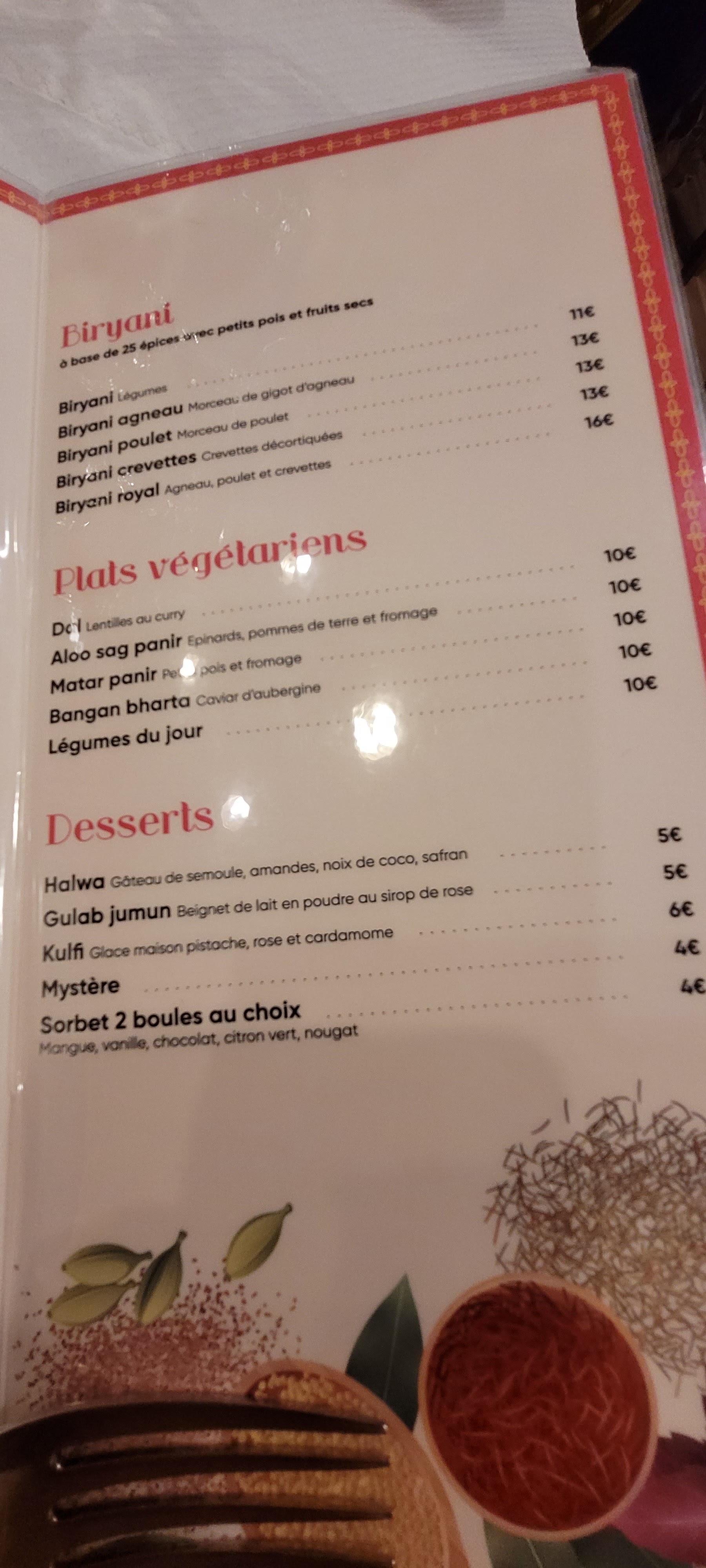 Tout d'abord le decor ne fait pas rêver Les plats bons mais déception car nous ne les avons pas trouvés parfumés Je préfère quitte à manger indien aller au Tandoori rue des 3 freres le goff où là c'est excellent : decor et mets irréprochables