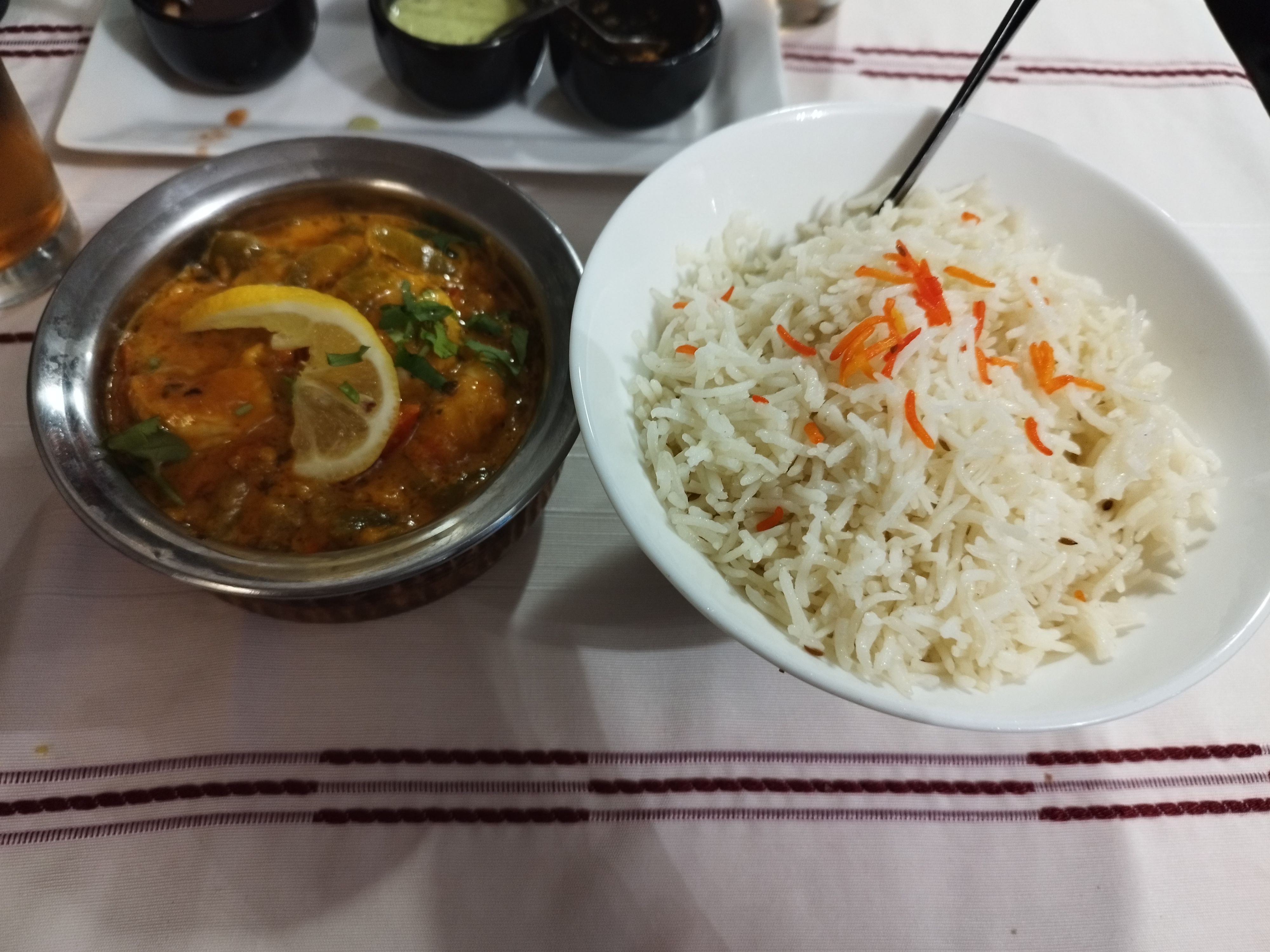 Bons petits plats indiens, je recommande le poulet tikka masala, il faut commander les légumes à part ce qui augmente le prix du plat, le riz n'est pas bon marché mais délicieux, les beignets de légumes en entrée étaient fades et farineux, les naans sont délicieux (plus petits qu'avant) bon accueil, on peut manger en une heure (entrée et plat) si on va au spectacle à côté après, il suffit de le demander au serveur. Assez bon rapport qualité/prix