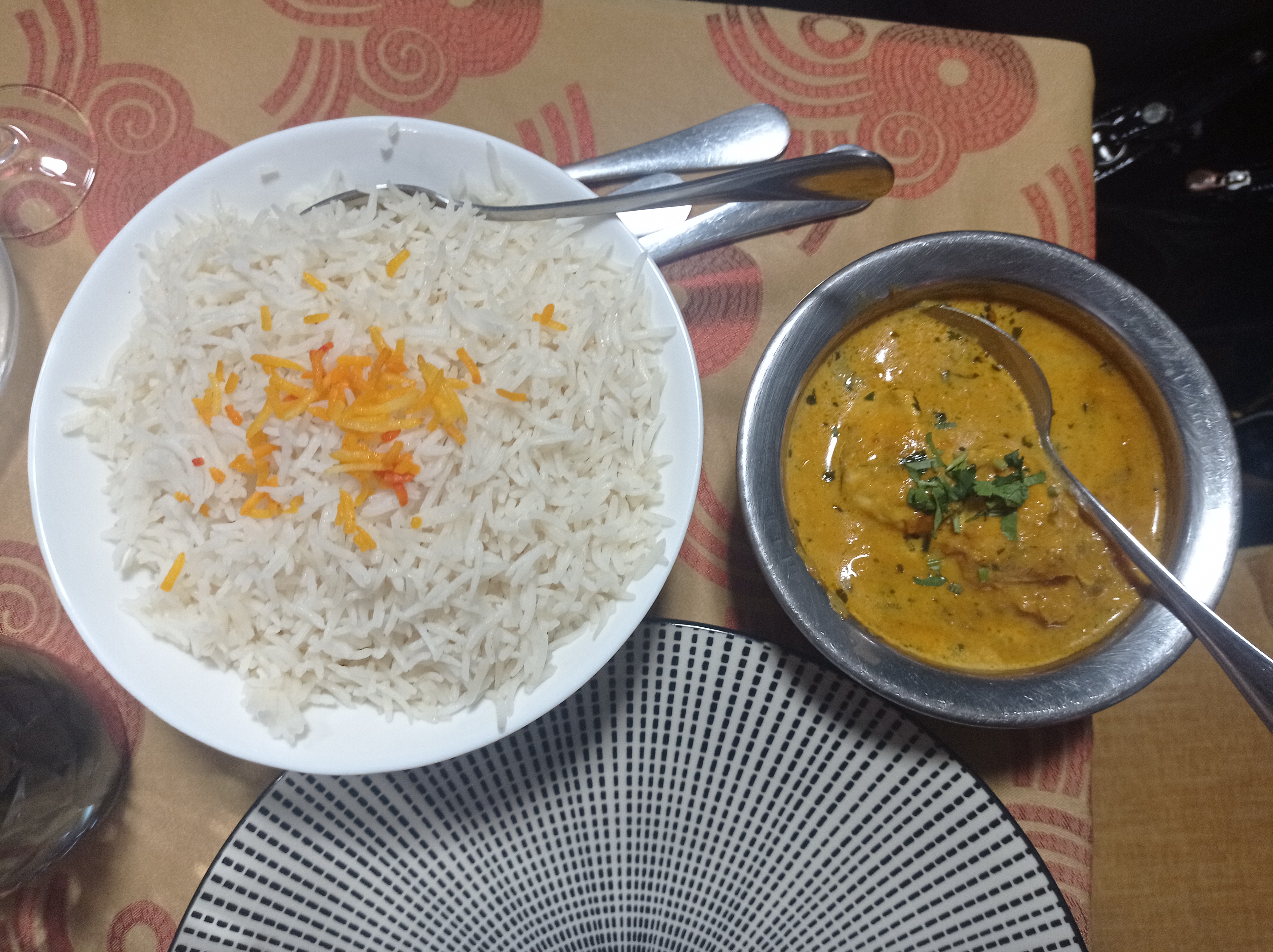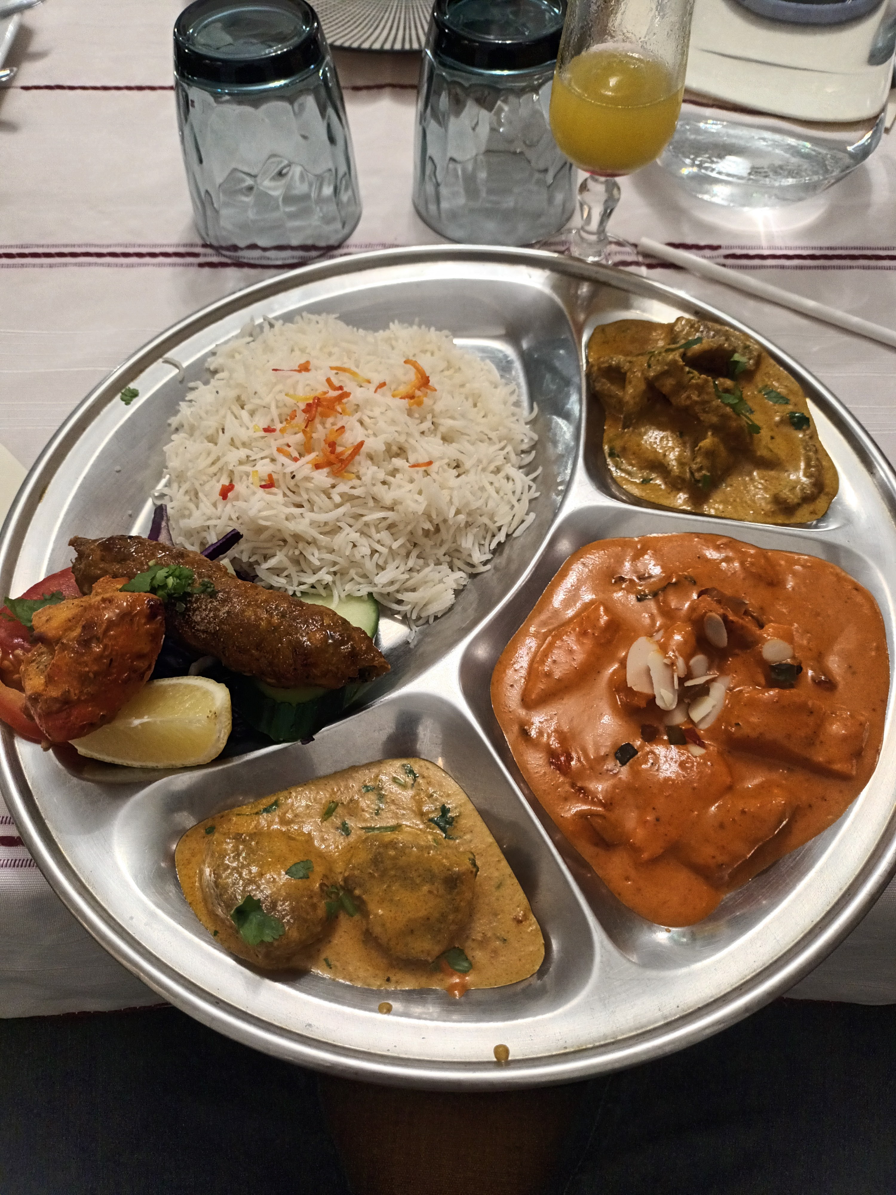 Menu sympa, c est assez bon et les naans au fromage a l ail une tuerie mais accueil froid, le serveur a pris mon cocktail avant que je n ai eu le temps de le terminer, il nous interrompt souvent pour débarrasser alors qu' on mange encore nos plats, faut travailler la dessus.