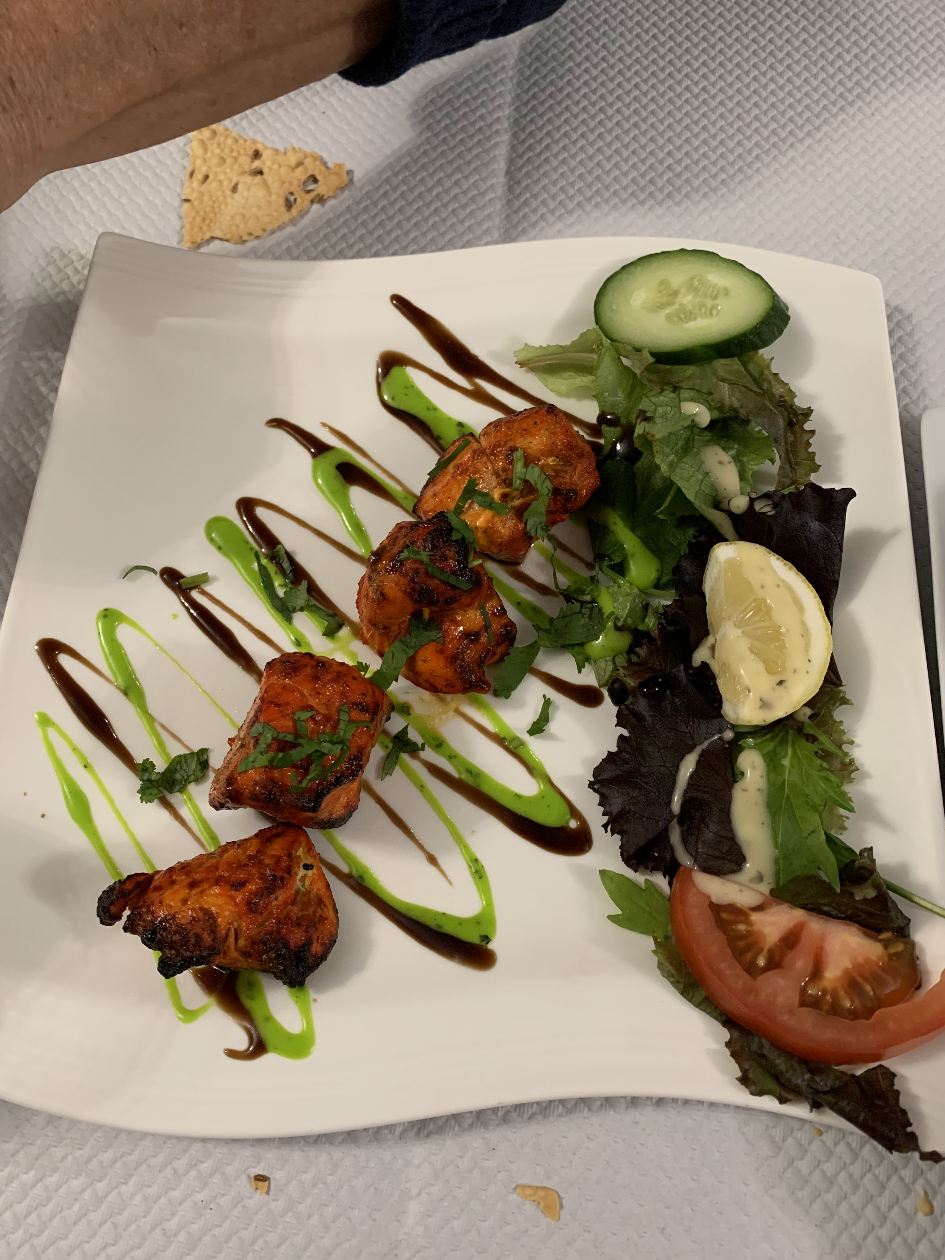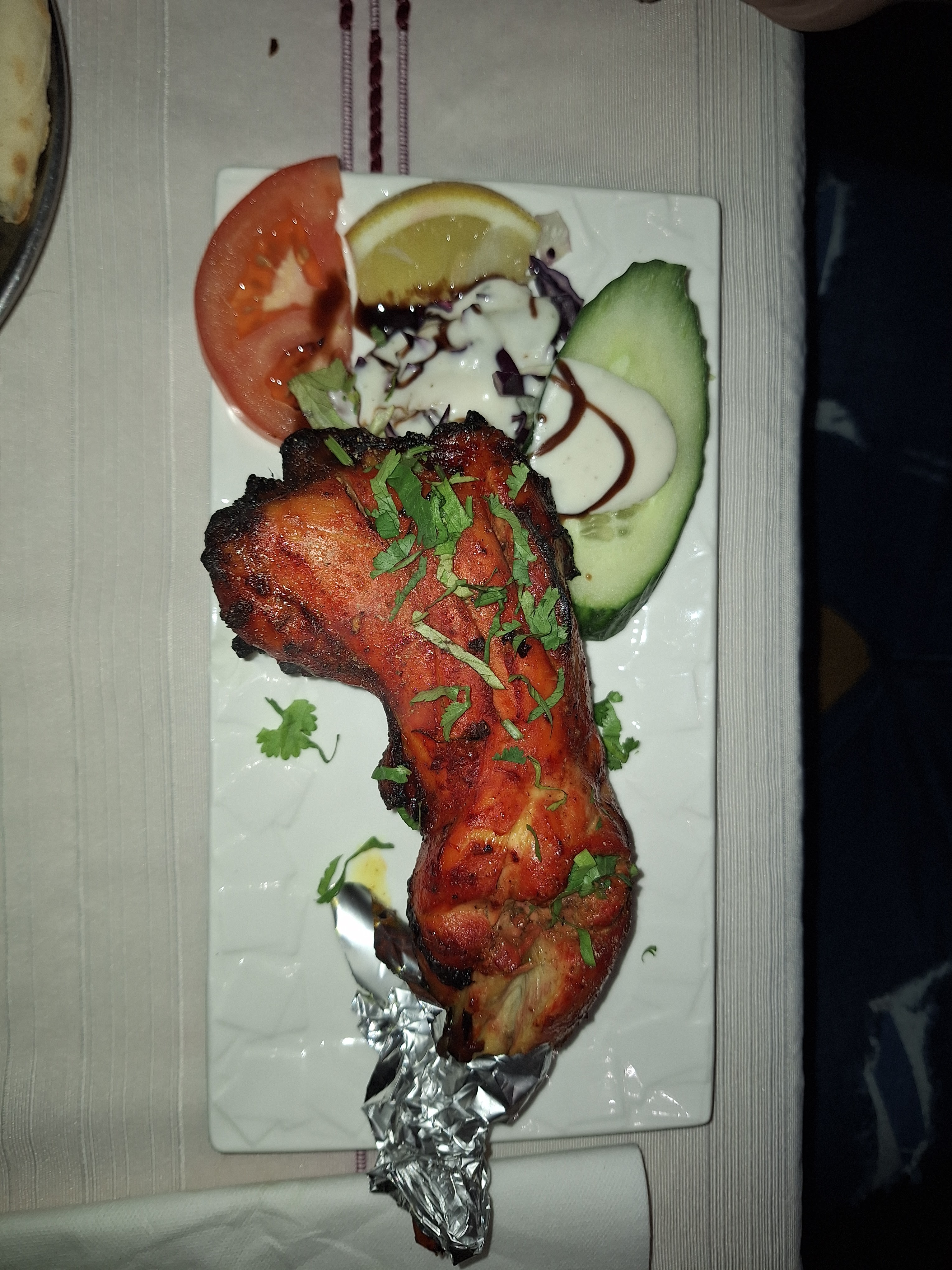 Produit frais et raffiné dans le goût des épices Un bon butter chicken et un poulet tika excellent Sans oublier le pain à l’ail Un restaurant indien recommandé