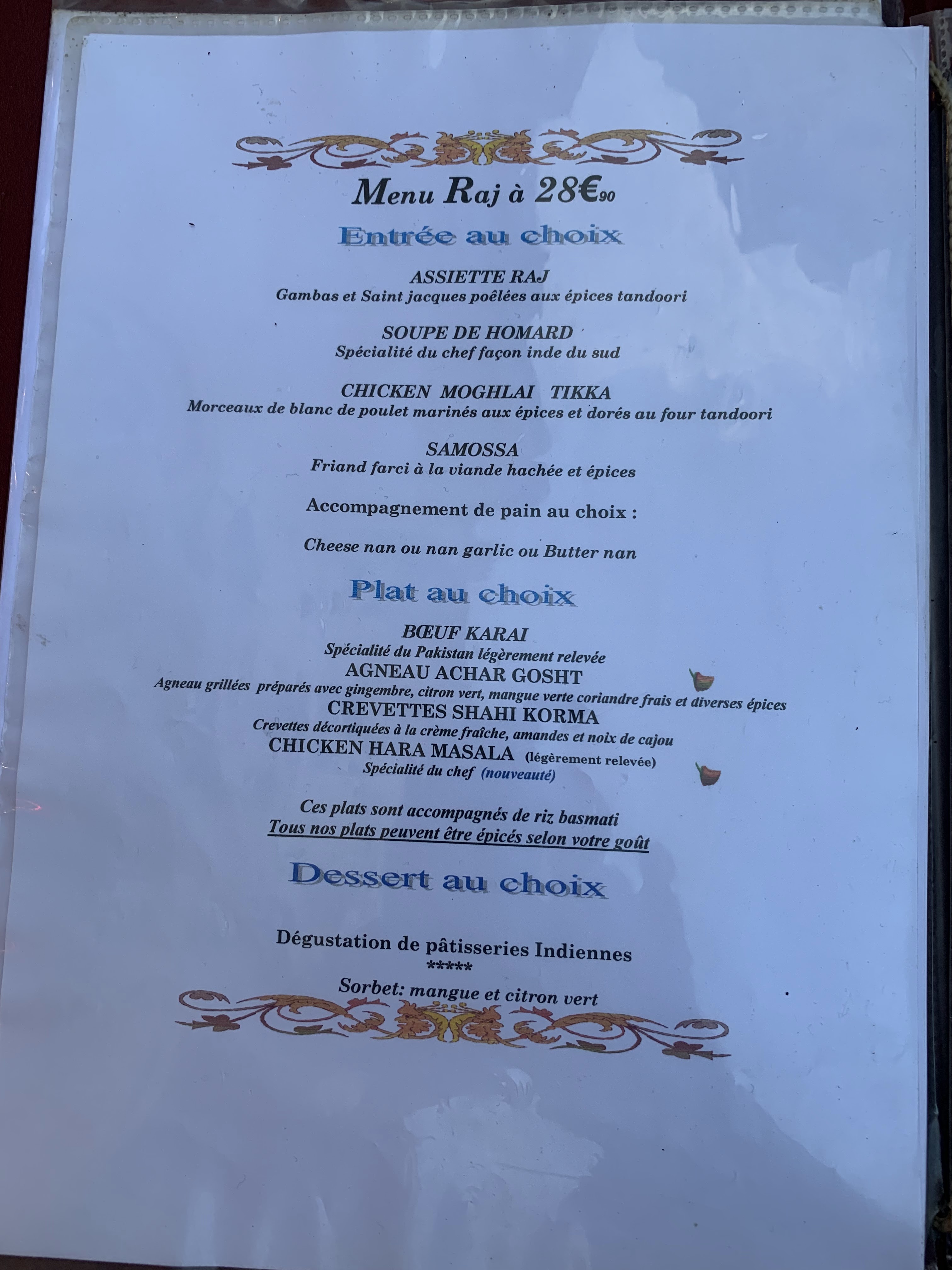 Super restaurant. Le décor typique de l inde et acceuil chaleur et la gentillesse du personnel. Le repas était très bon. Le prix est très correct. Les proportions des plats sont largement suffisantes, nous avons pas pu finir. J y retournerait sans hésiter.
