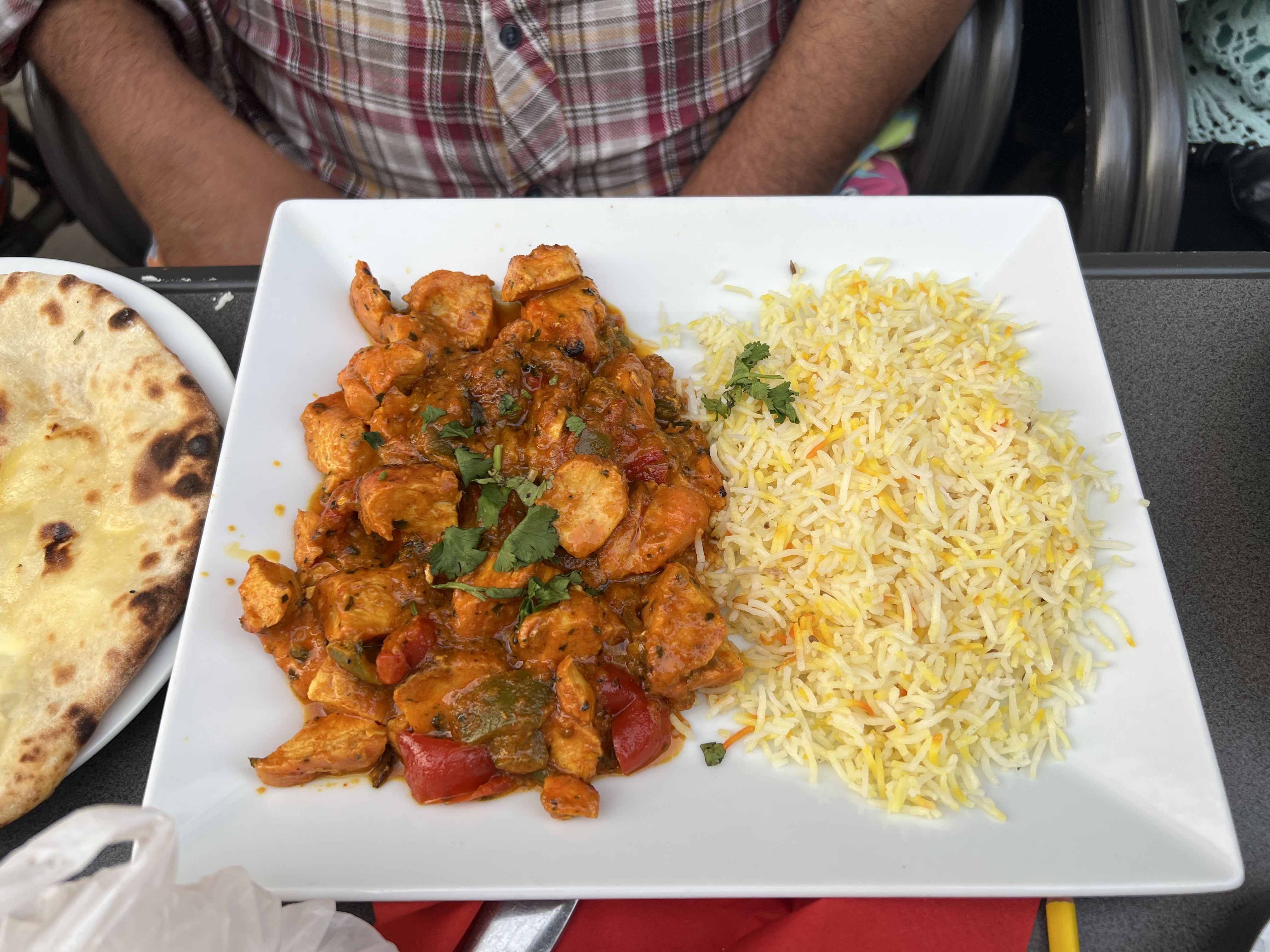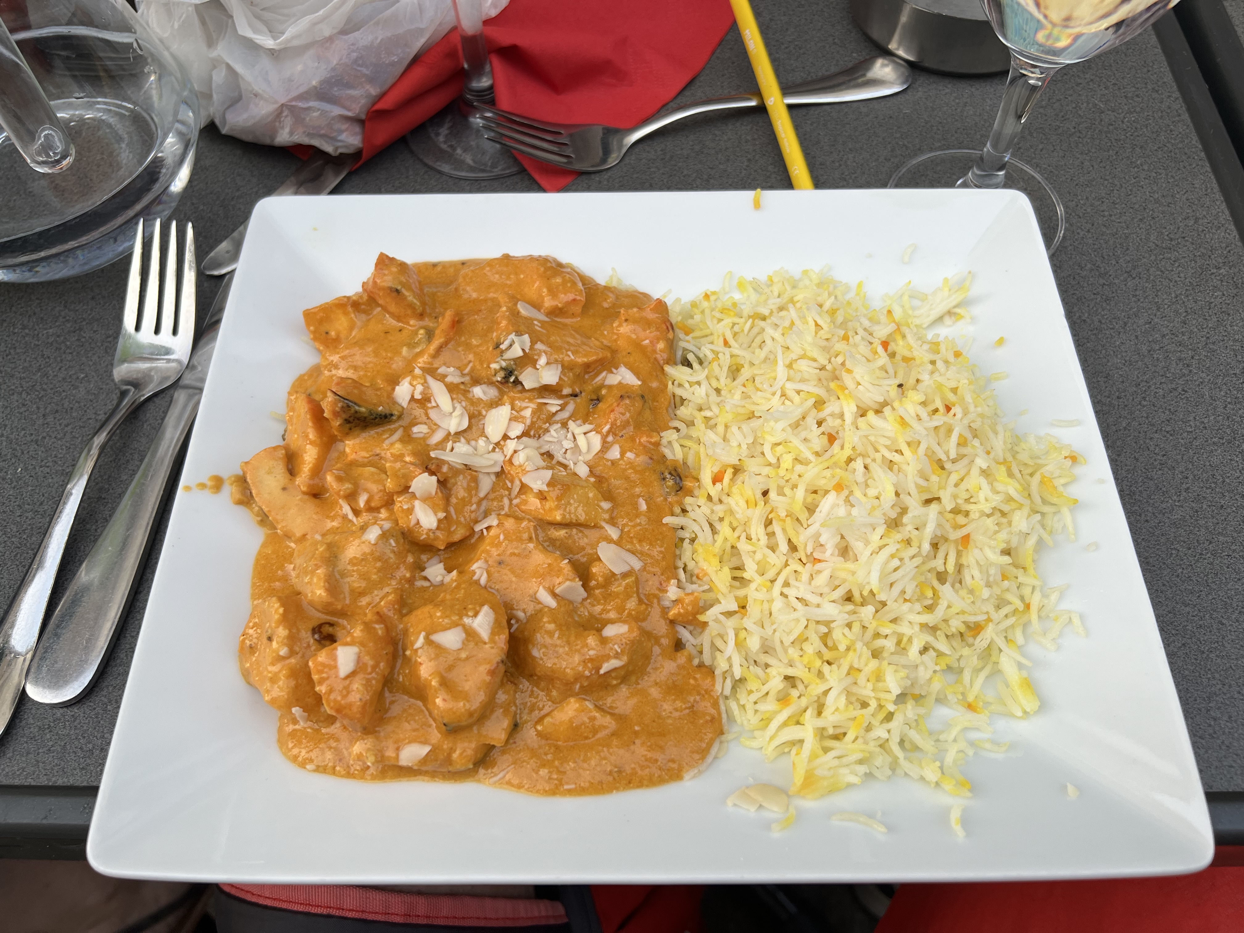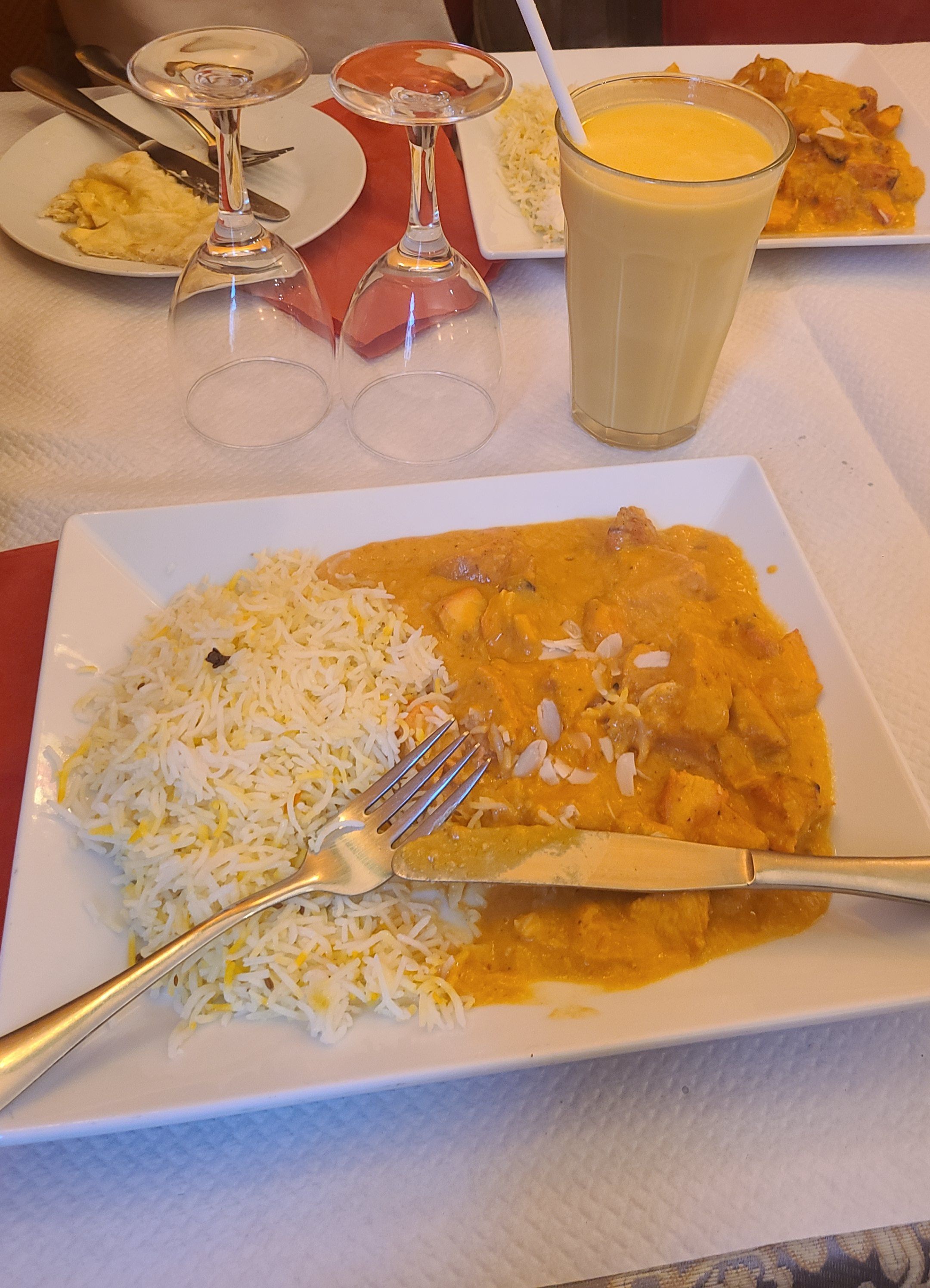 Pas tout à fait ce que les Britanniques attendraient d'un restaurant indien. Pas de poppadoms proposés et la nourriture était prête avec du riz. Pas particulièrement épicé (même si on s'y attendait) mais tout de même savoureux. Assez diverti en regardant le personnel préparer puis manger son propre dîner - un poulet rôti entier, une salade et un lassi (vous pouvez voir directement dans la cuisine, le serveur assis sur les surfaces de préparation des aliments était un moment fort !) Dans l'ensemble, ce n'est pas le pire repas que nous ayons jamais eu mais un peu décevant.